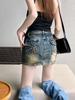 Saia Jeans Bordada Azul Vintage Estilo Americano Verão Feminina Cintura Alta Ajustada Emagrecedora Linha A Quadril Saia Curta