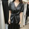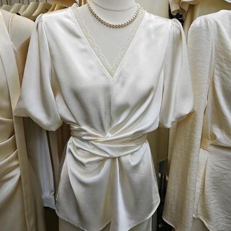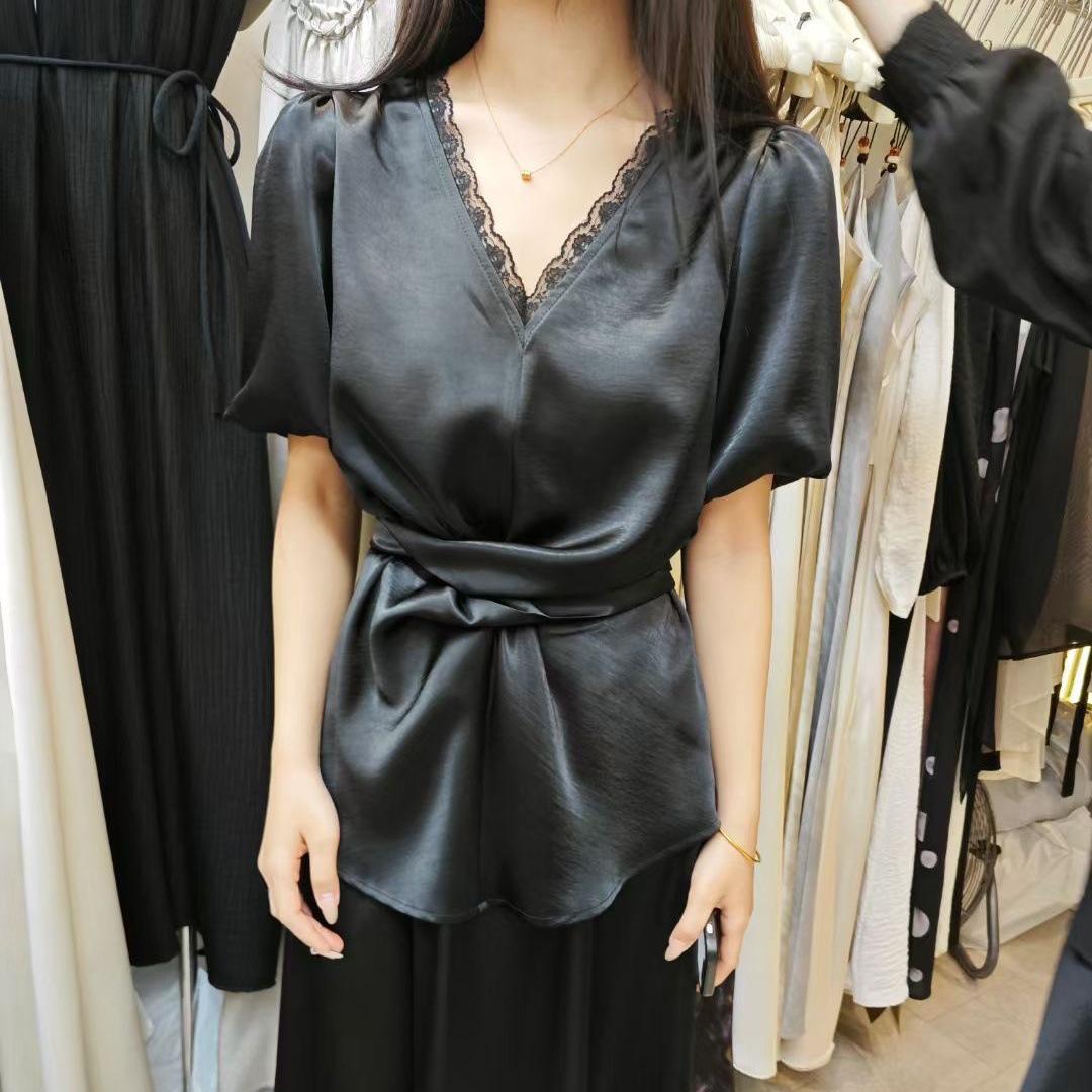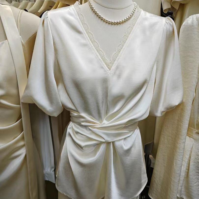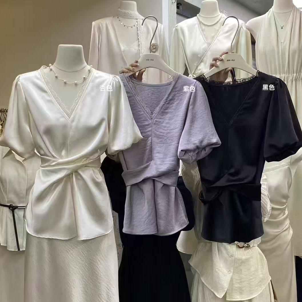 Design Sense Nicho Decote V Camisa Cruzada Feminina 2025 Verão Novo Estilo Francês Elegante Cadarço Cintura Modeladora Top