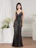 Novo Europeu e Americano Verão Cor Pura Paetê Alça Fina Decote V Sem Costas Elegante Slim Pequena Cauda Longo Vestido de Festa de Banquete