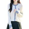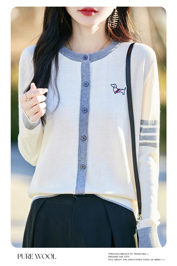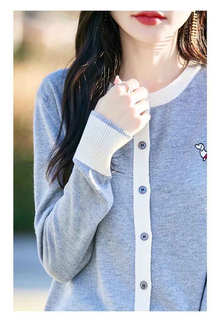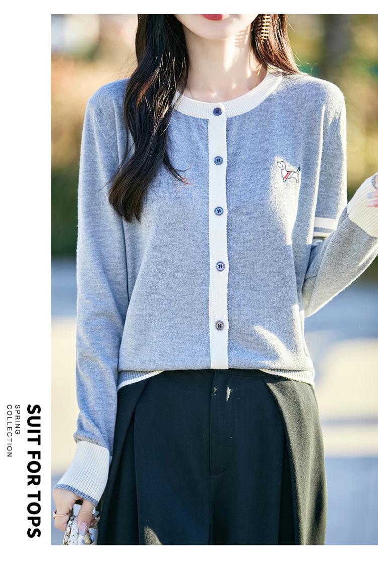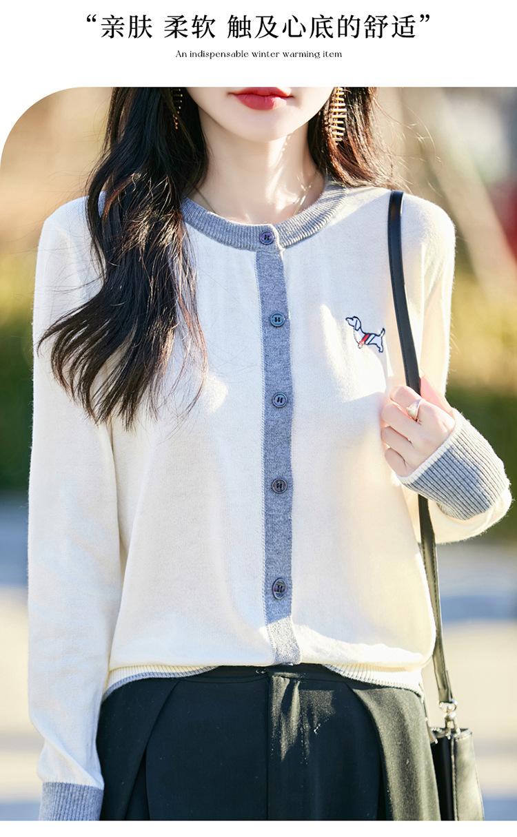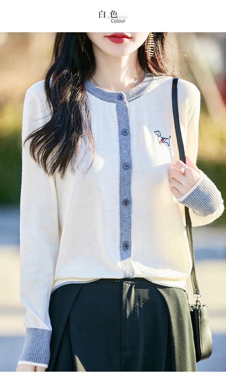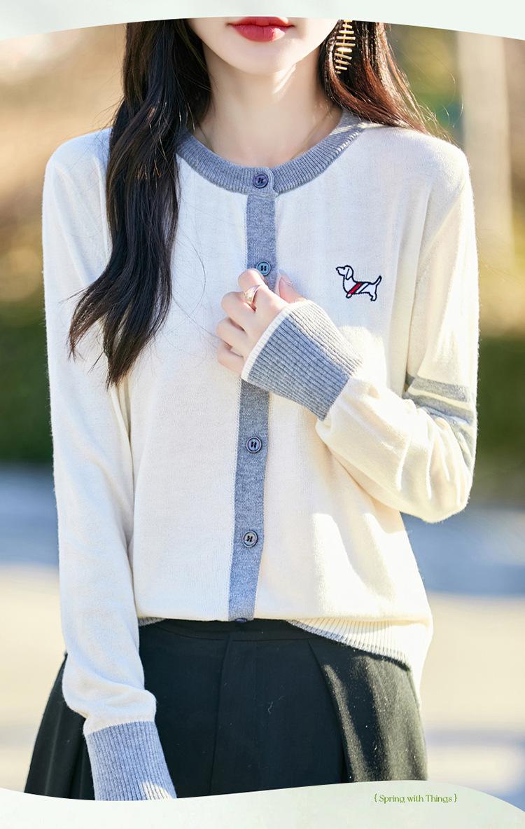 Novo Casaco Tricotado de Lã Penteada com Gola Careca e Cardigã Combinando Cores com Bordado de Cachorrinho Solto para Mulheres Primavera e Verão 2025