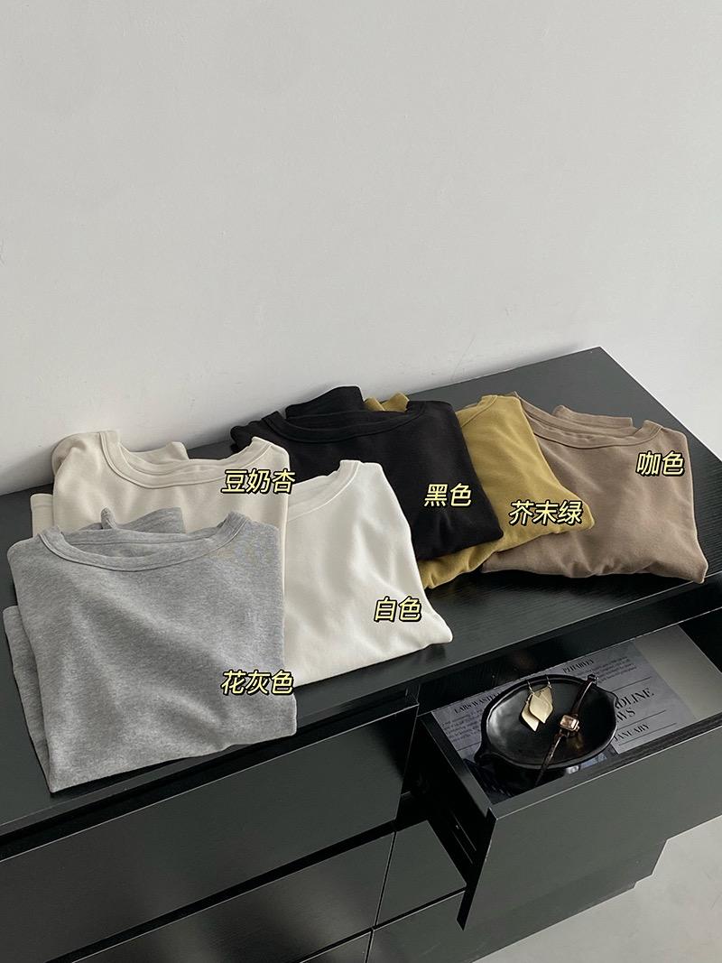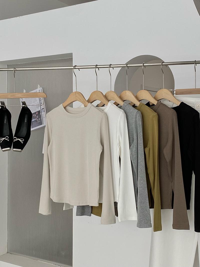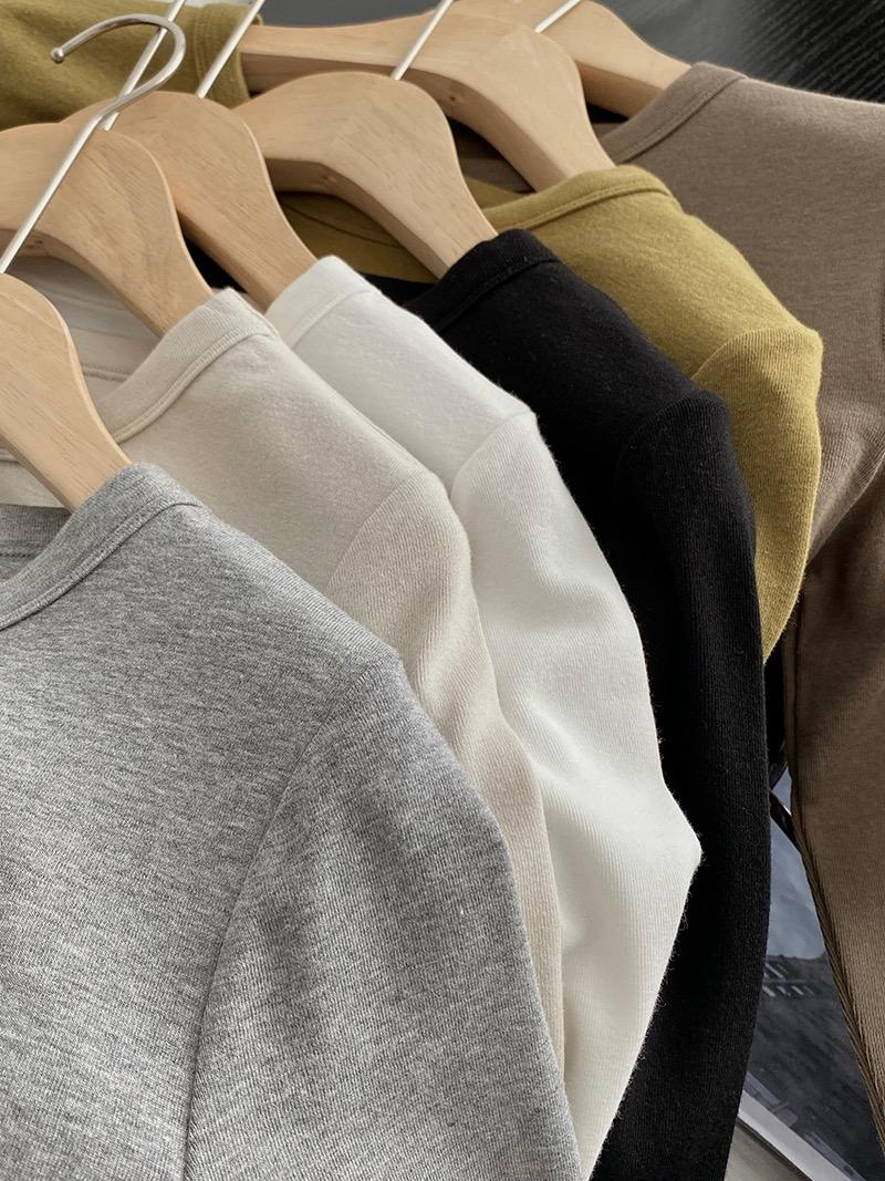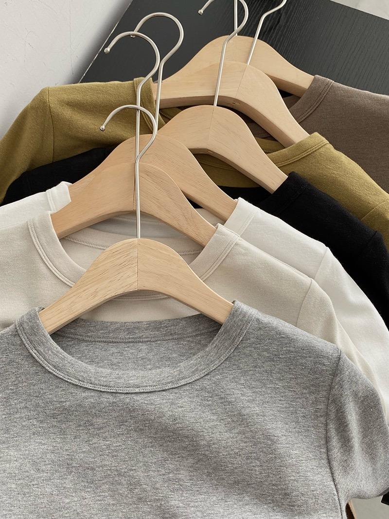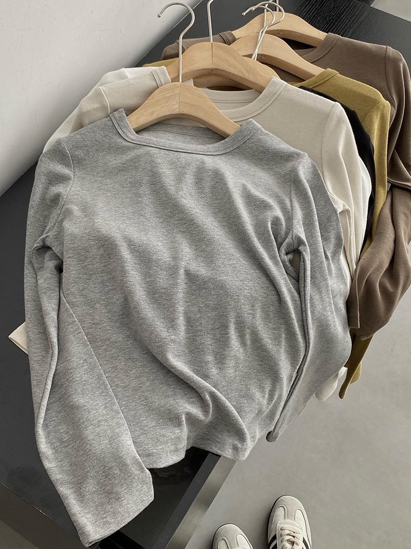 2025 Início do Outono Novo Estilo Coreano Ombro Reto Alta Elasticidade Emagrecimento Versátil Camiseta Gola Redonda Camiseta Base Cor Sólida Tom Terroso