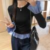 Camiseta Feminina de Manga Comprida com Costura em Cor Contrastante Falsa Duas Peças Primavera e Outono Ajustada Emagrecimento Chic Camiseta Básica Ninho Design Sensação Top