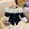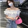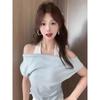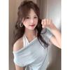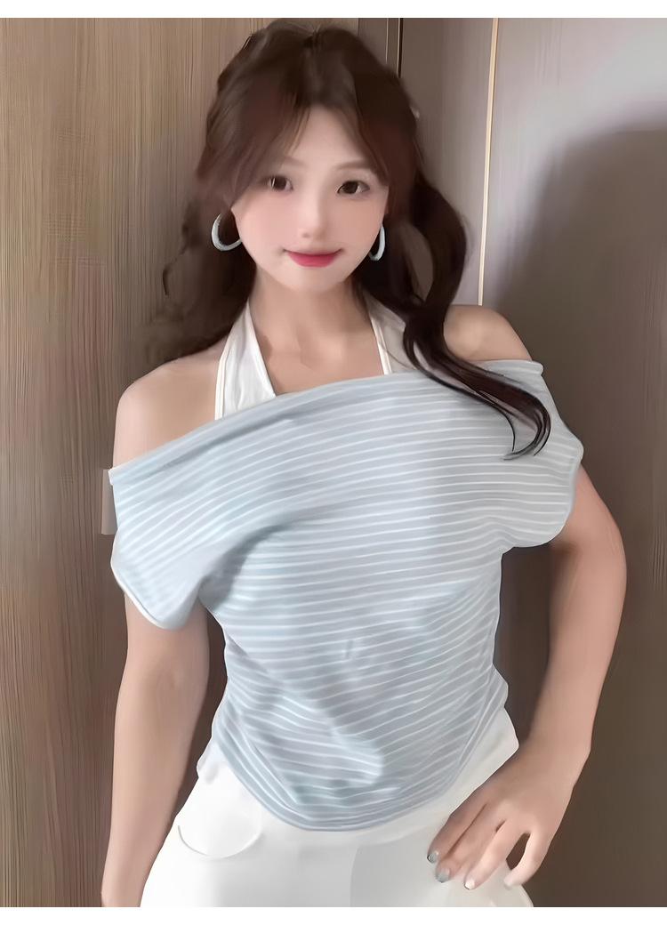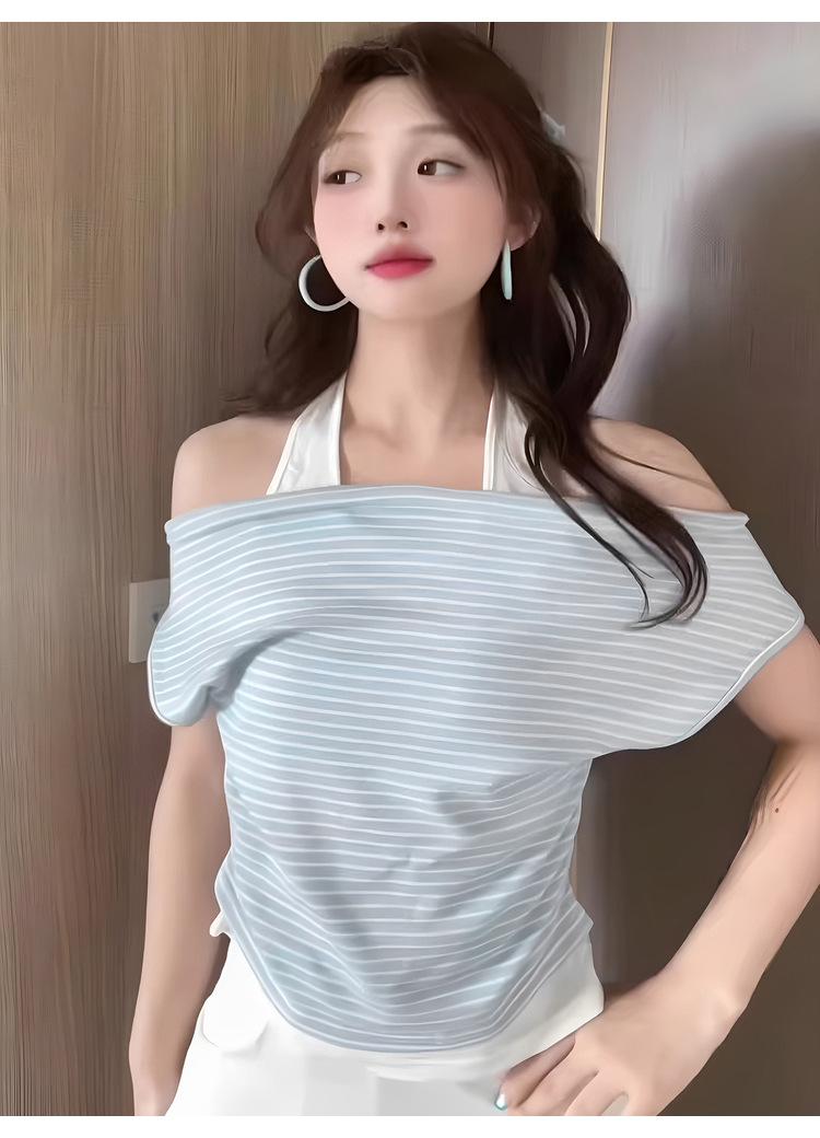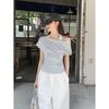 Design de Nicho Ombro a Ombro Listrado Falso Duas Peças Camiseta Feminina Verão Ajustada Franzida Manga Curta Gola Canoa Top Base