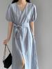 Vestido Jiangzuo Estilo Francês Decote V com Amarração na Cintura Emagrecimento para Mulheres, Novo Verão Manga Curta Elegante Linha A Vestido Longo 1562