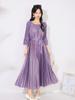Vestido Plissado Miyake Cor Sólida com Costura Dourada, Mangas Compridas, Decote Redondo, Mangas Três Quartos, Vestido Plissado Solto com Bainha Larga para Mulheres