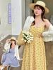 Vestido Estilo Férias Lace-up Alça vestido Feminino Verão Solto Emagrecimento Saia A-line Saia Midi Azul para o Verão