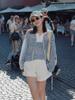 Camiseta de Manga Longa com Listras Protetora do Sol Estilo Coreano para Mulheres, Cobertura Fina de Verão, Blusa Solta Emagrecedora