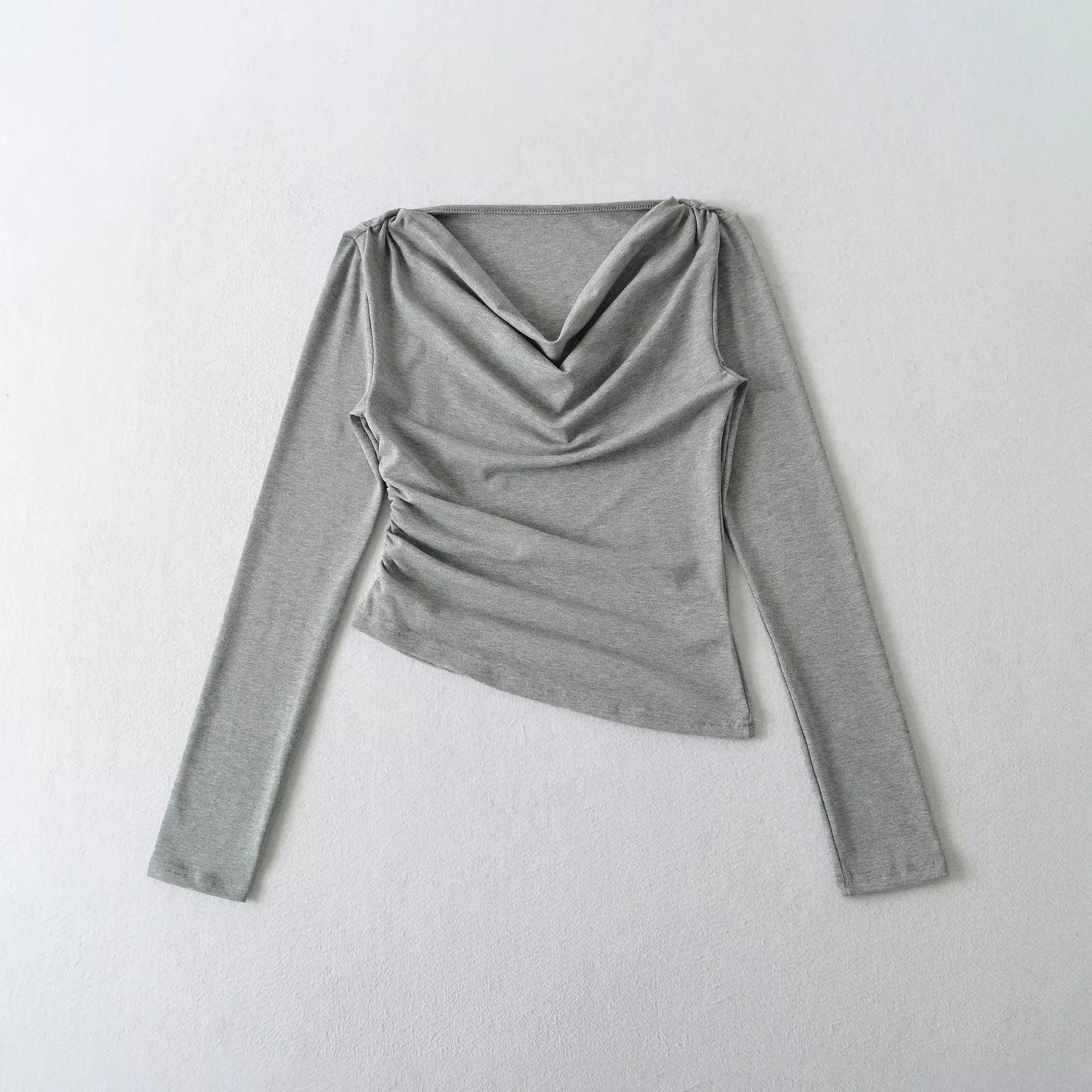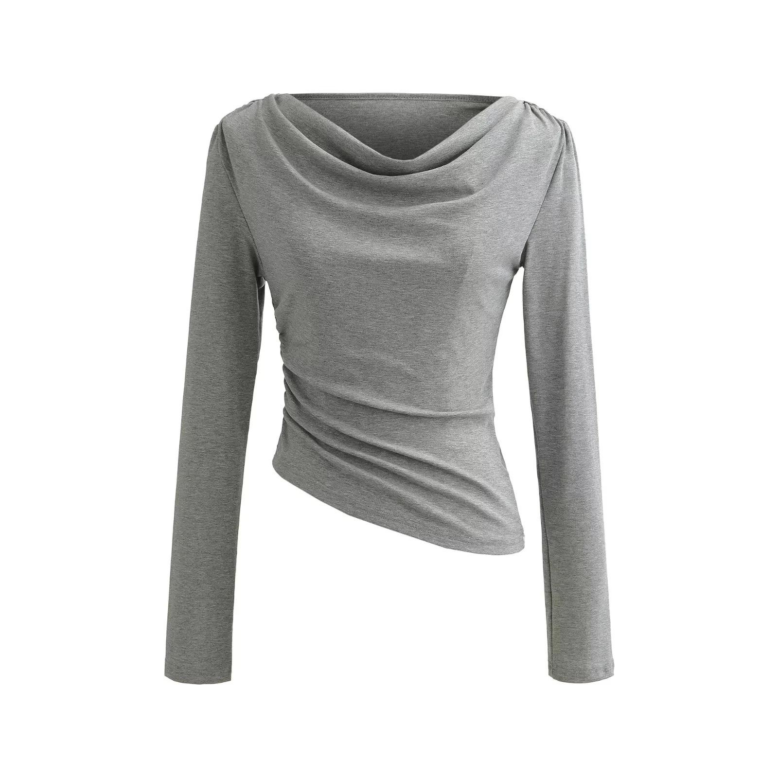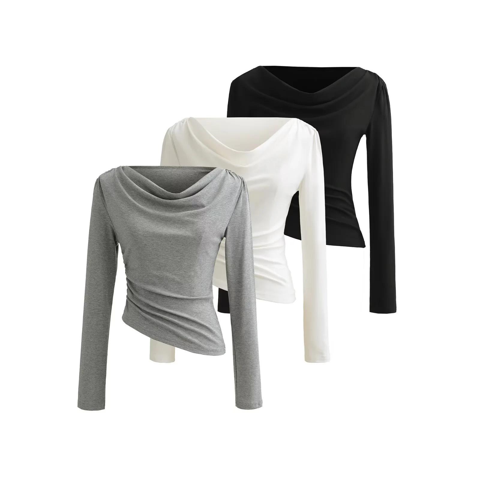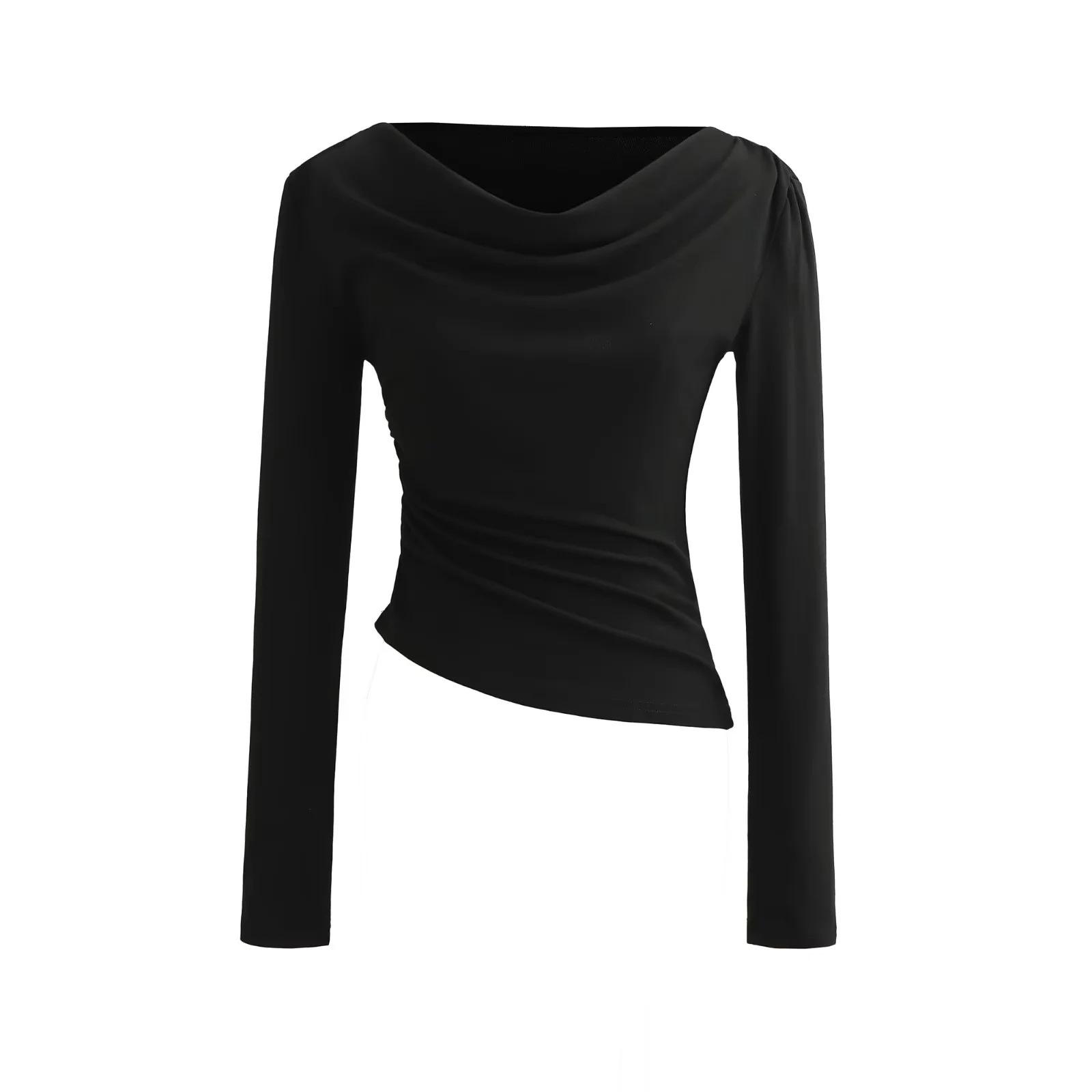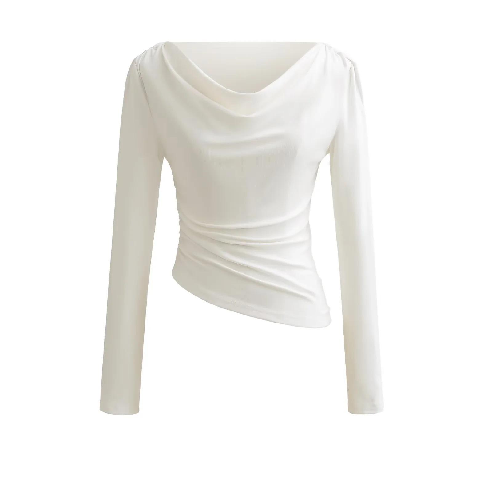 Camiseta feminina outono nova justa com gola drapeada e manga comprida, design moderno, menina quente, desejo puro, ombro de fora, camisa básica para usar por baixo, top