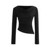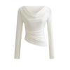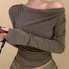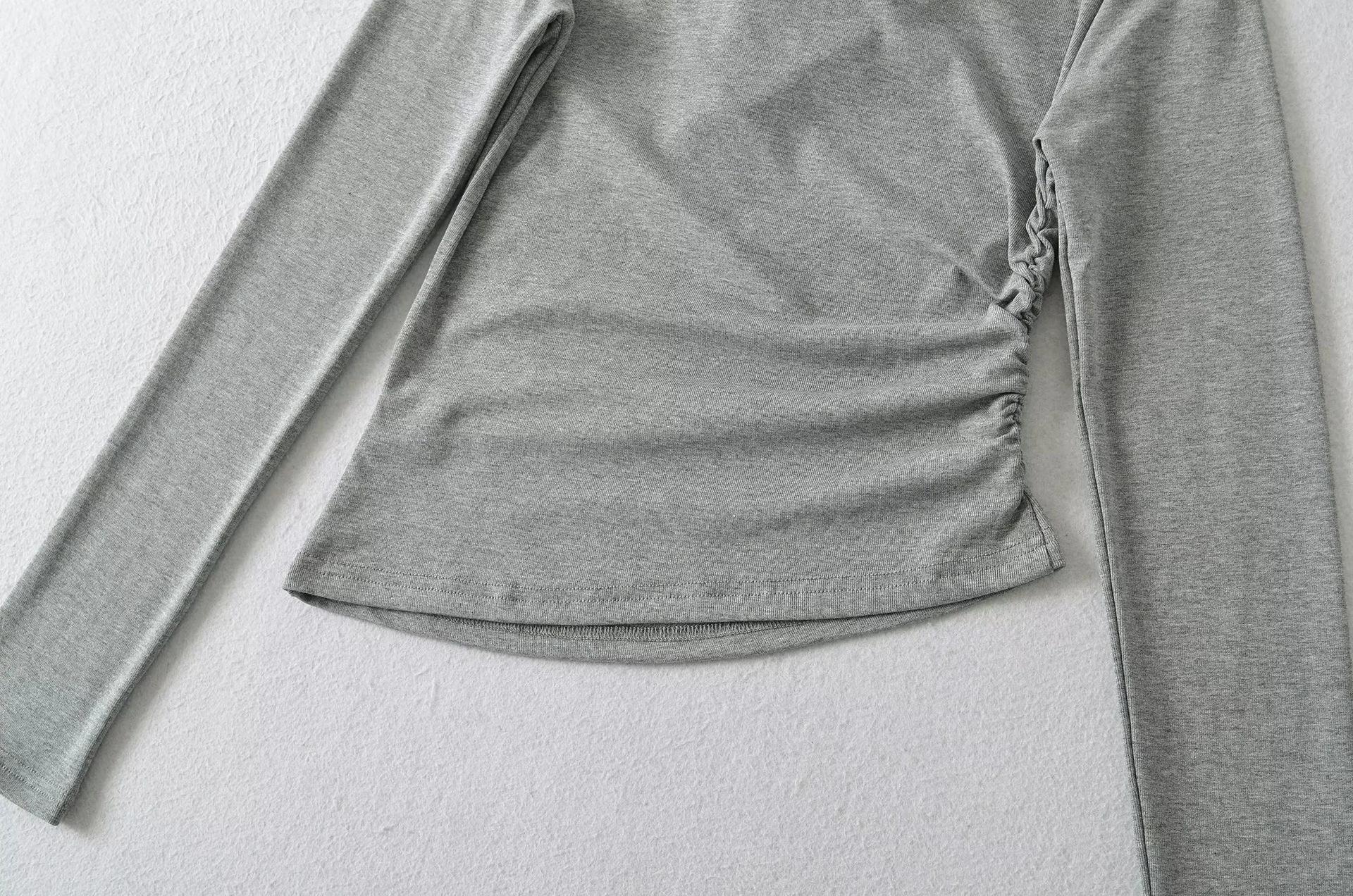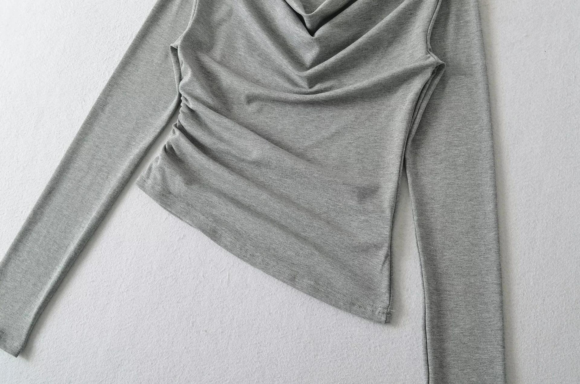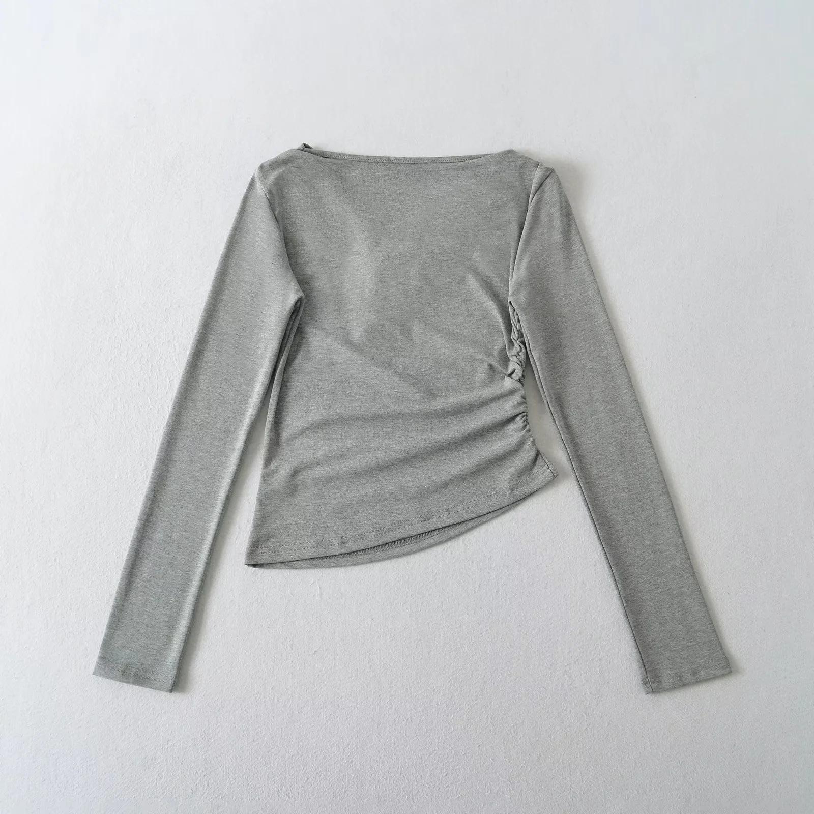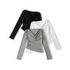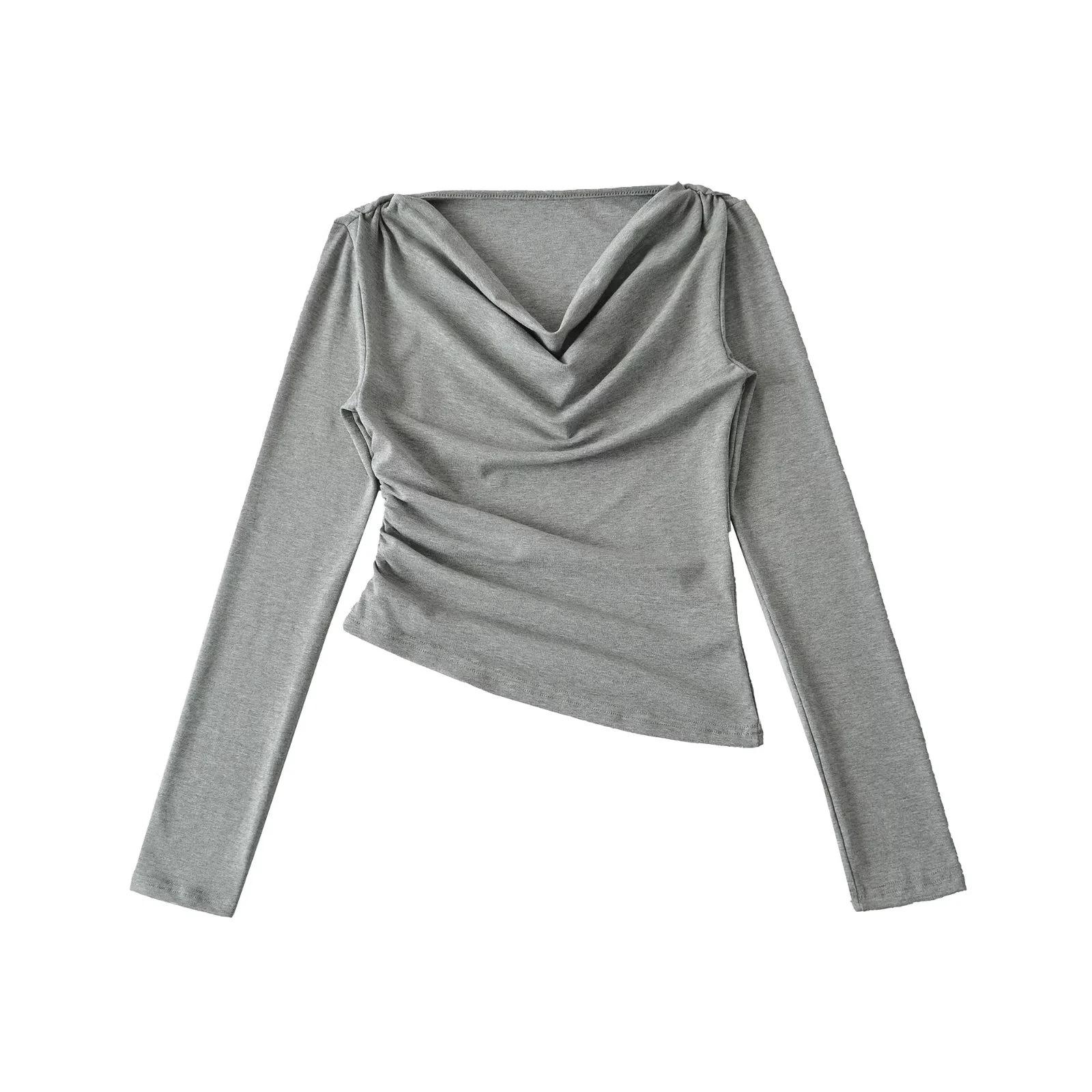 Camiseta feminina outono nova justa com gola drapeada e manga comprida, design moderno, menina quente, desejo puro, ombro de fora, camisa básica para usar por baixo, top