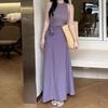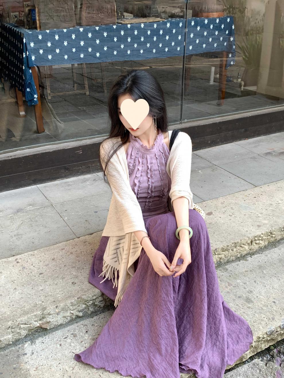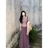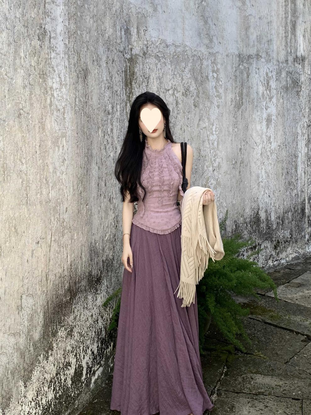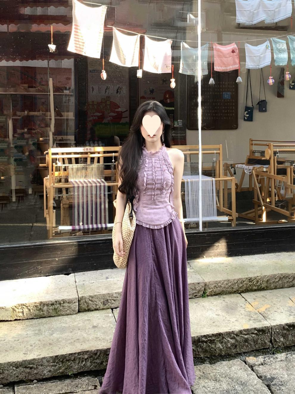 Conjunto Roxo Temperamento Suave Saia 2025 Novo Regata Decote Halter Emagrecimento Saia Midi Duas Peças Mulher