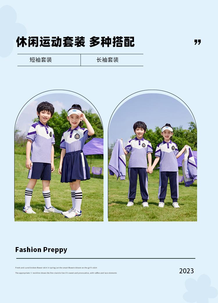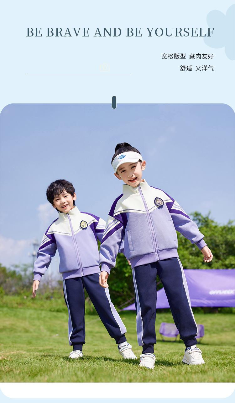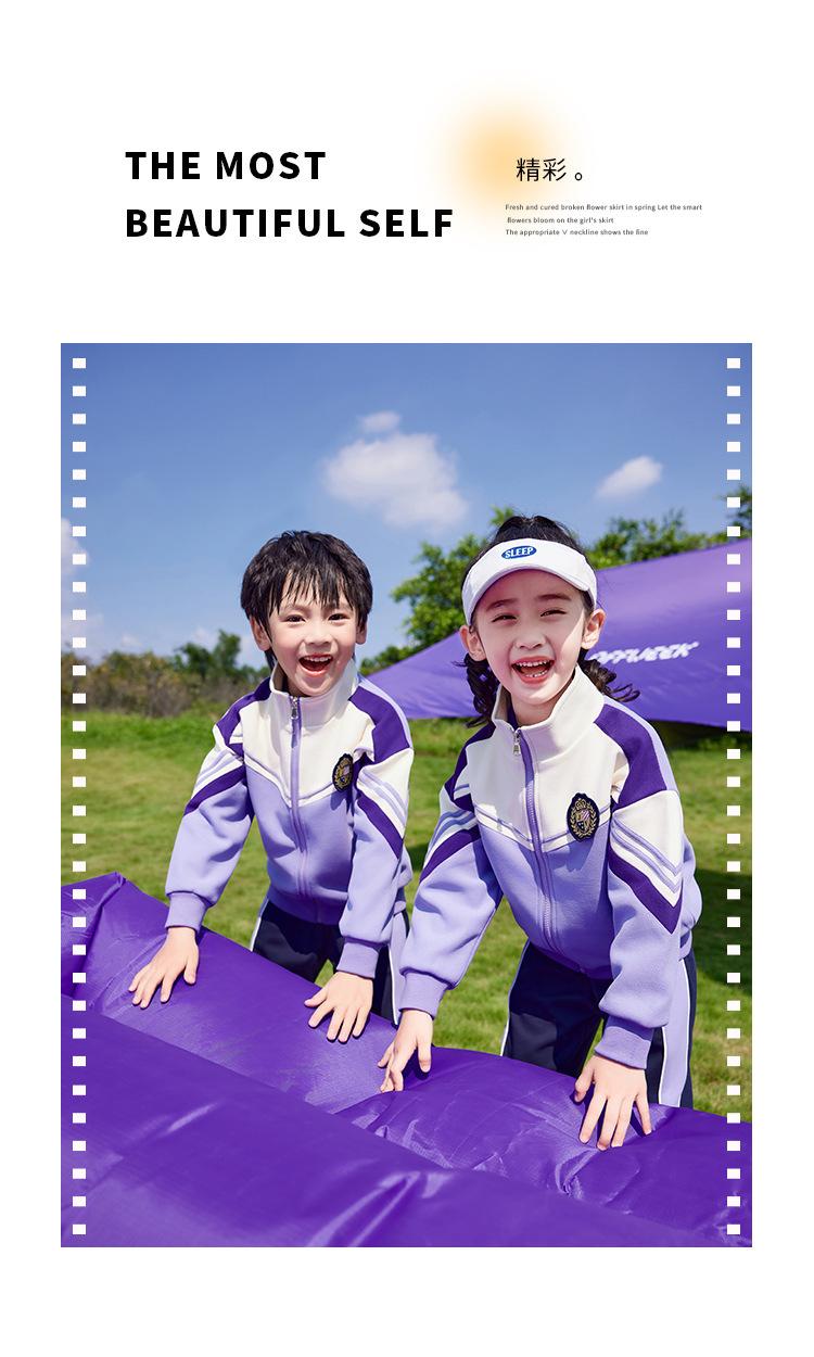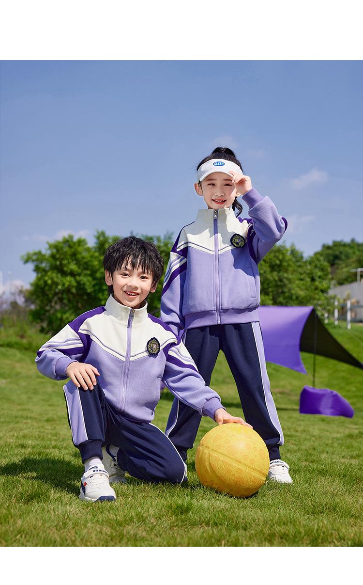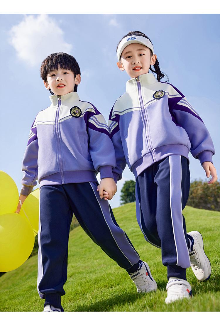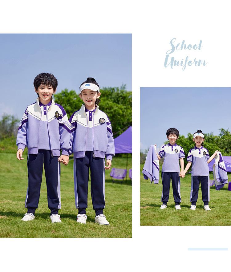 Conjunto de três peças de roupa de jardim de infância primavera, verão e outono Uniforme escolar de primeiro ano do ensino fundamental roupa de classe para aluno do ensino fundamental terno roxo