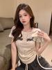 Moda Estilo Europeu e Americano Camisa Feminina de Manga Curta com Três Botões Verão Ajustada Cintura Alta Sexy Umbigo Camisa Curta