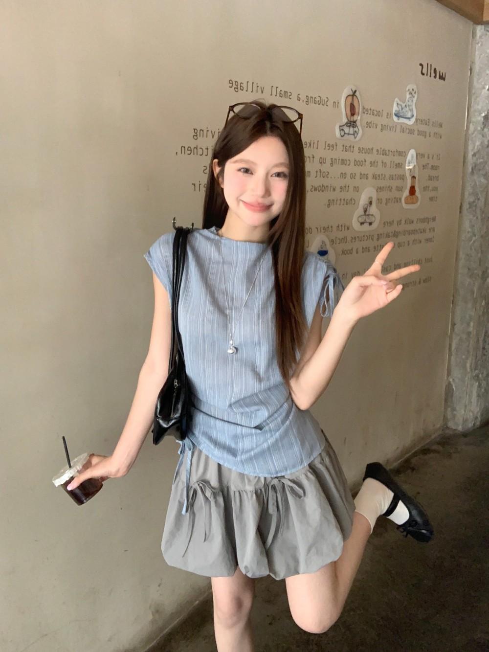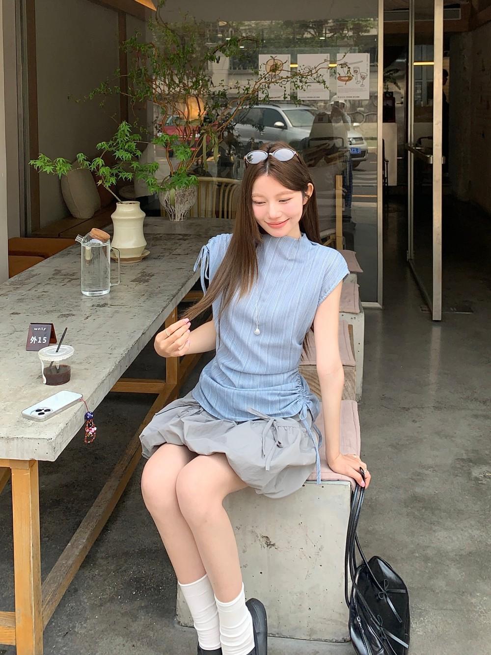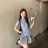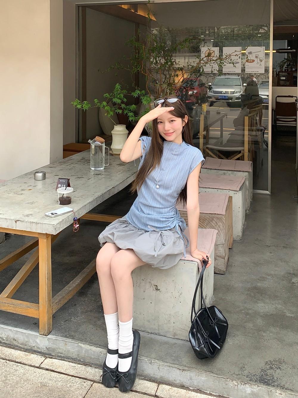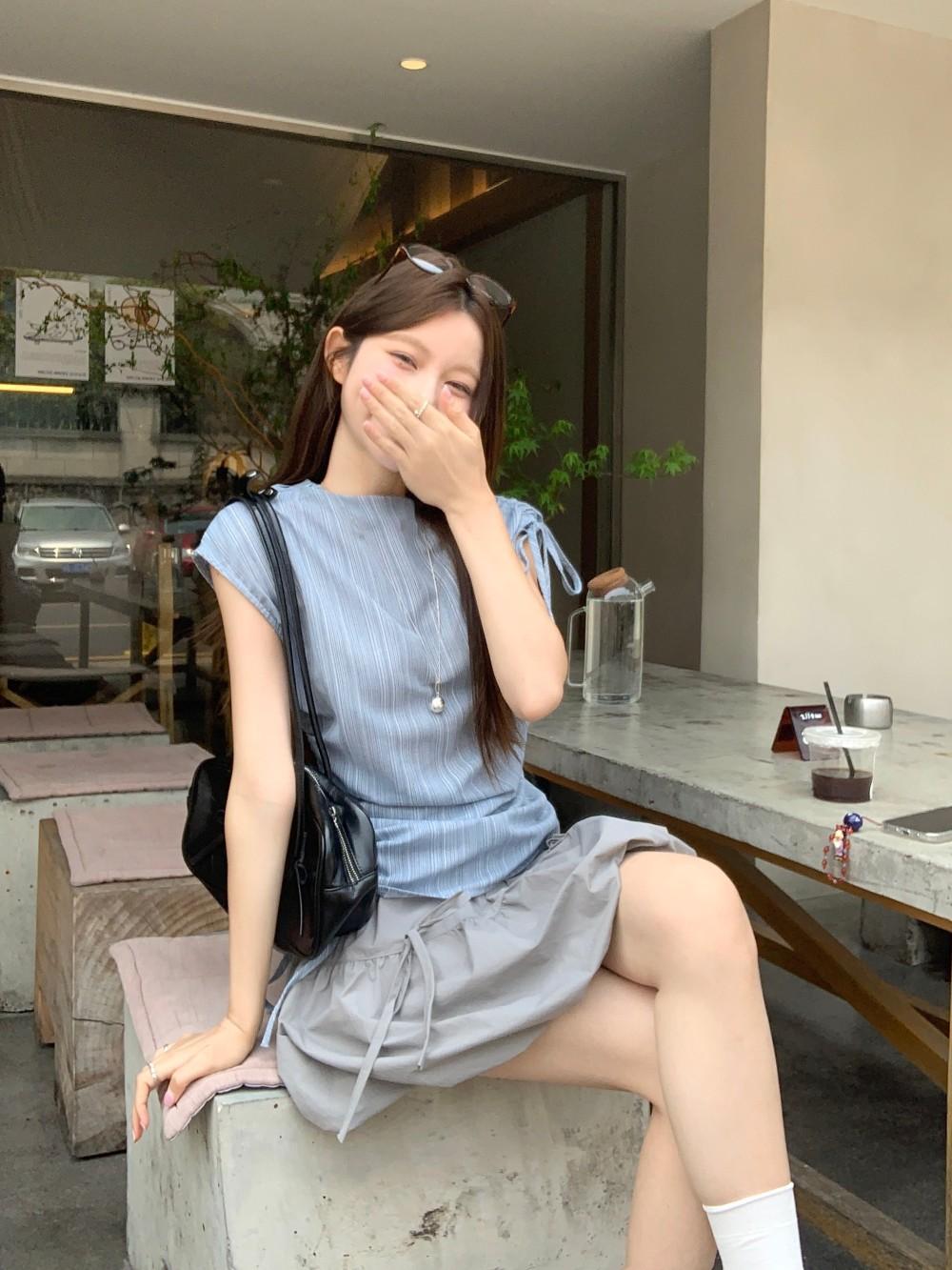 Foto Real de Conjunto Doce para Mulheres, Top Azul Verão Plissado Sem Mangas, Cintura Alta, Saia Botão de Flor, Conjunto de Duas Peças