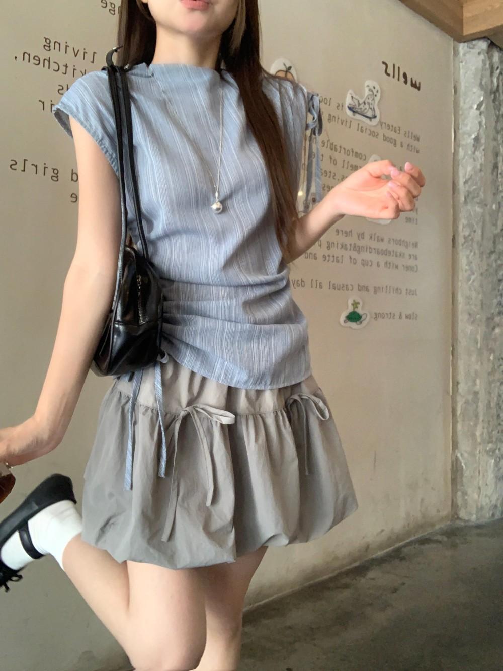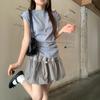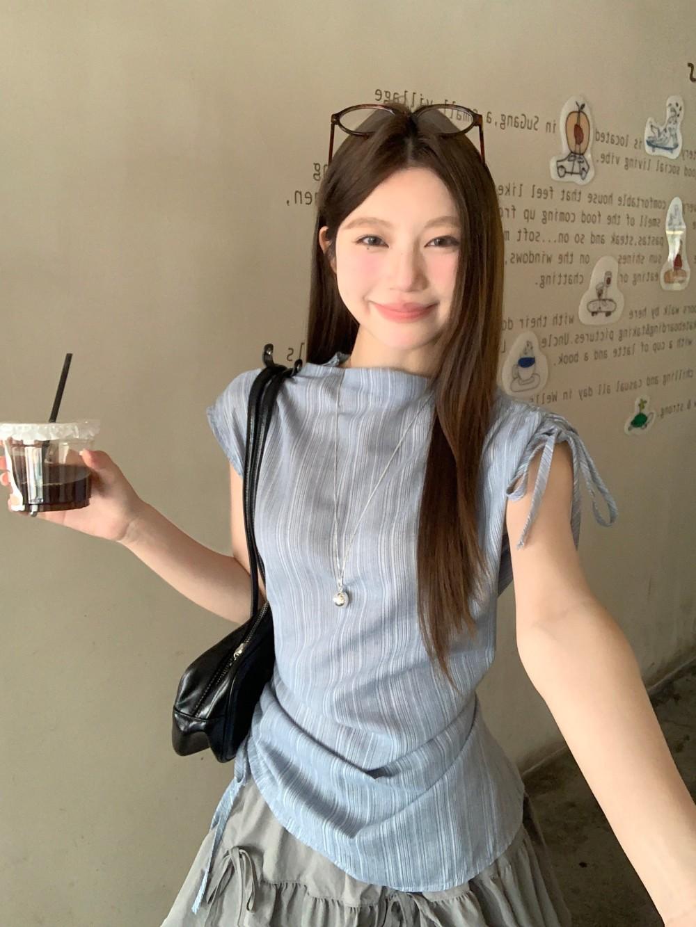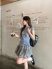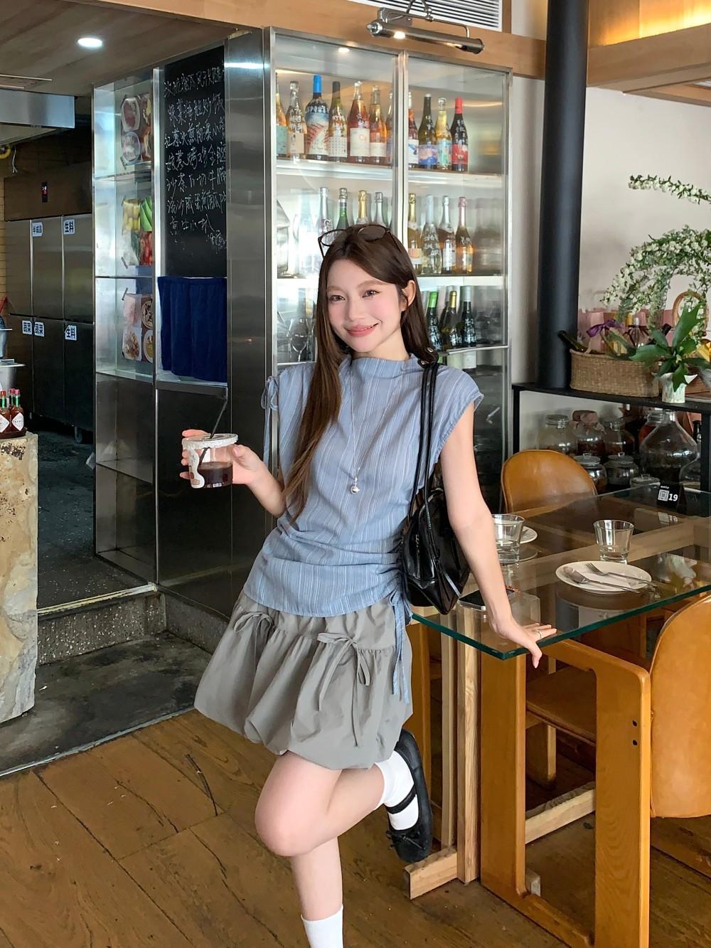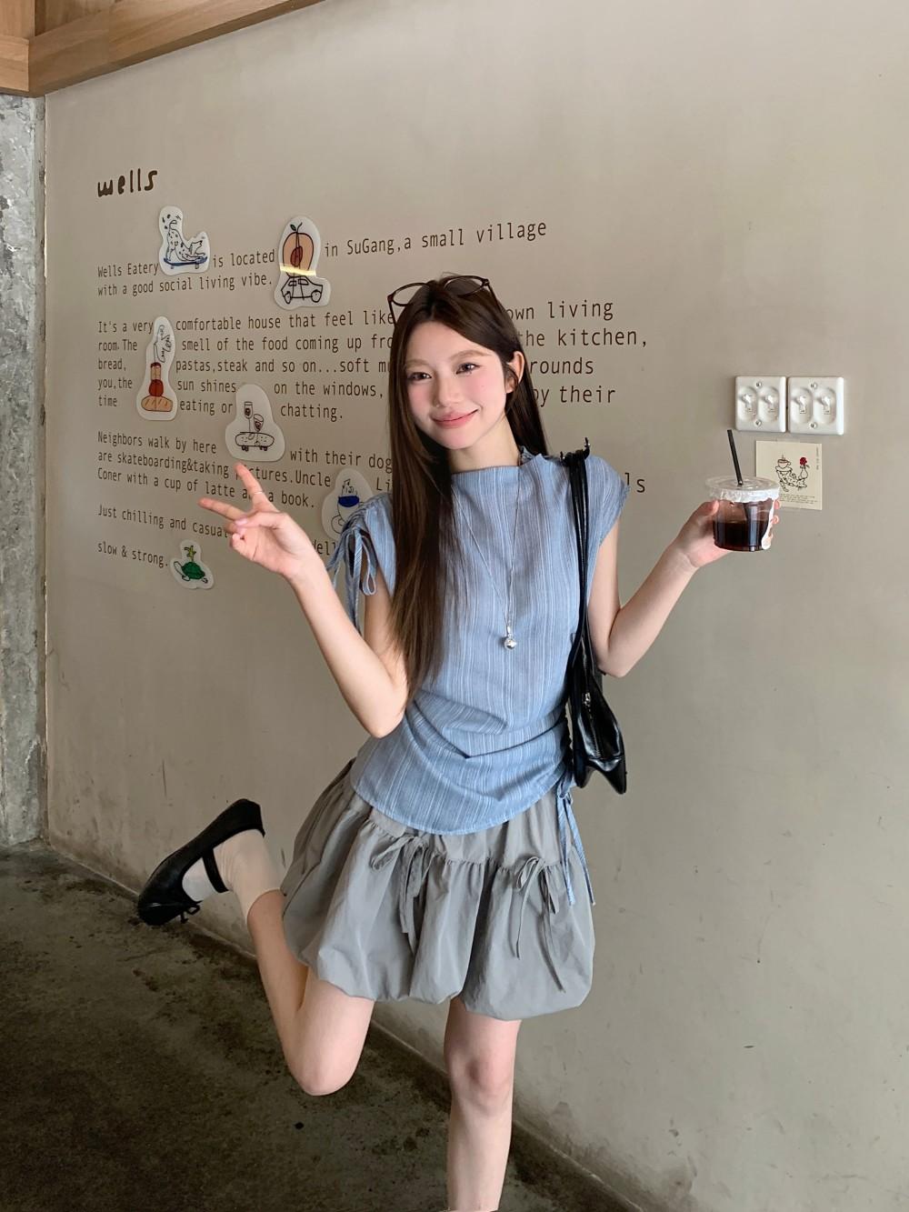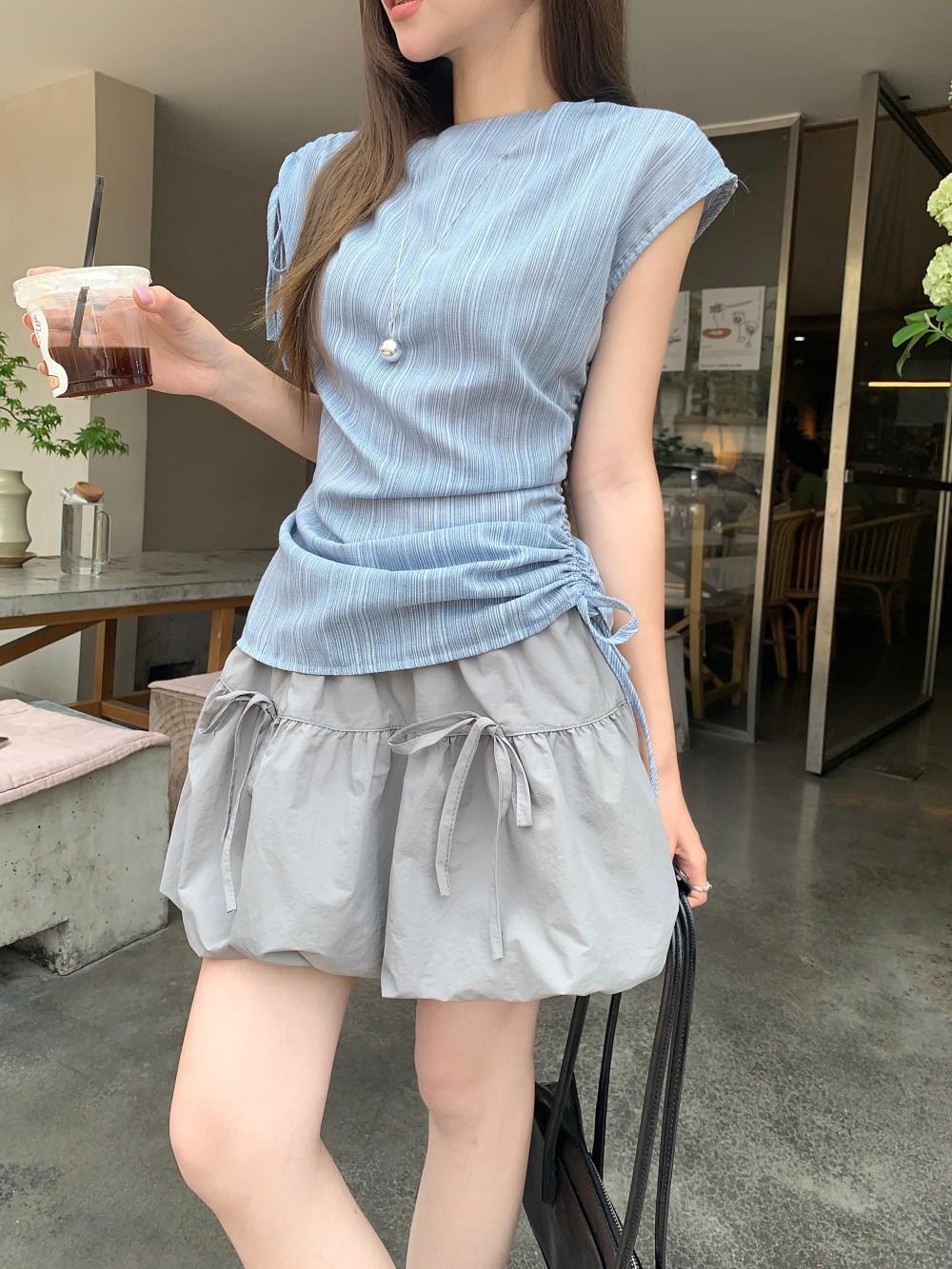 Foto Real de Conjunto Doce para Mulheres, Top Azul Verão Plissado Sem Mangas, Cintura Alta, Saia Botão de Flor, Conjunto de Duas Peças