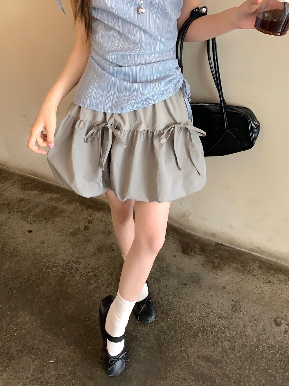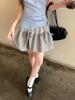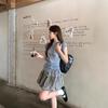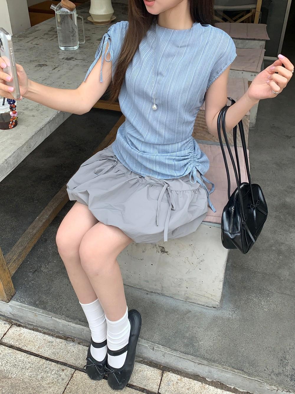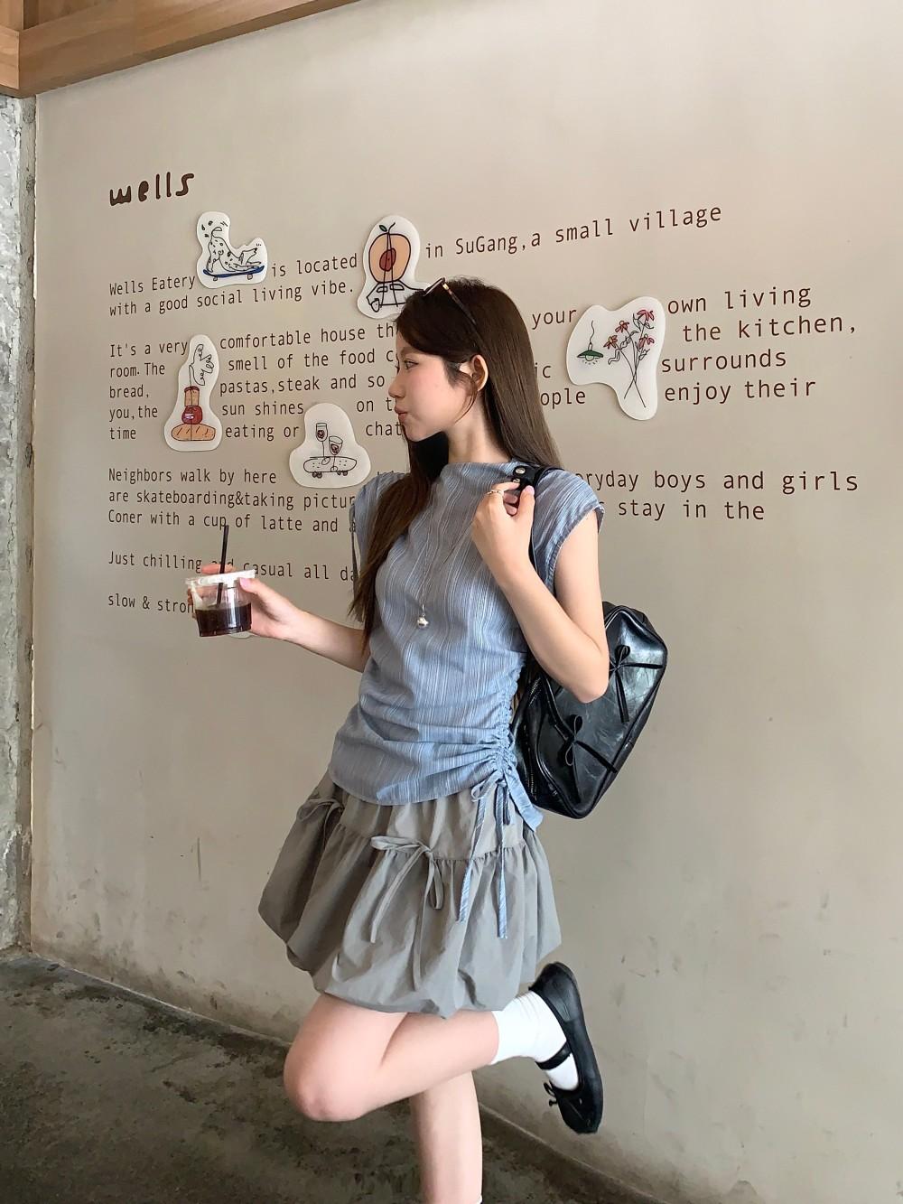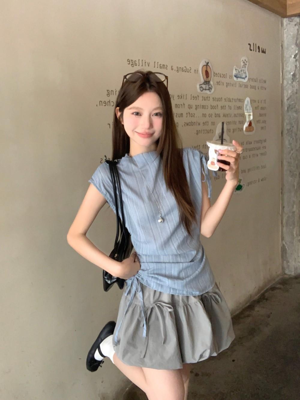 Foto Real de Conjunto Doce para Mulheres, Top Azul Verão Plissado Sem Mangas, Cintura Alta, Saia Botão de Flor, Conjunto de Duas Peças