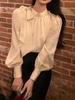 Camisa Branca com Gravata Borboleta para Mulheres, Design de Primavera e Outono, Camisa Acetato Cetim Profissional Nicho Francês, Top Petite