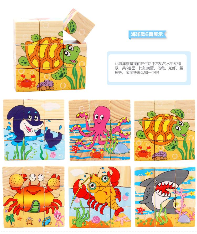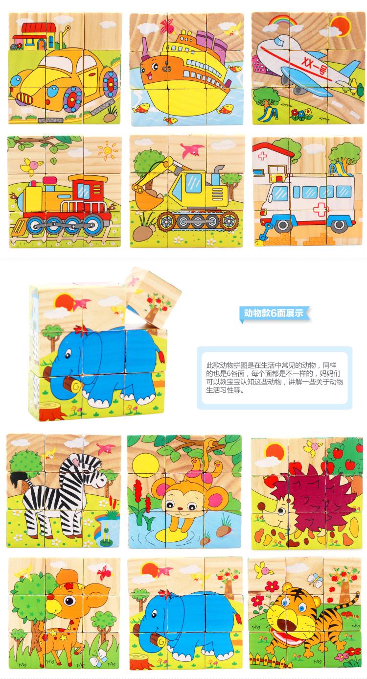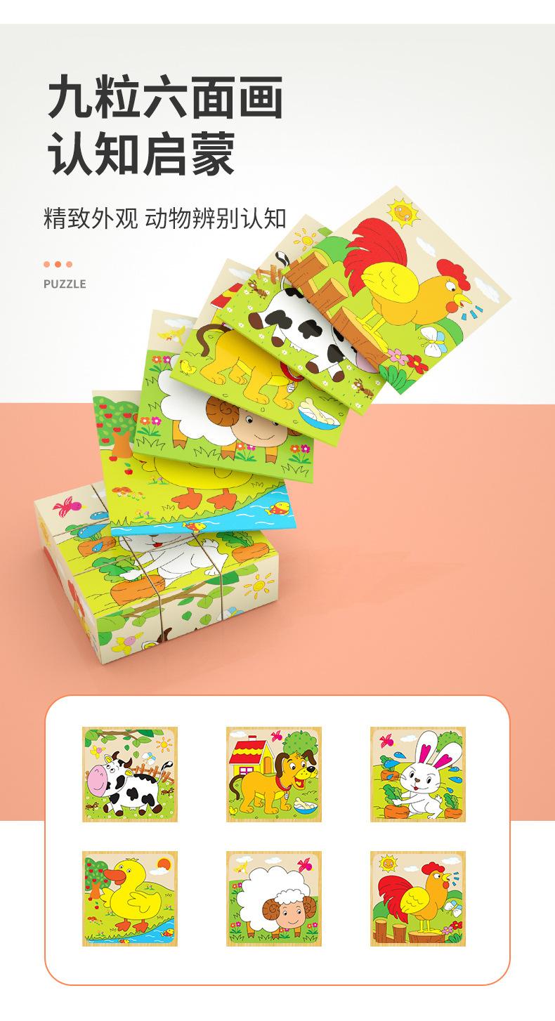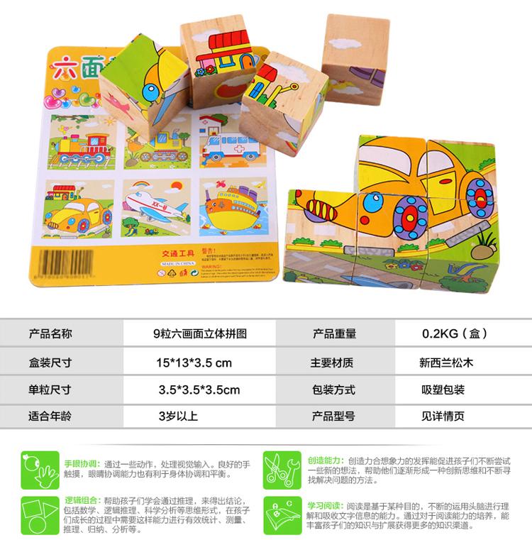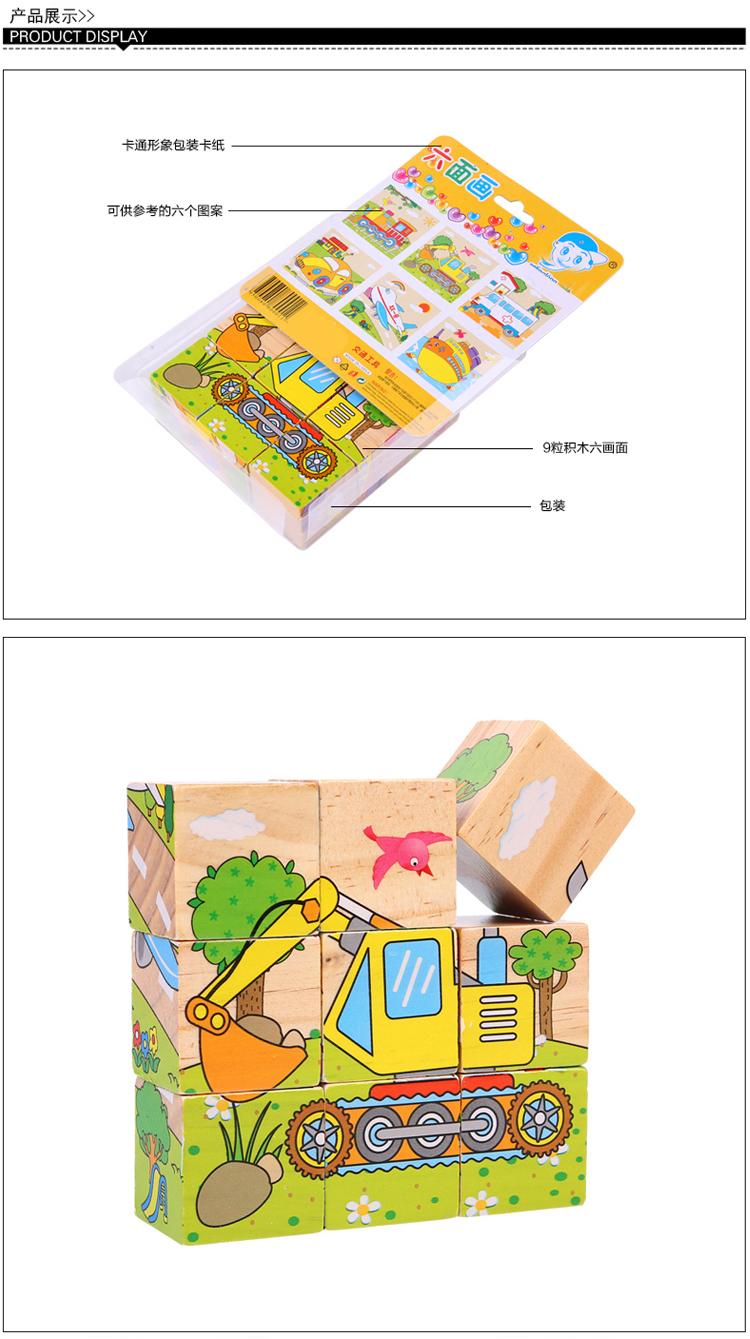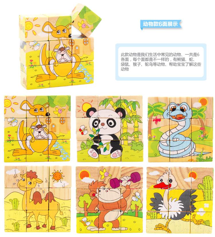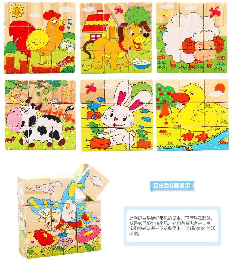 Este é um conjunto de blocos de quebra-cabeça 3D, consistindo em nove blocos com imagens impressas em seis lados. Um conjunto pode ser montado em seis padrões de desenhos animados diferentes.
