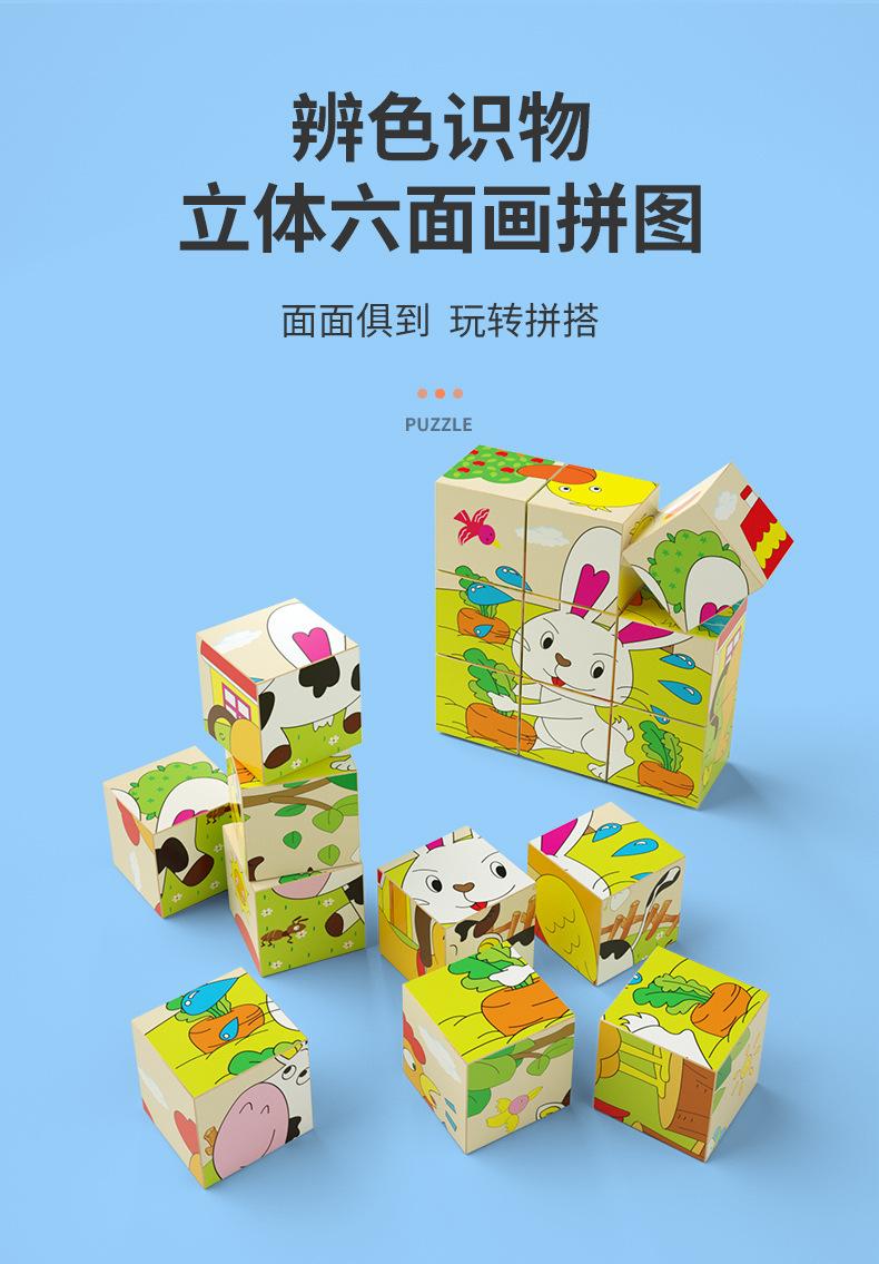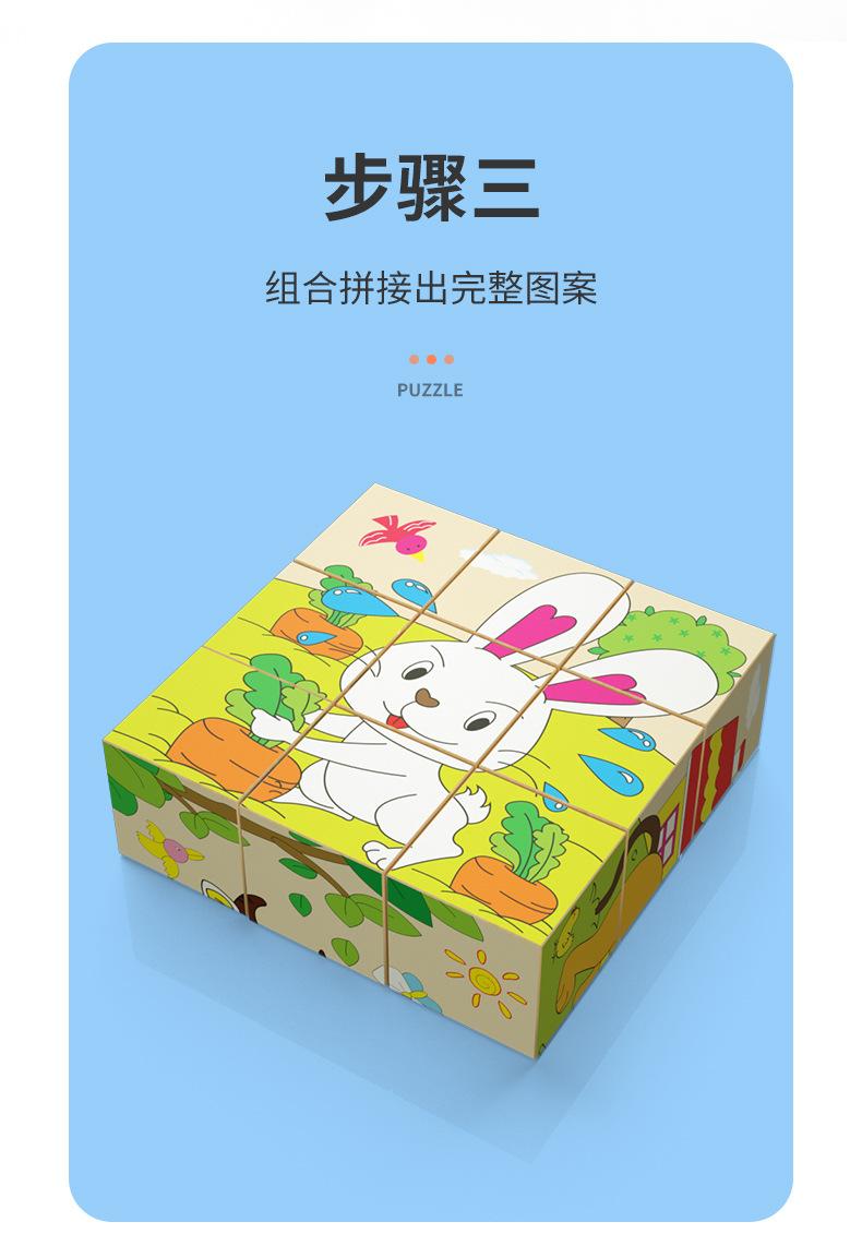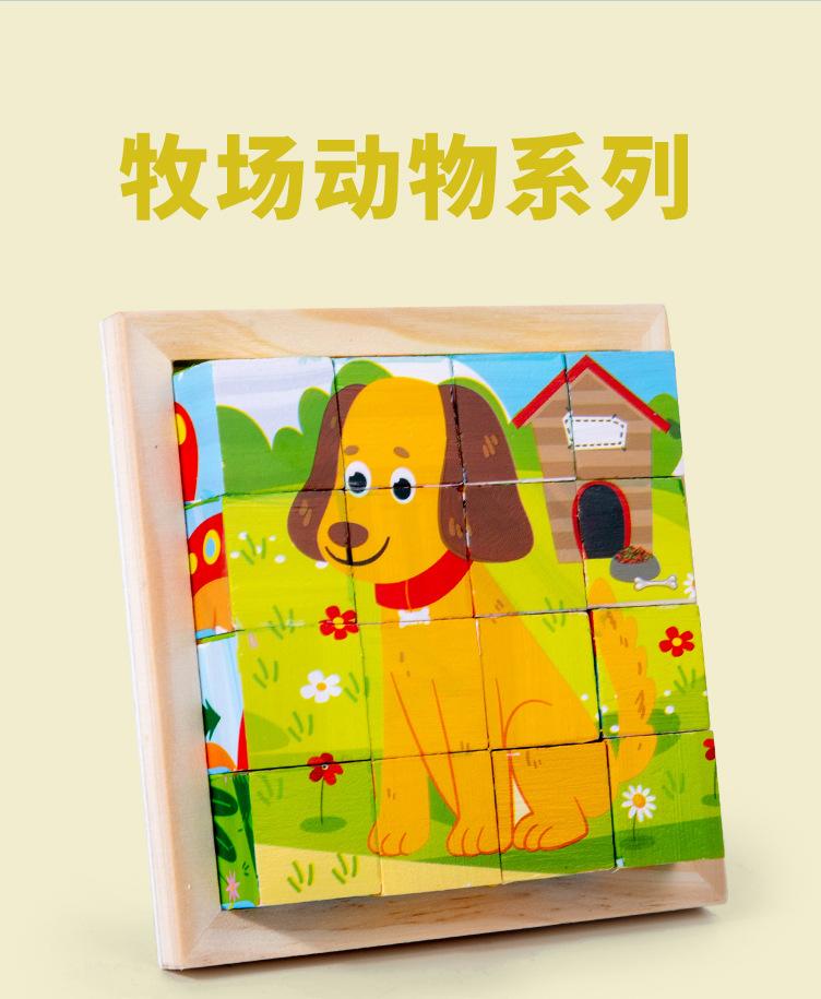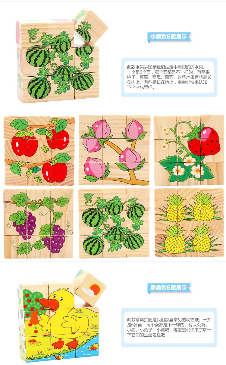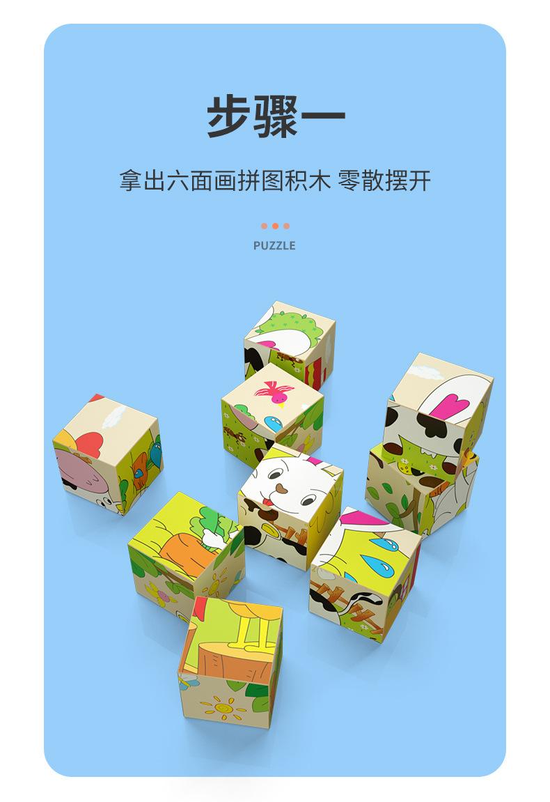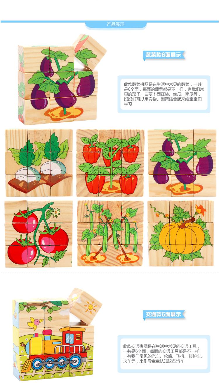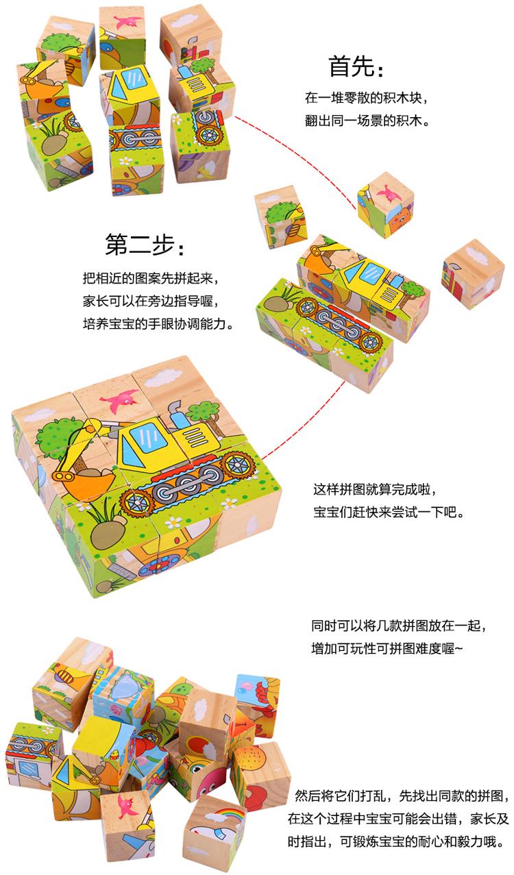 Este é um conjunto de blocos de quebra-cabeça 3D, consistindo em nove blocos com imagens impressas em seis lados. Um conjunto pode ser montado em seis padrões de desenhos animados diferentes.