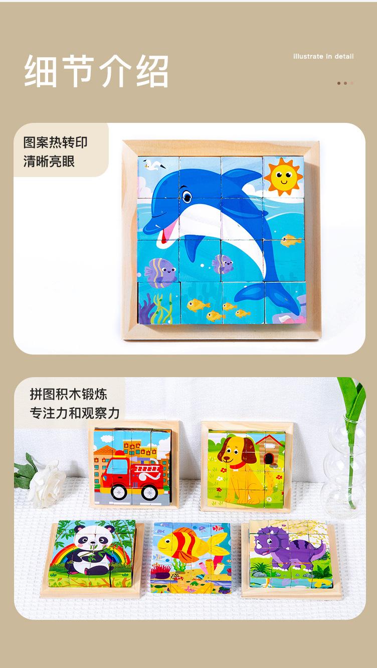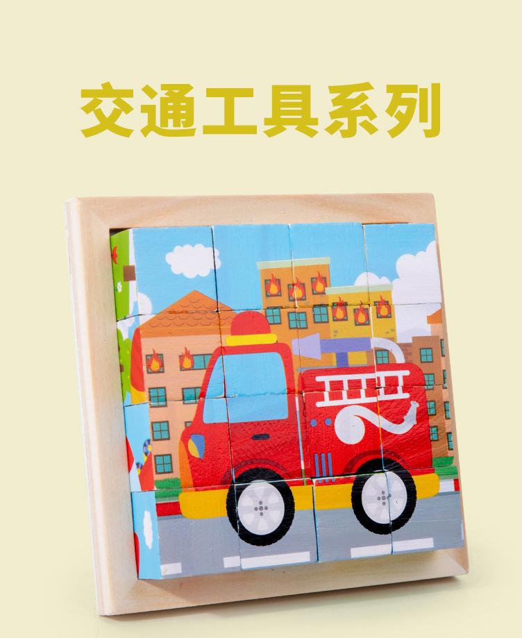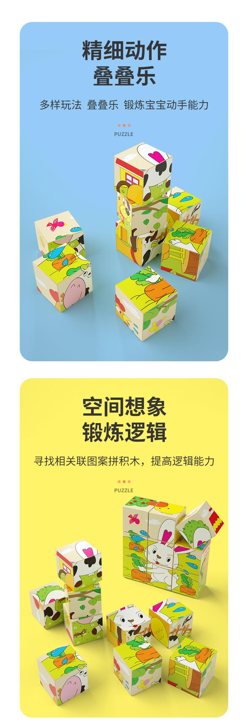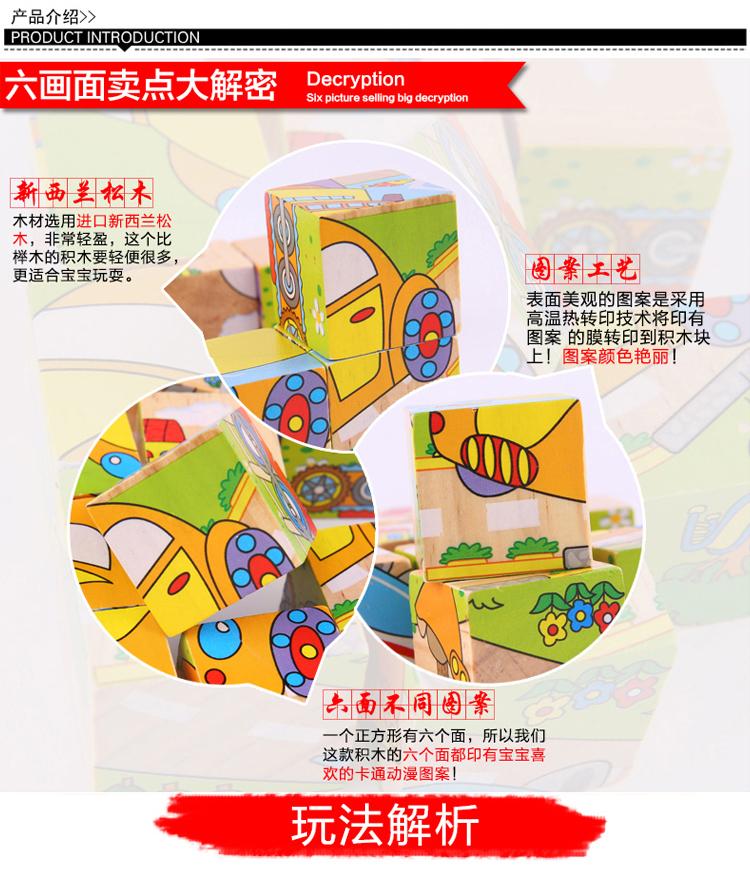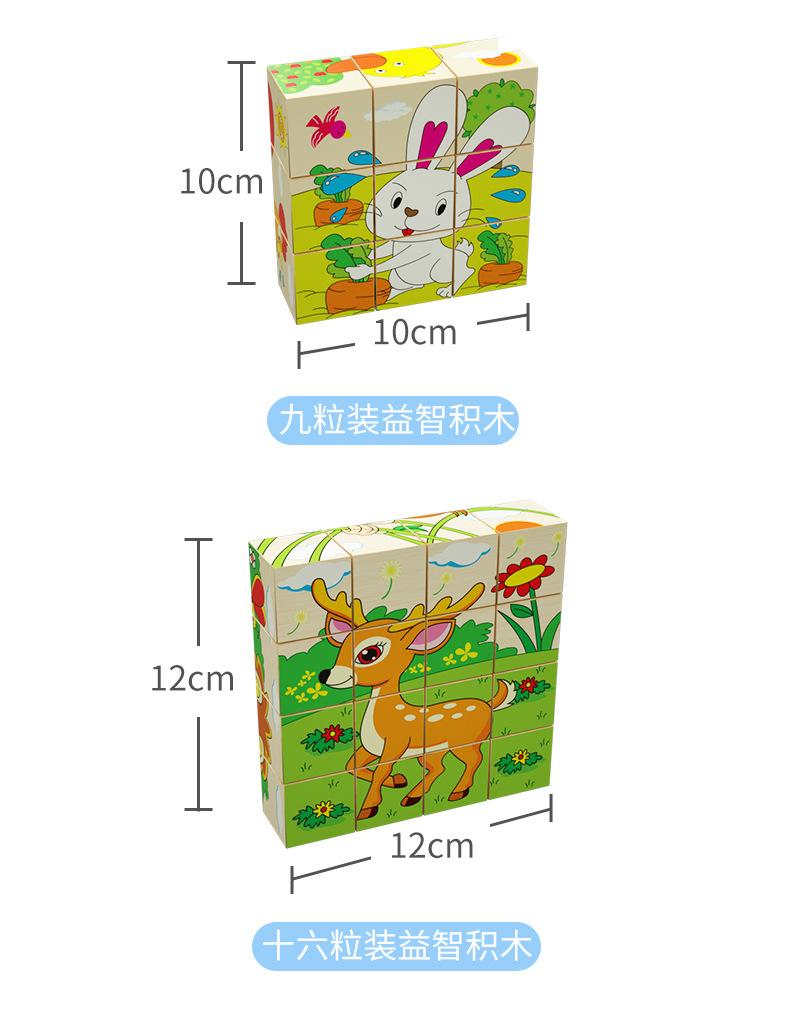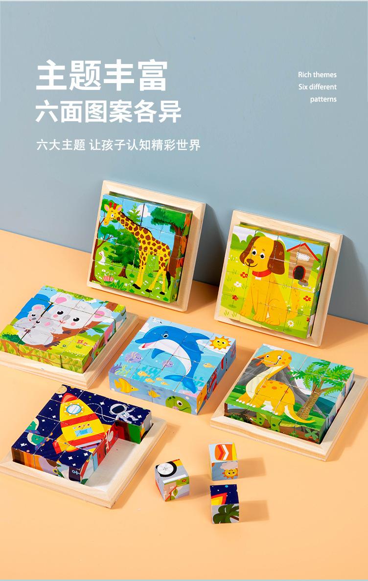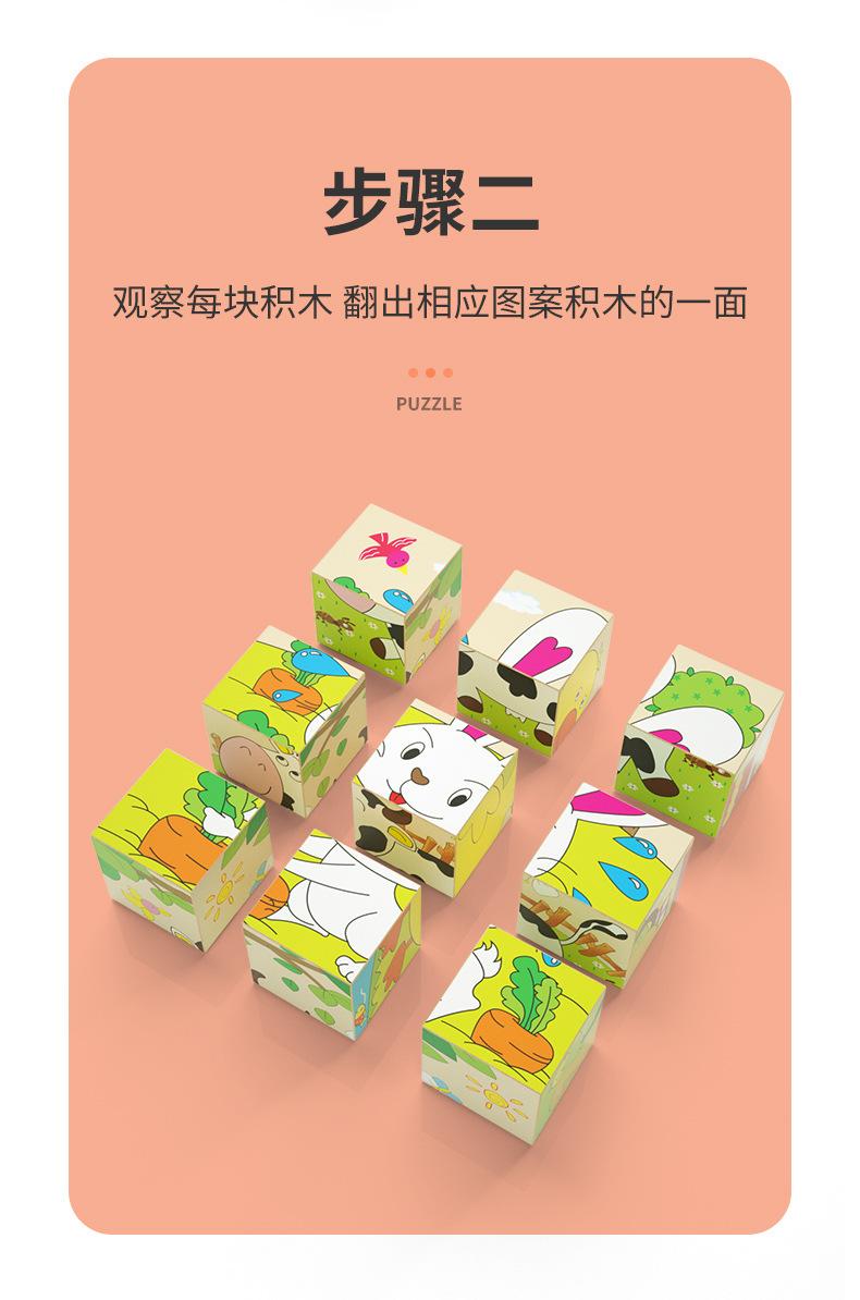 Este é um conjunto de blocos de quebra-cabeça 3D, consistindo em nove blocos com imagens impressas em seis lados. Um conjunto pode ser montado em seis padrões de desenhos animados diferentes.