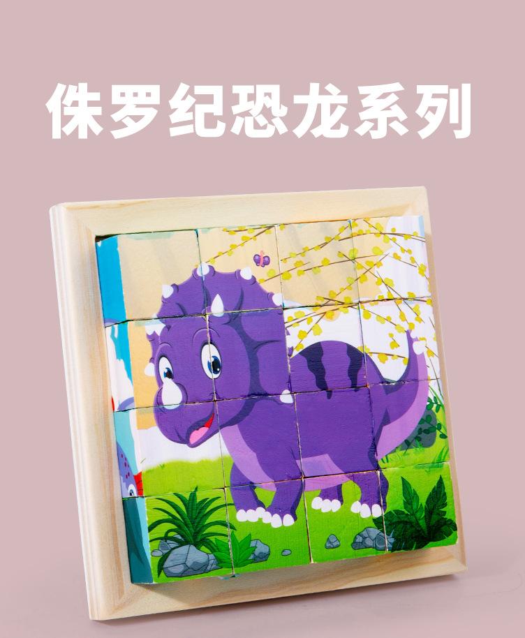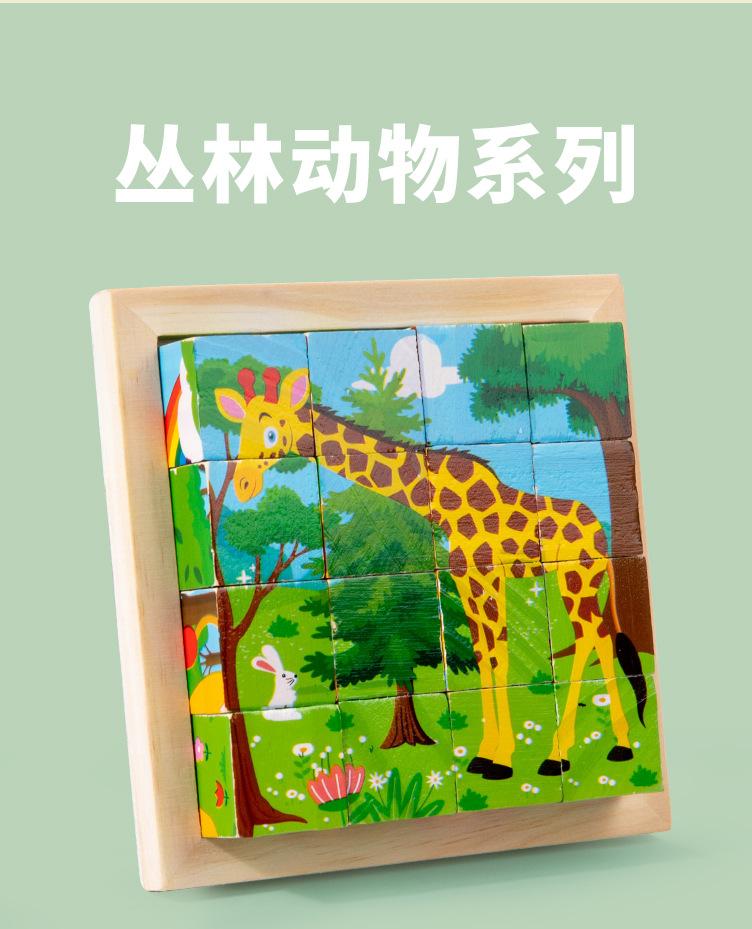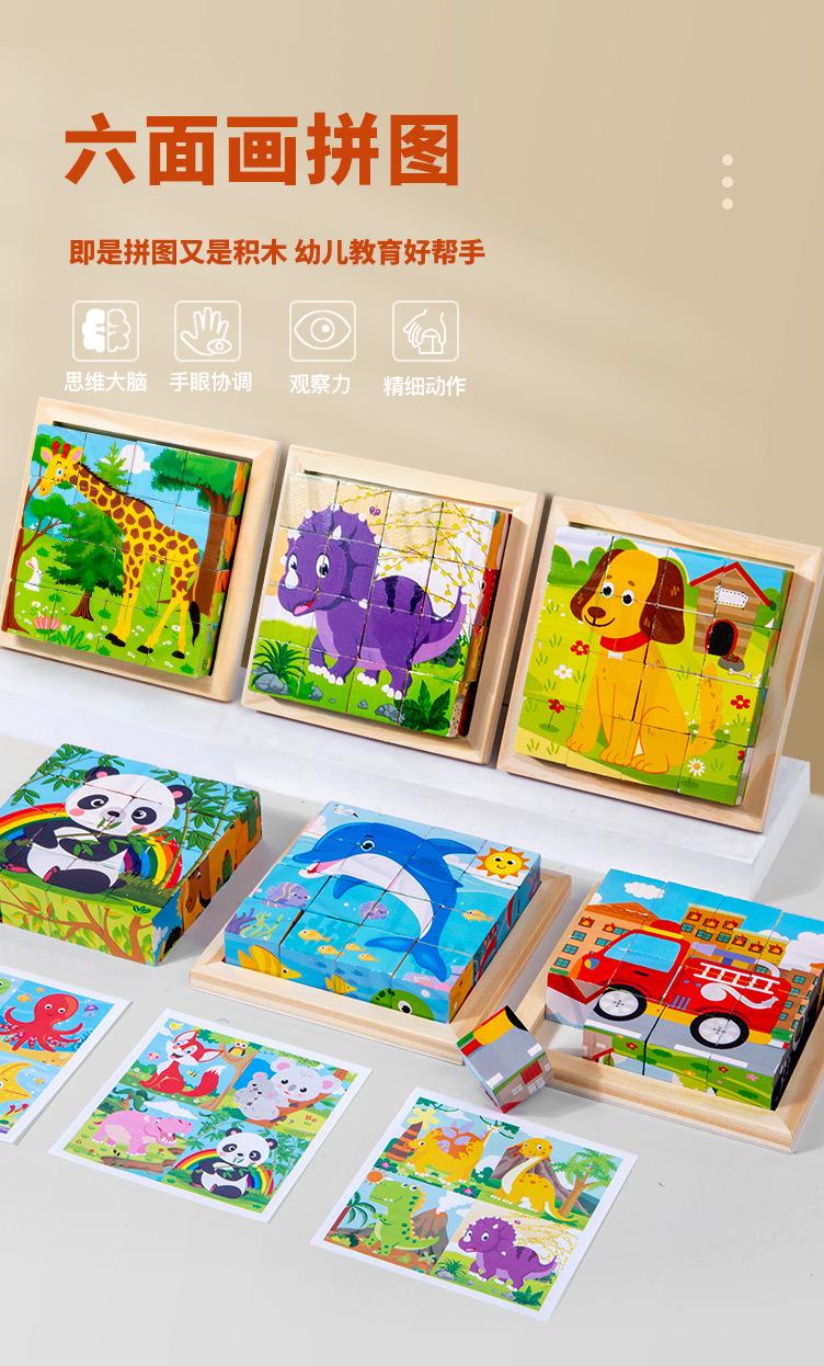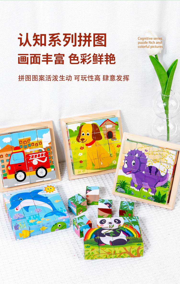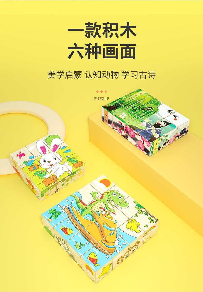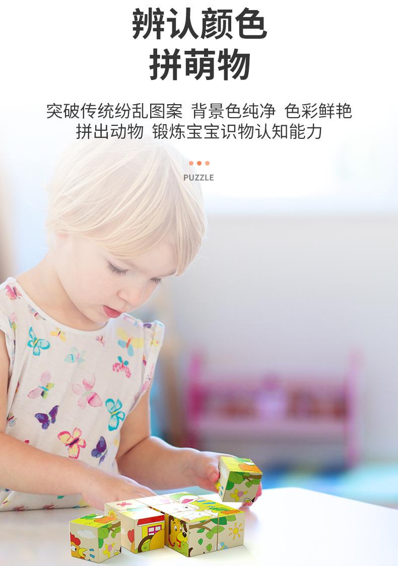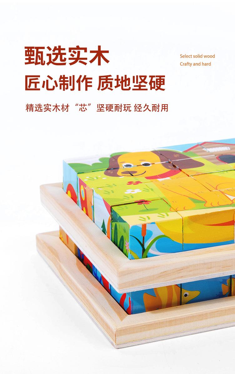 Este é um conjunto de blocos de quebra-cabeça 3D, consistindo em nove blocos com imagens impressas em seis lados. Um conjunto pode ser montado em seis padrões de desenhos animados diferentes.