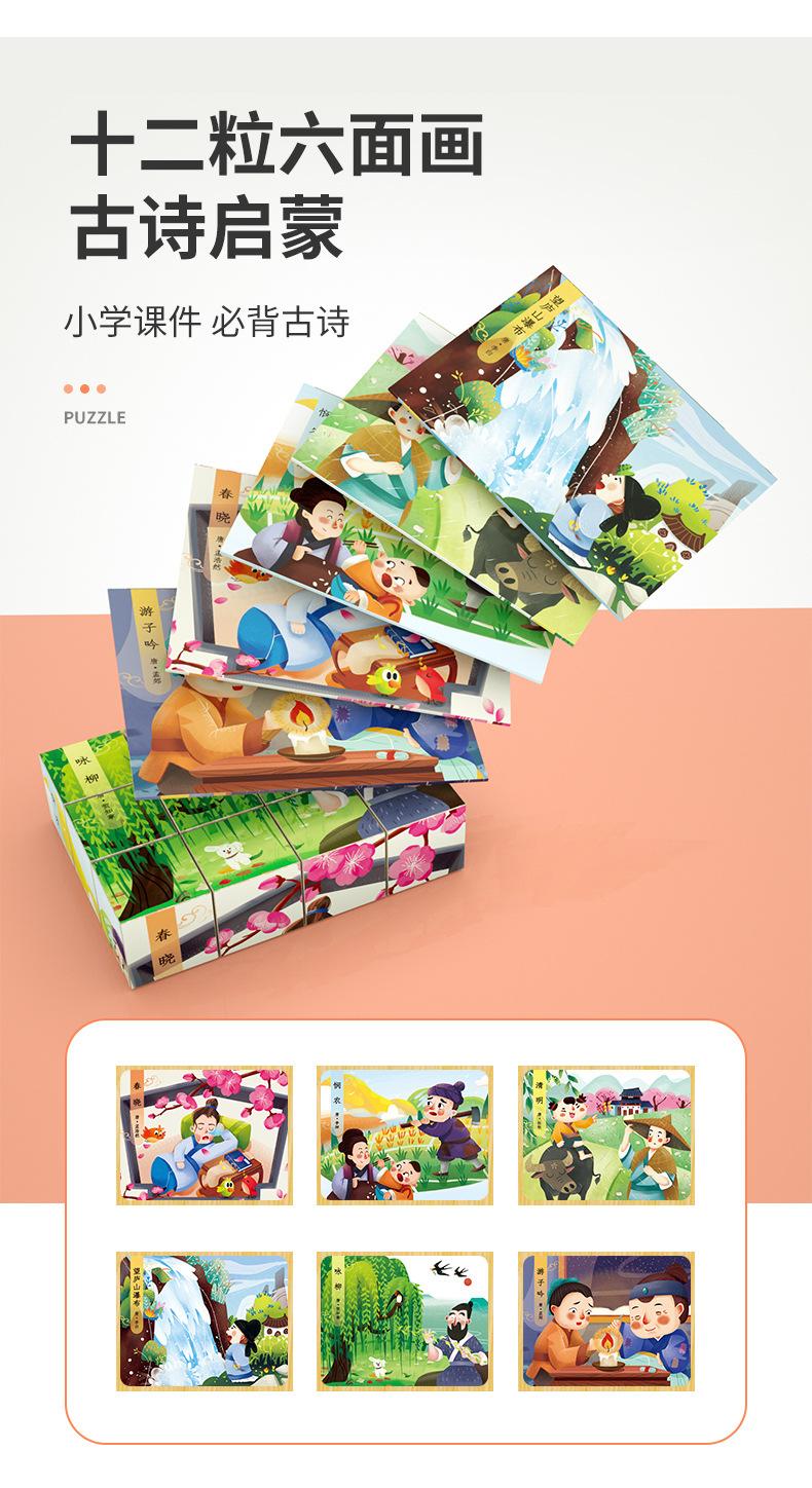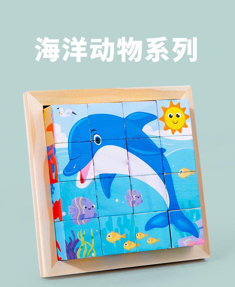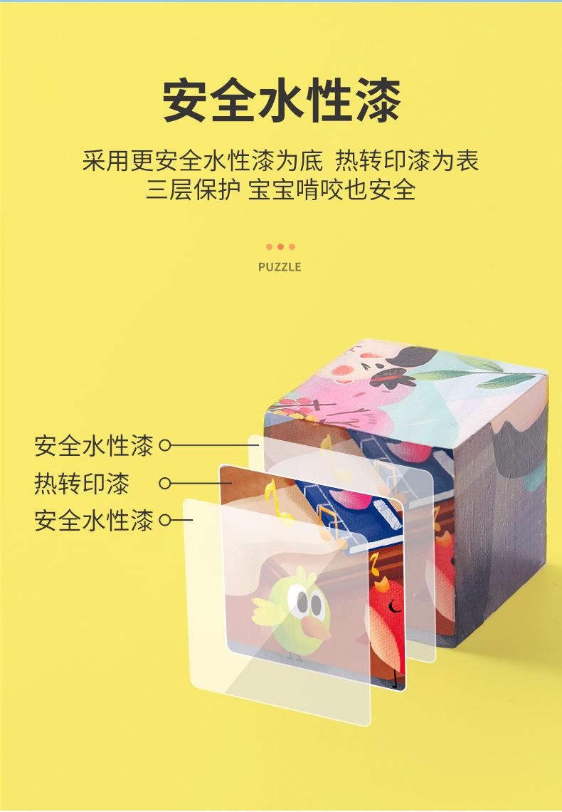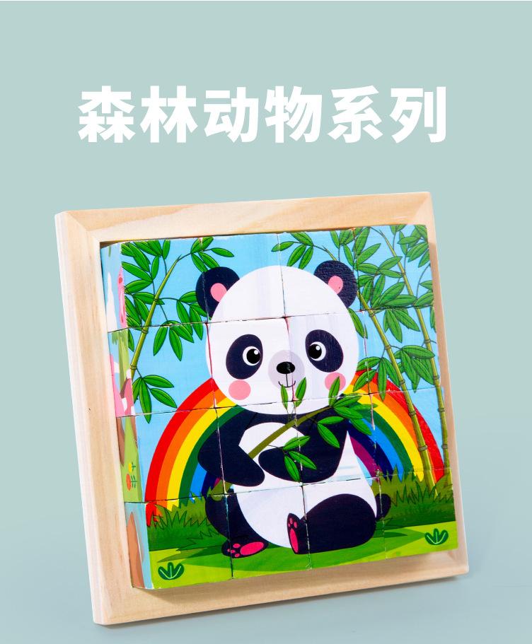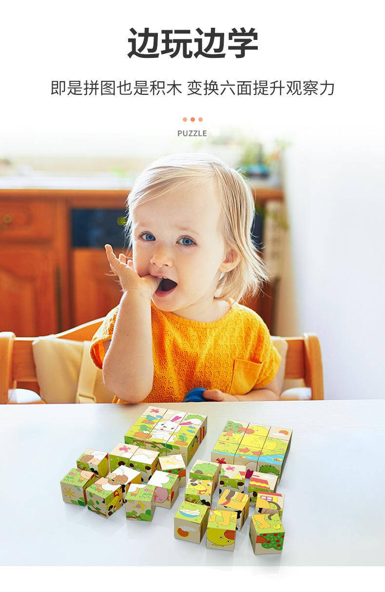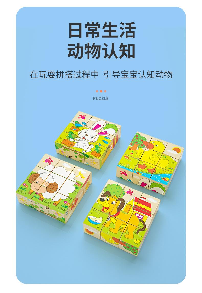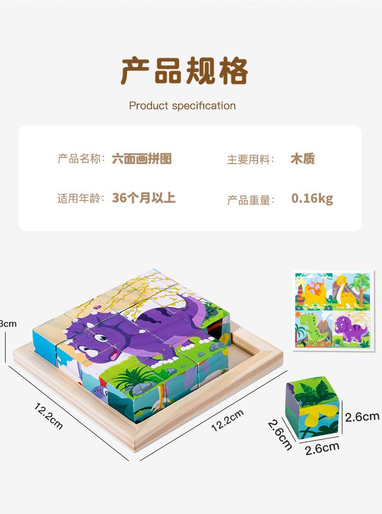 Este é um conjunto de blocos de quebra-cabeça 3D, consistindo em nove blocos com imagens impressas em seis lados. Um conjunto pode ser montado em seis padrões de desenhos animados diferentes.