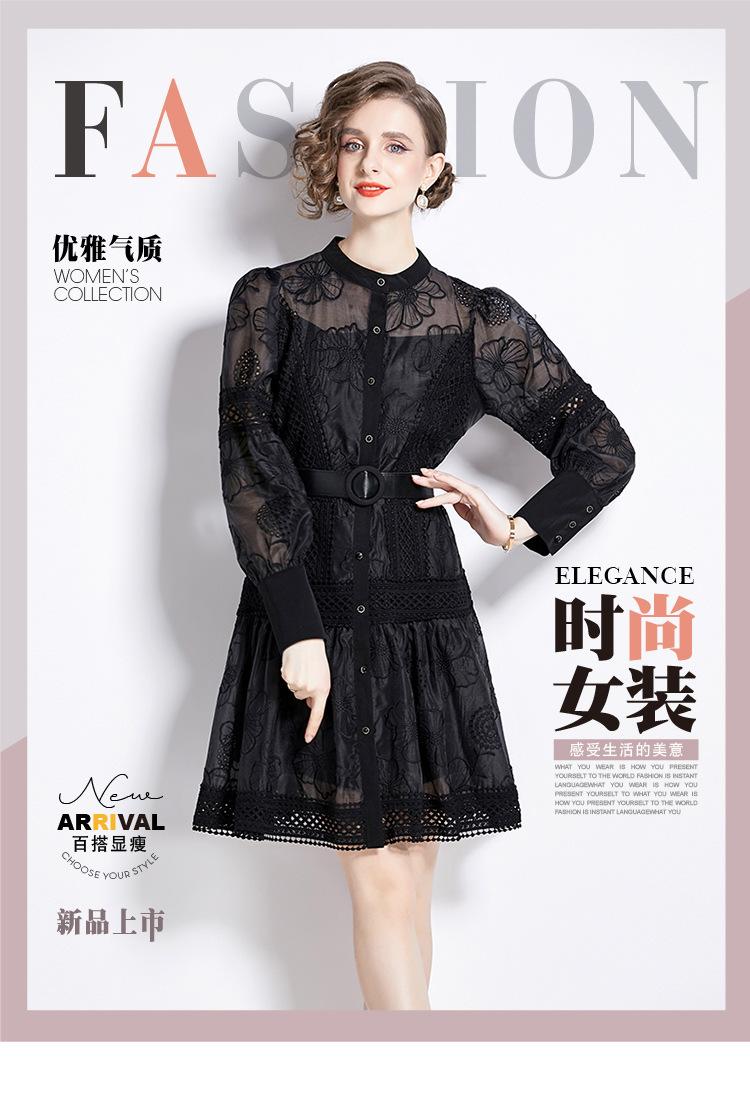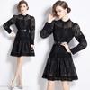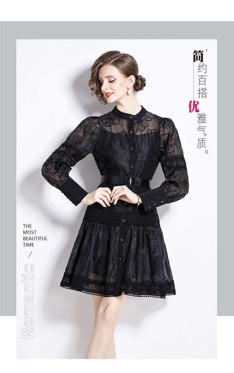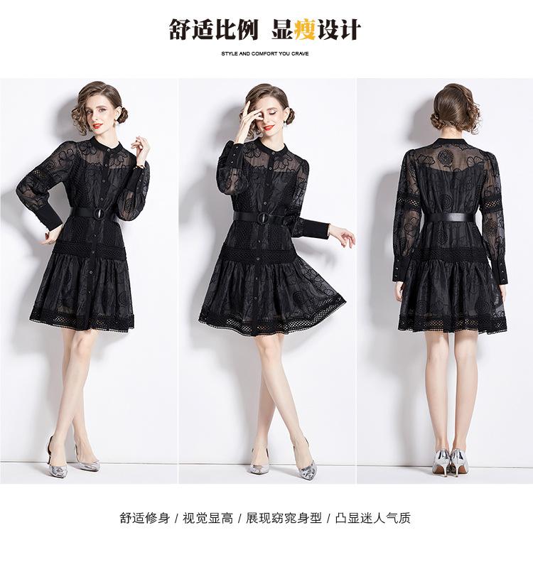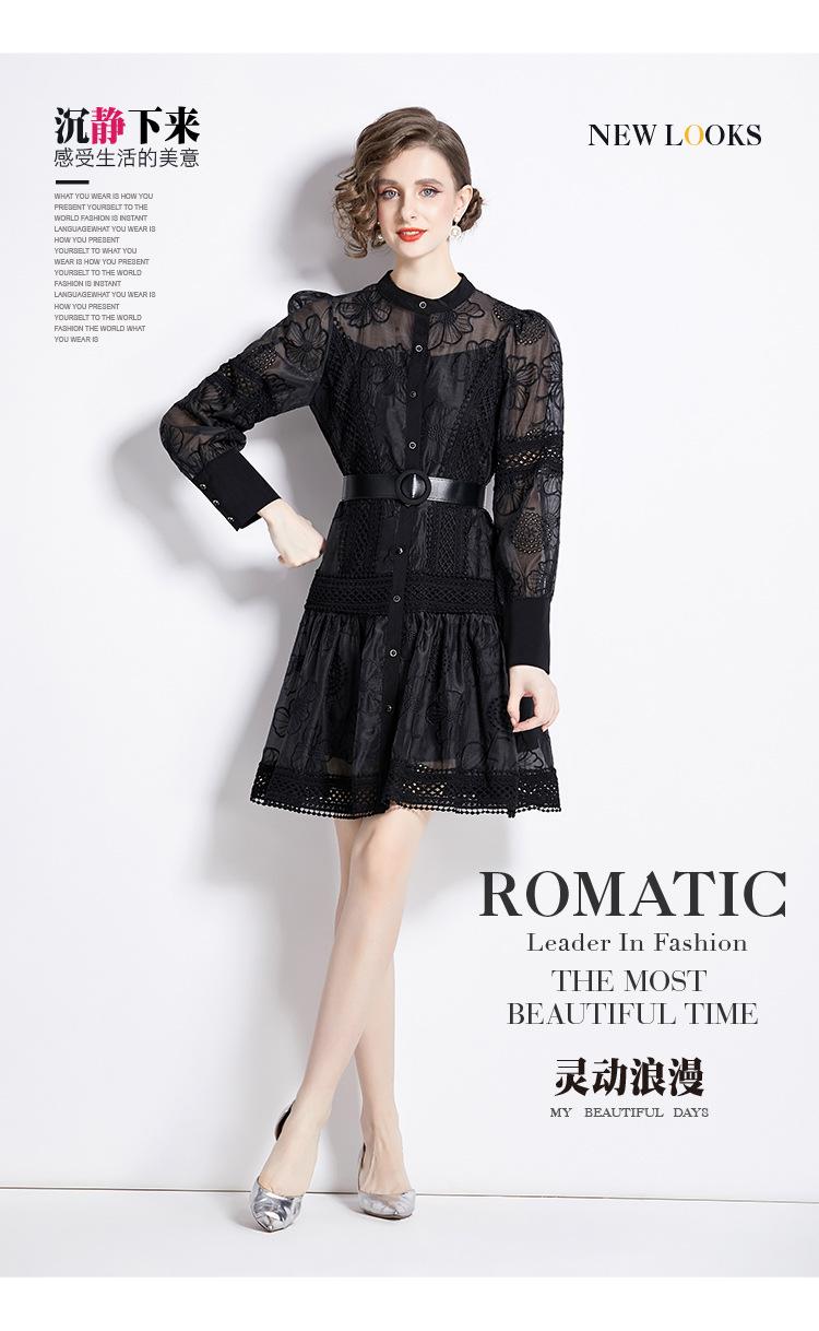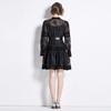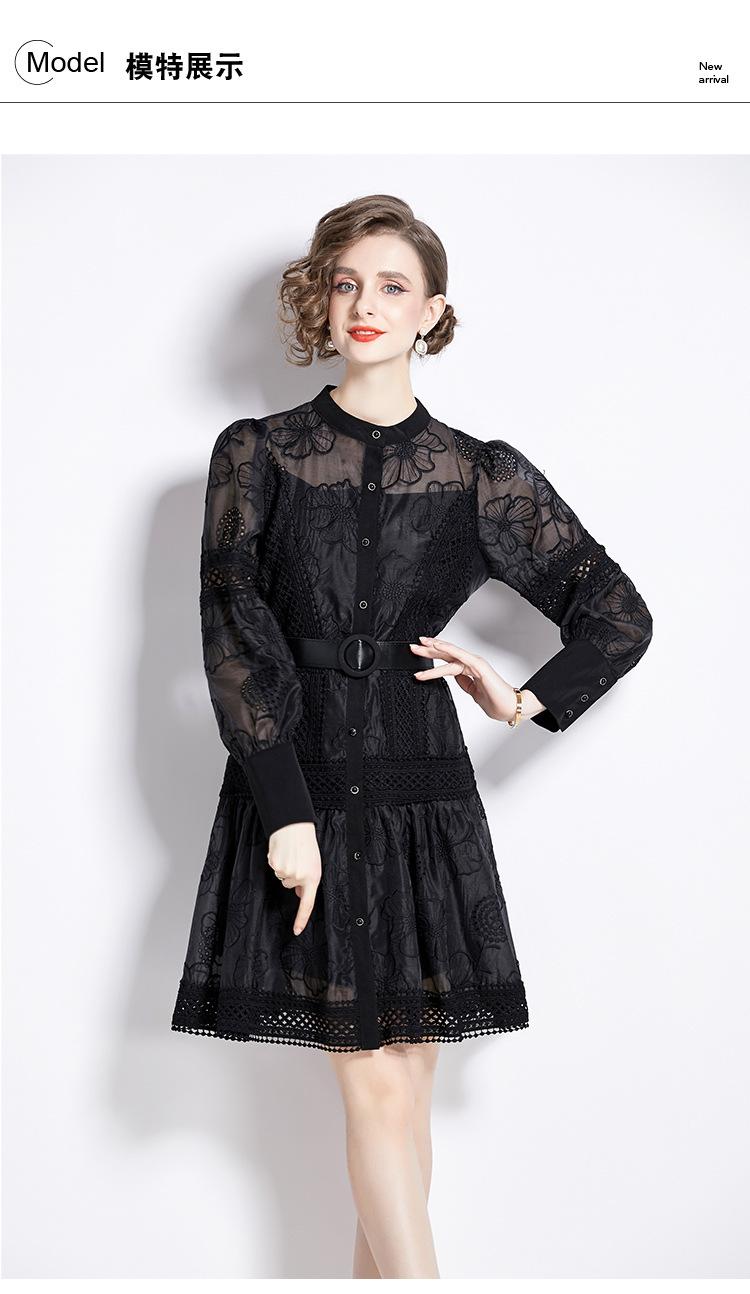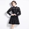 Vestido Elegante de Renda Novo Francês com Gola Alta Bordado Pesado Vazado Crochê Emagrecimento Cintura