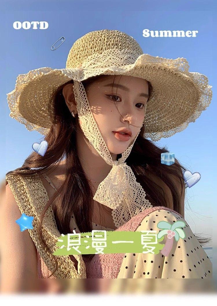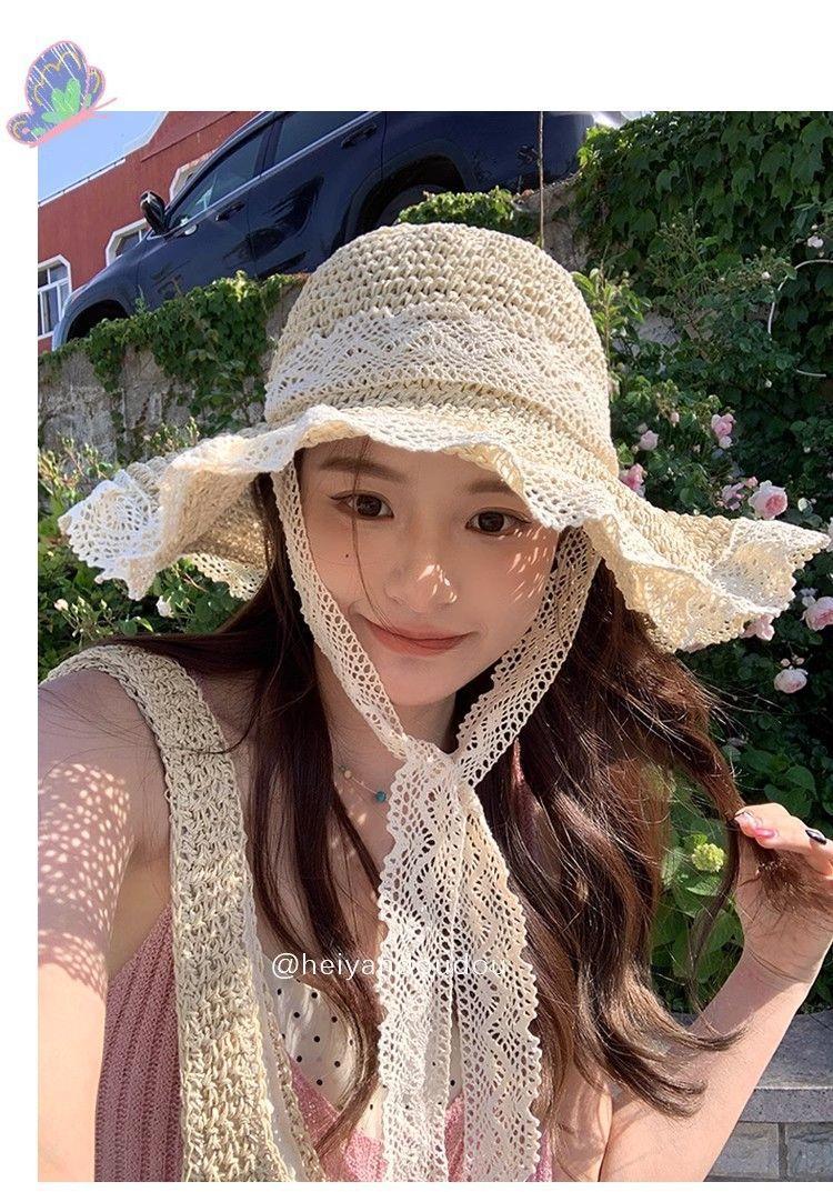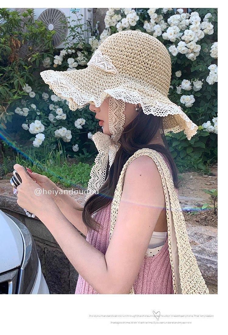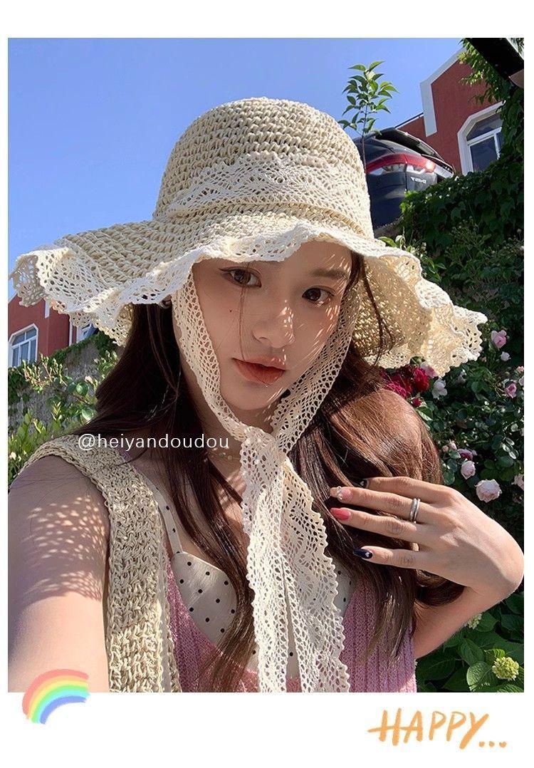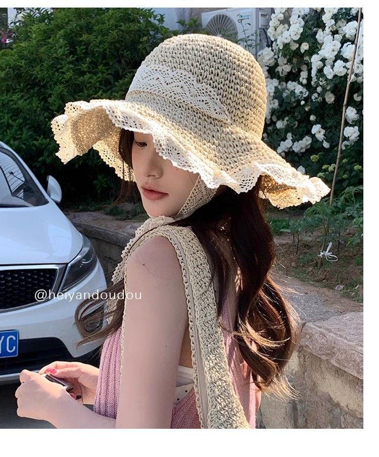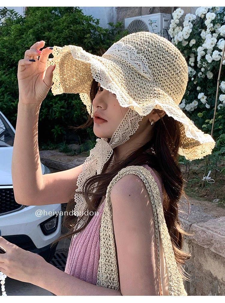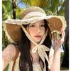Chapéu de palha oco chapéu beira-mar praia ins fita trança de palha passeio protetor solar chapéu de sol de praia renda chapéu de sol