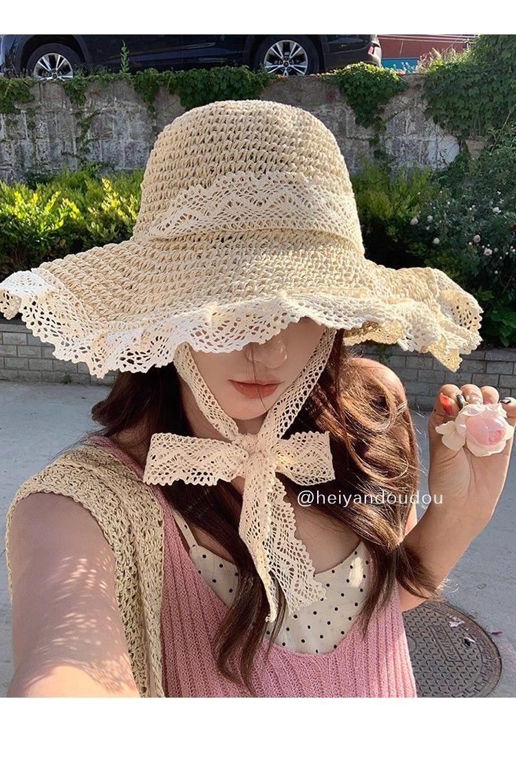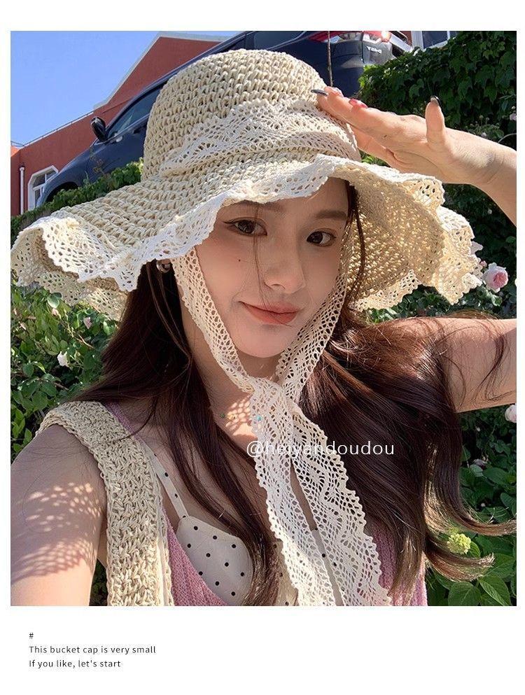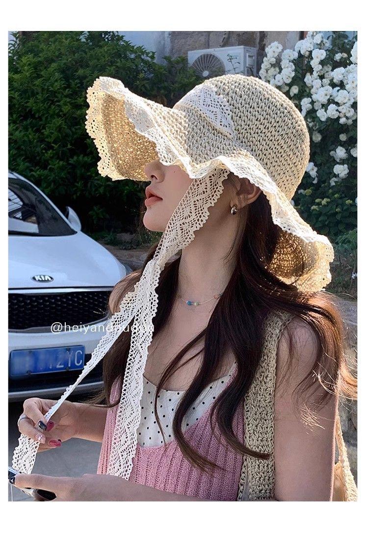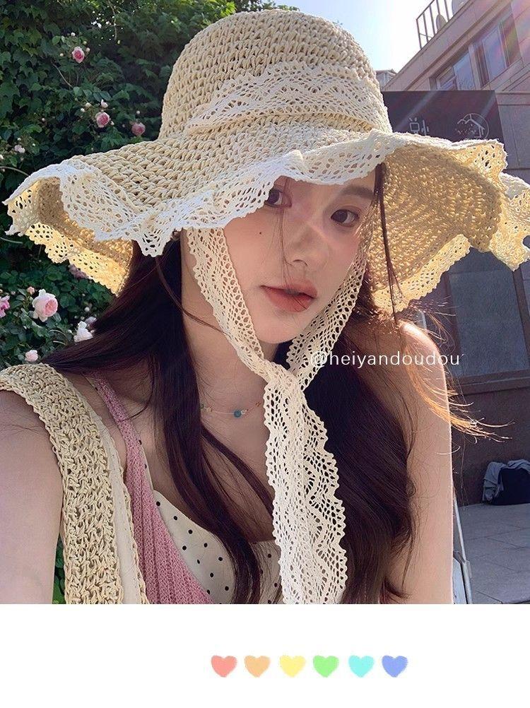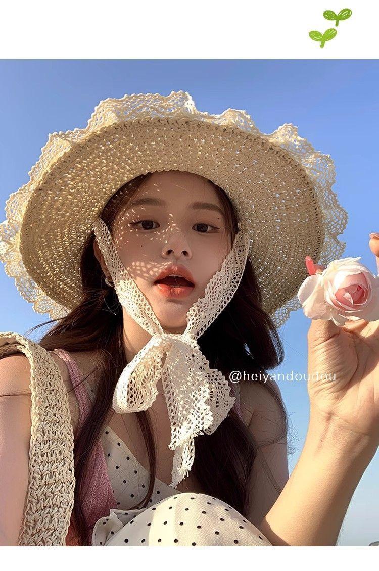 Chapéu de palha oco chapéu beira-mar praia ins fita trança de palha passeio protetor solar chapéu de sol de praia renda chapéu de sol