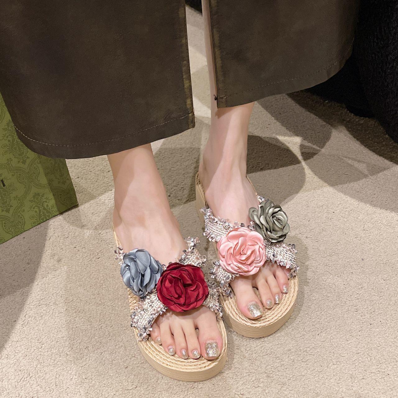 Sandálias de Sola Grossa Antiderrapante Sandálias de Salto Anabela Flor Femininas 2025 Verão Novo Sapatos de Praia Chinelos Moda Feminina Para Sair