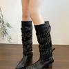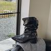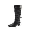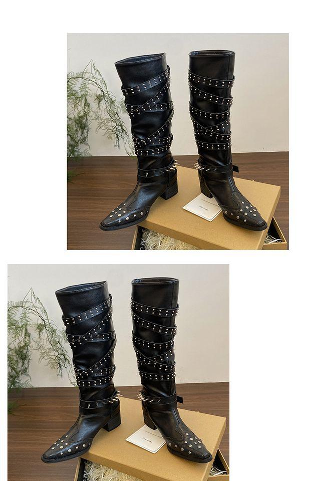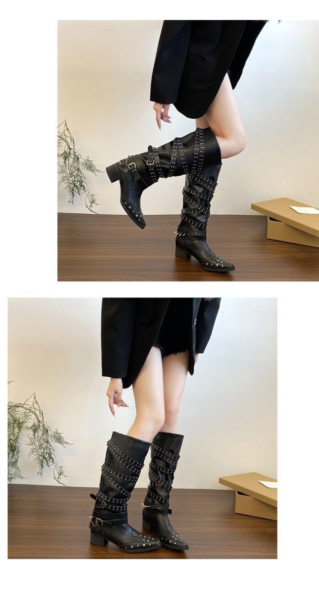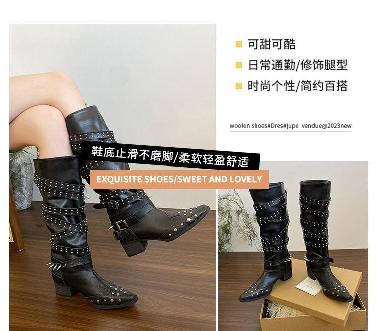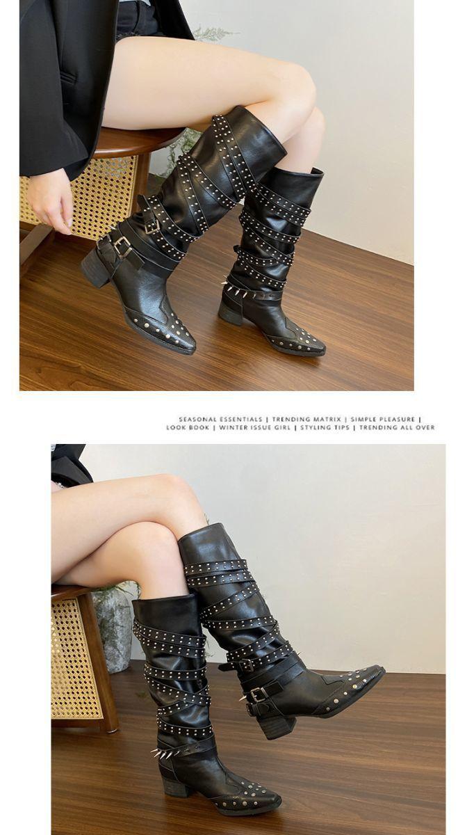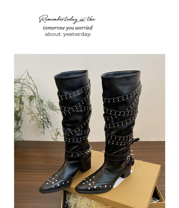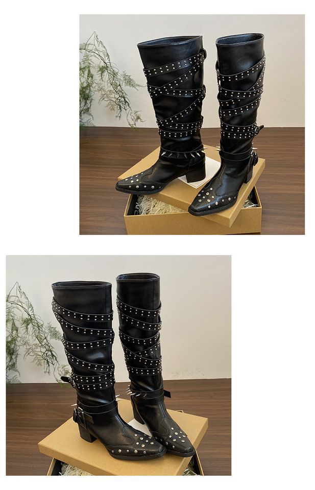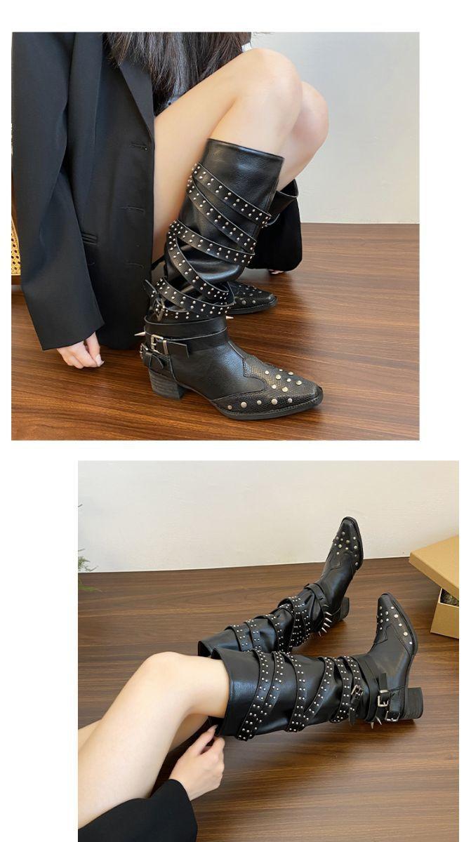 Botas Longas Femininas Verão Fino 2025 Novo Estilo Britânico Rebite Salto Grosso Botas Fivela de Cinto Botas Cowboy Ocidental