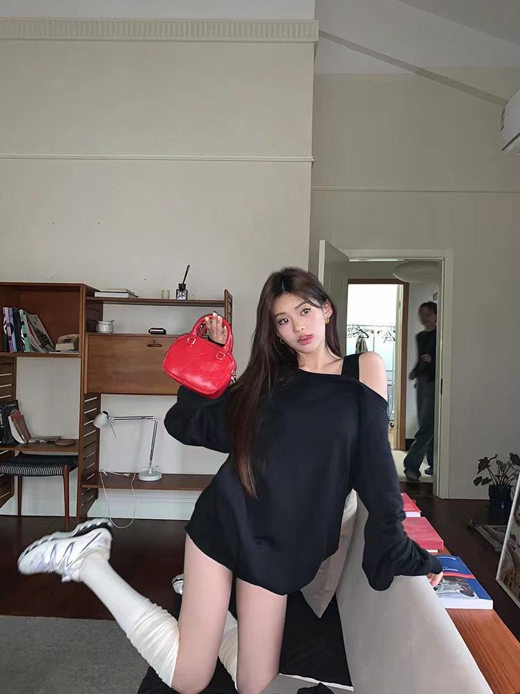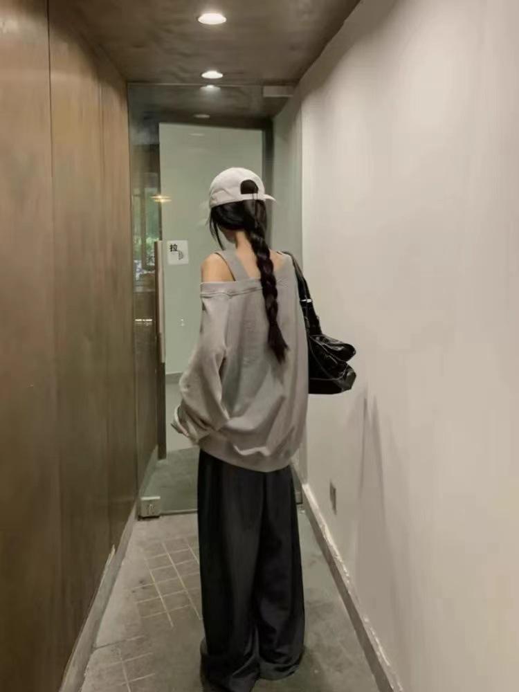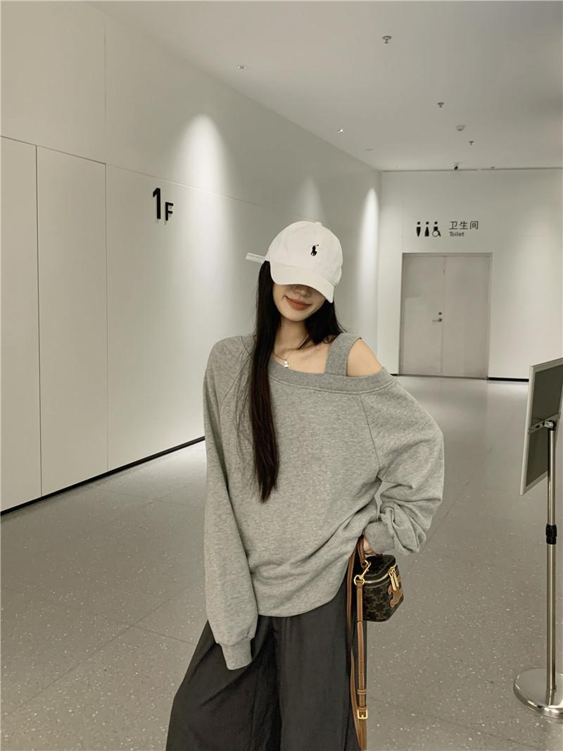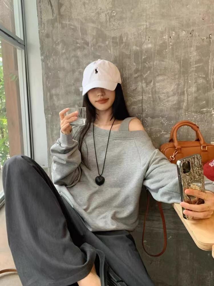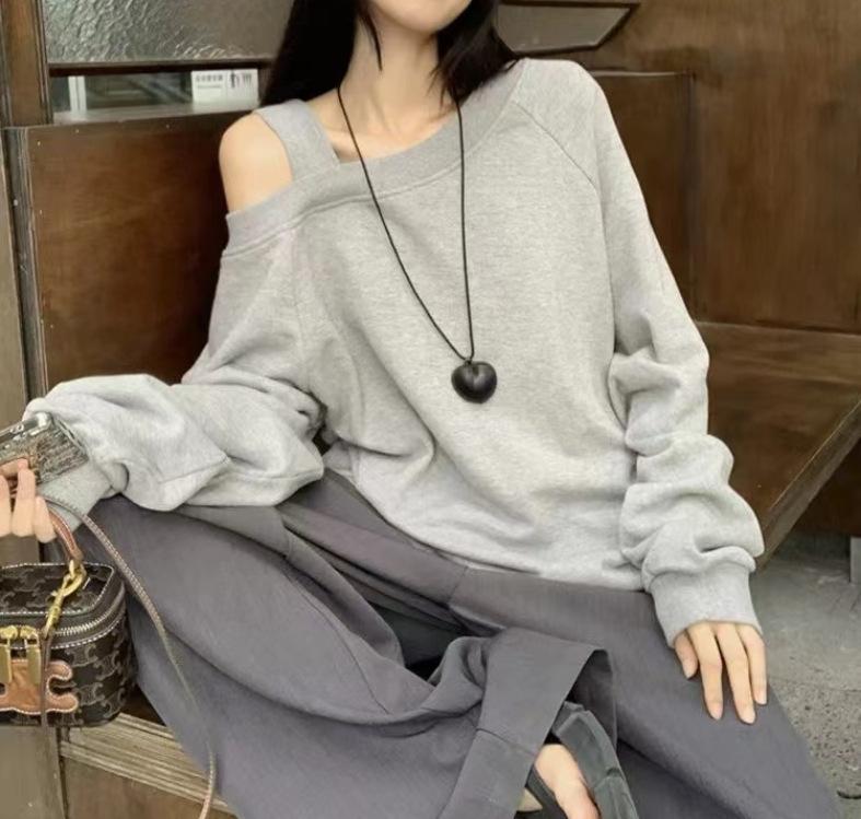 Moletom Feminino Estilo Americano Ombro Caído Ombro Descoberto Solto Manga Longa Design 2025 Top Quente Solto Ins Primavera e Outono
