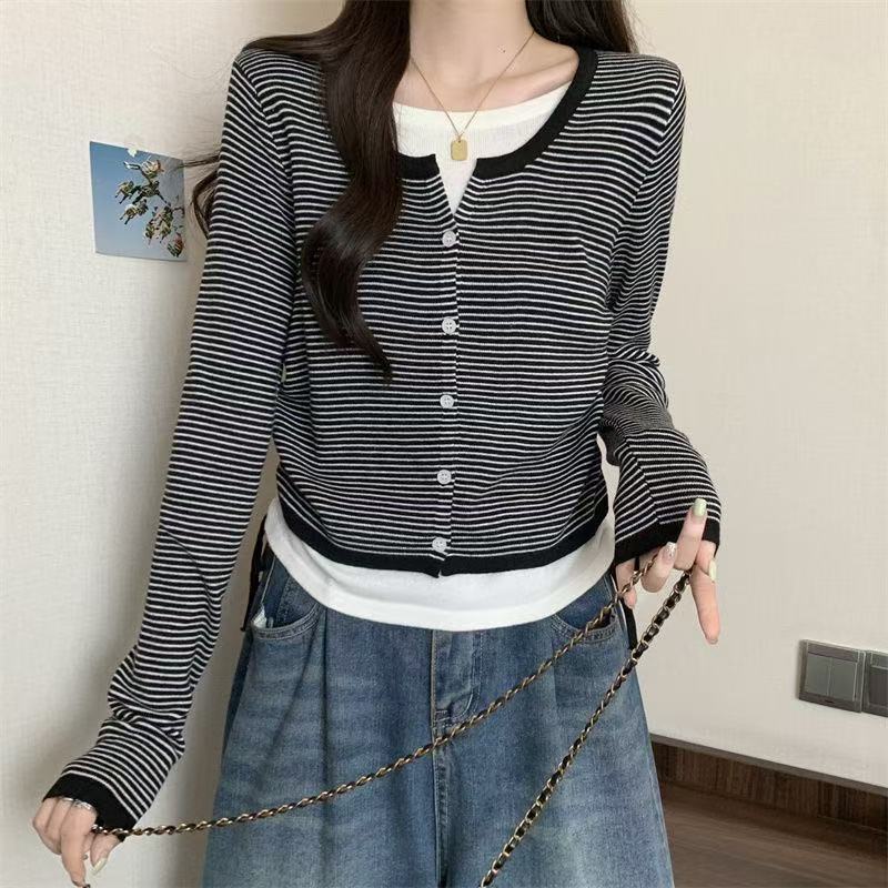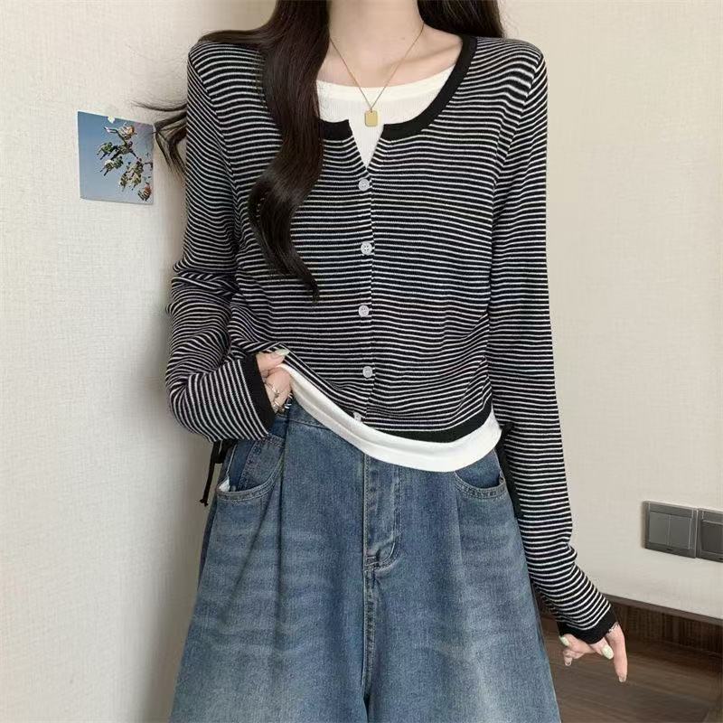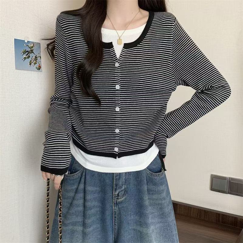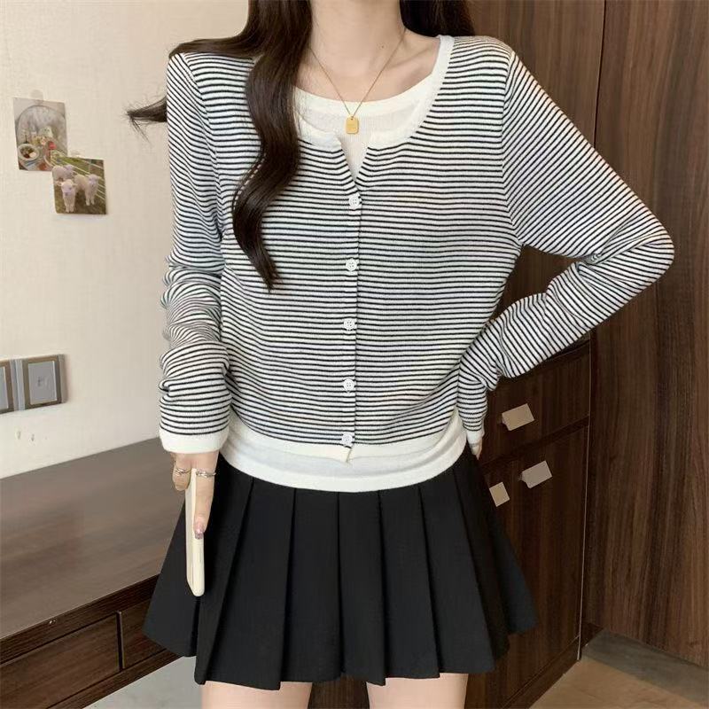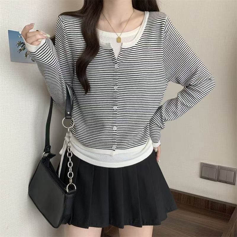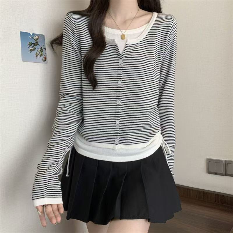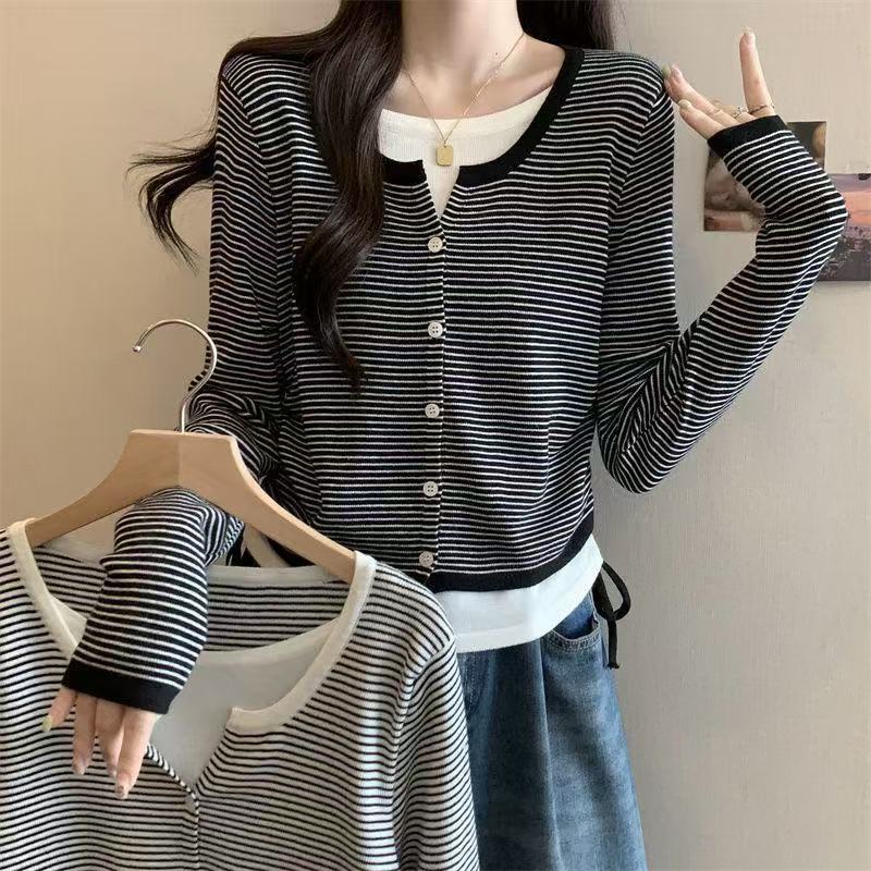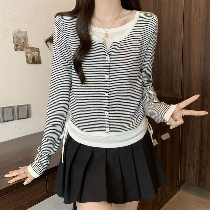 Suéter de malha moderno estilo coreano falso duas peças manga longa listrado 2026 novo cintura com cordão macio e ceroso