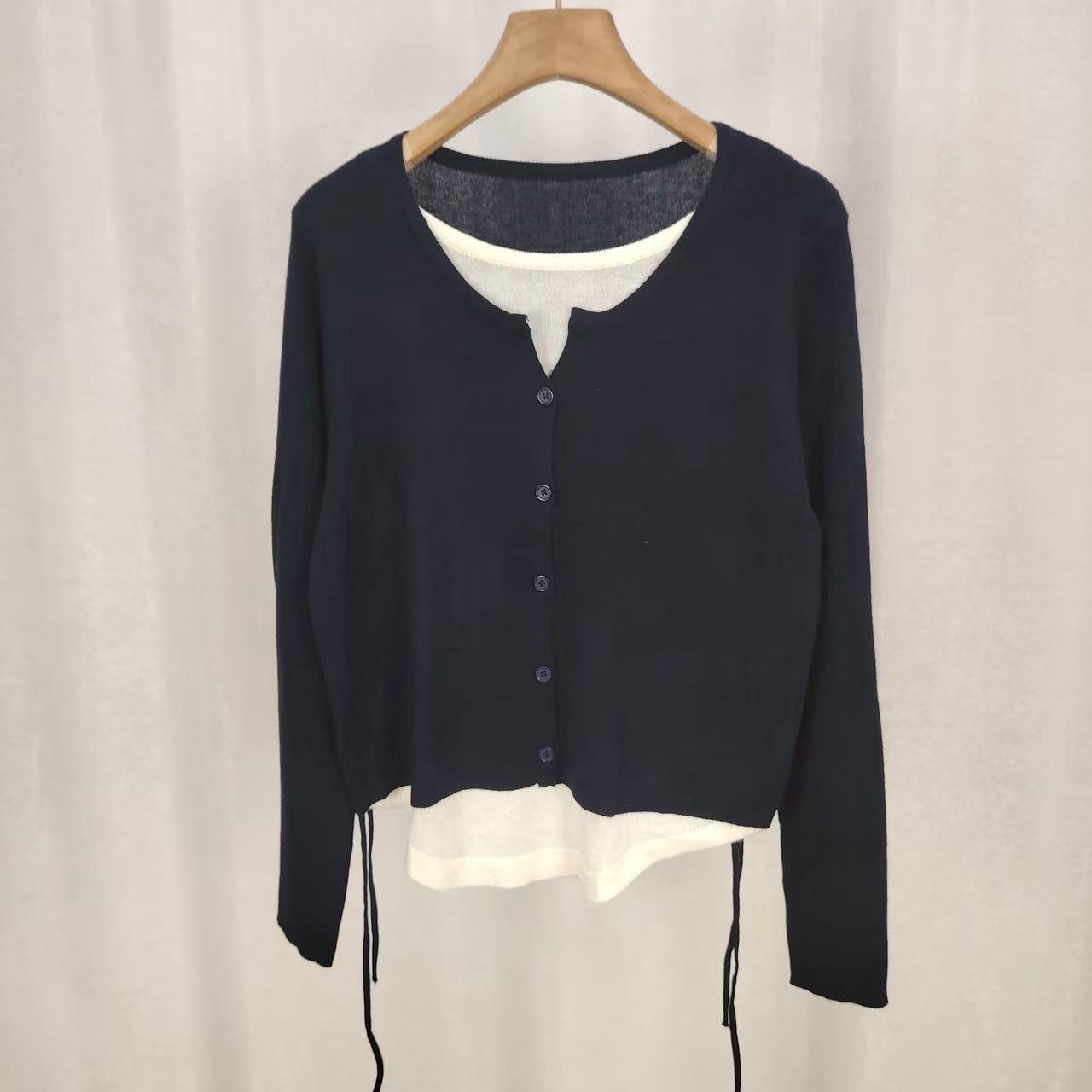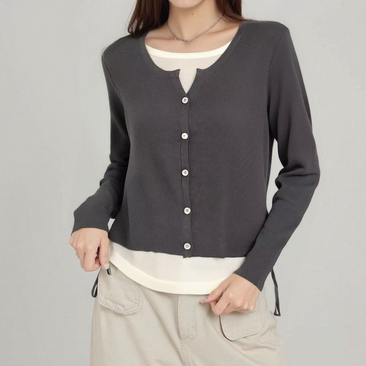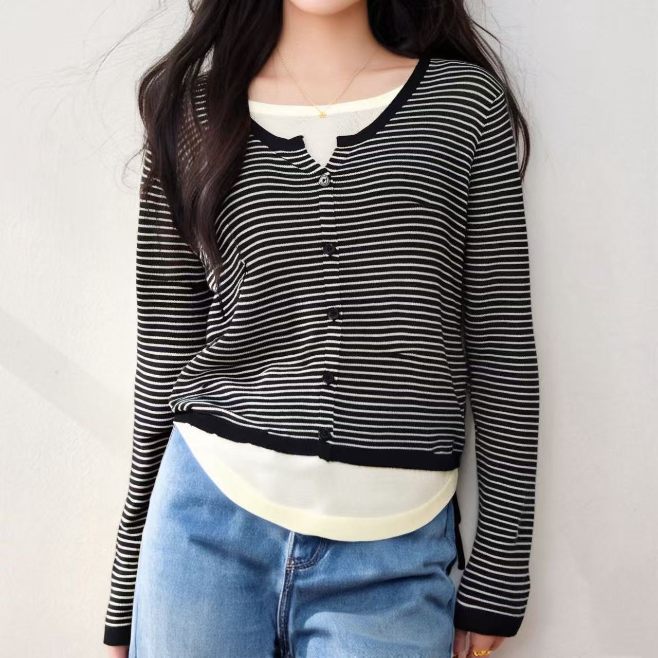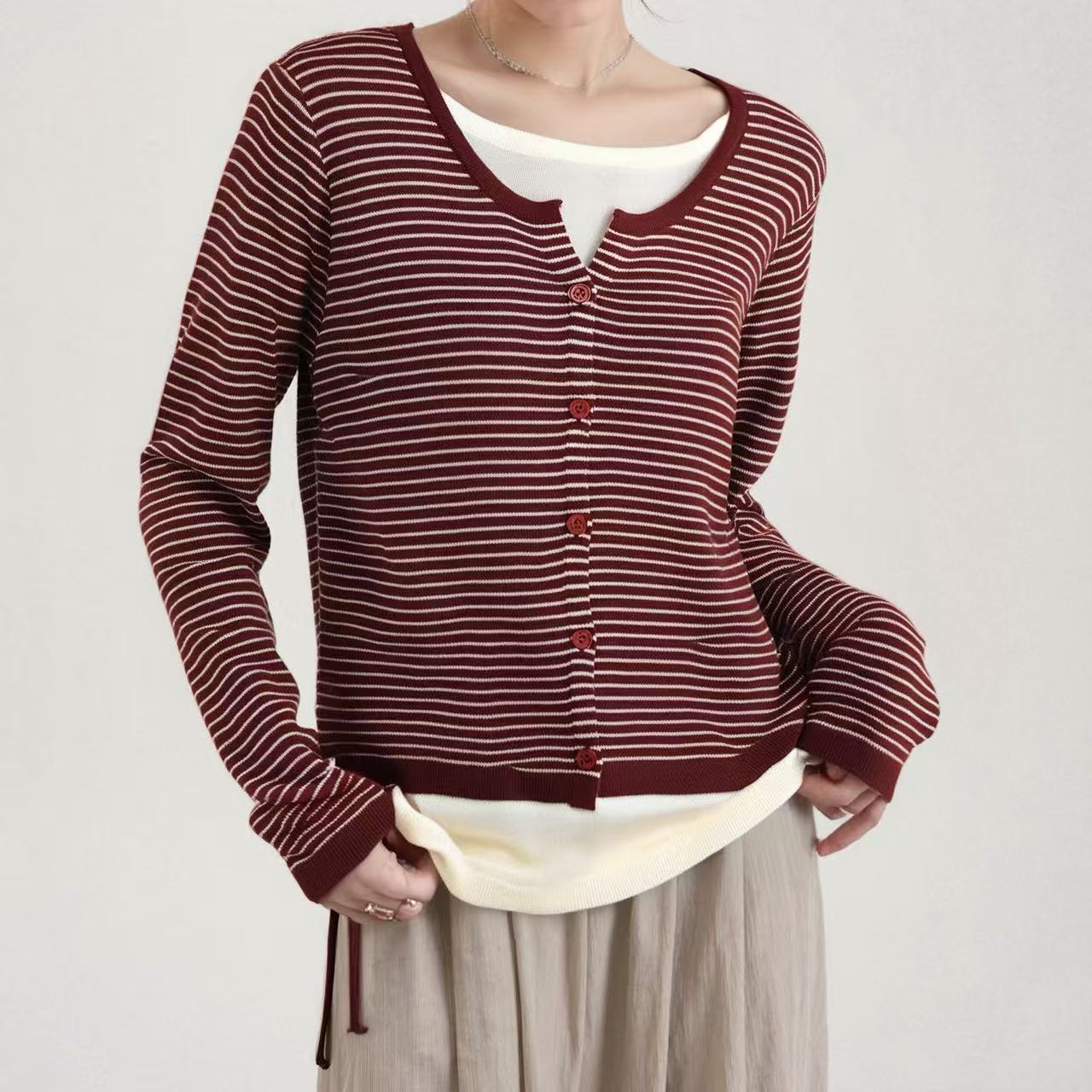 Suéter de malha moderno estilo coreano falso duas peças manga longa listrado 2026 novo cintura com cordão macio e ceroso