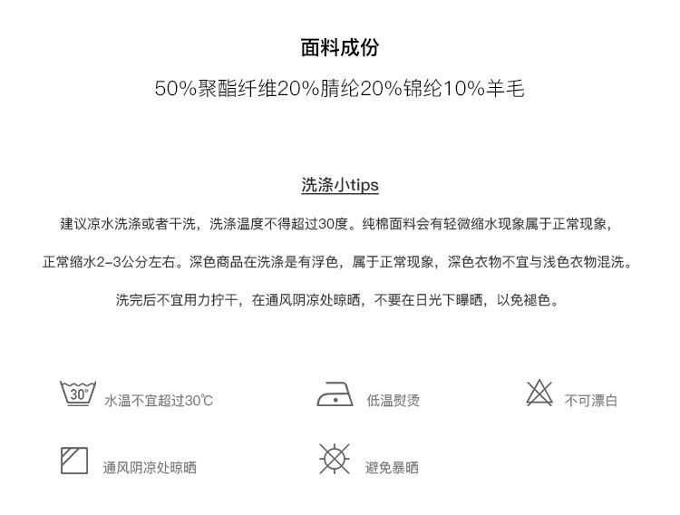 50% polyester fiber 20% acrylic fiber 20% nylon 10% wool