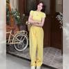 305 # Verão Novo Terno da Moda Feminino Listrado Moda Camiseta Manga Curta Casual Cintura Alta Calças Perna Larga Conjunto de Duas Peças