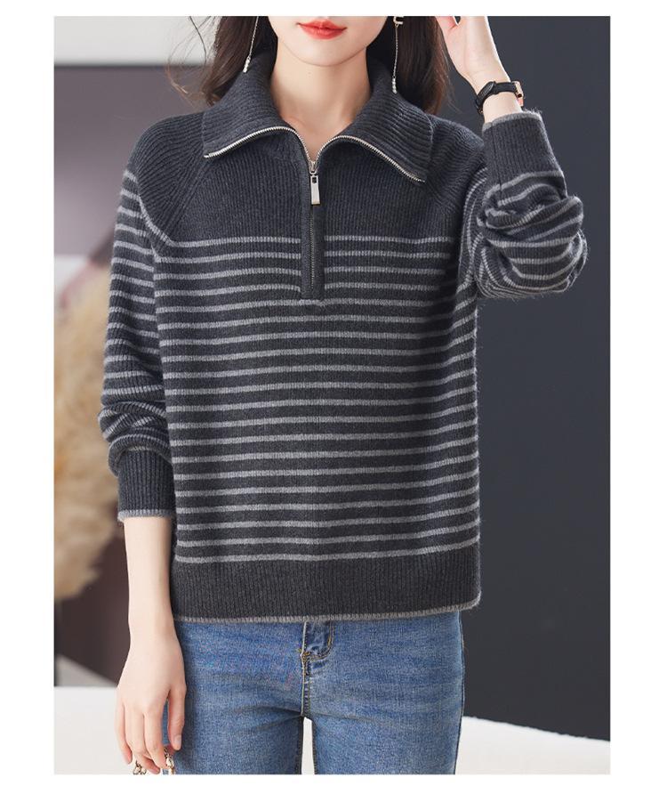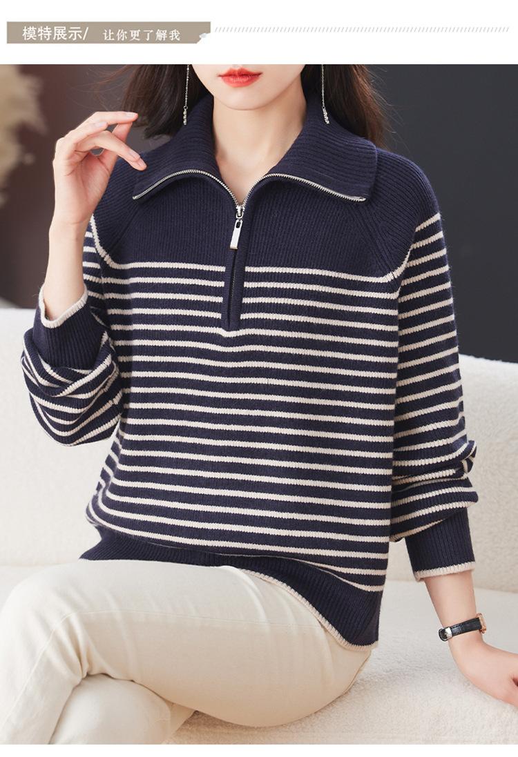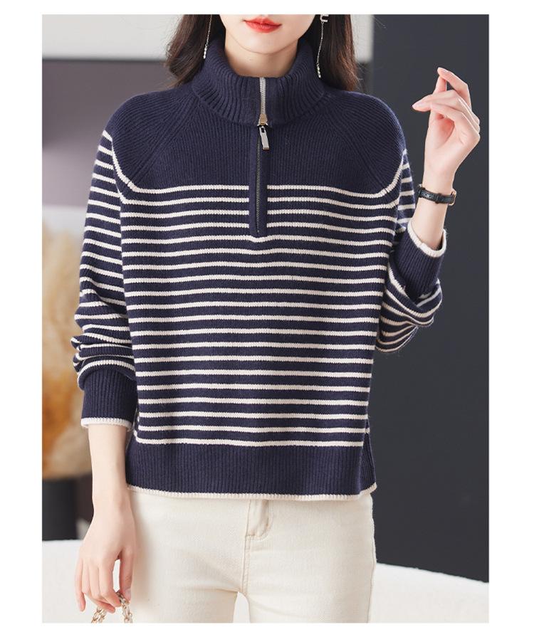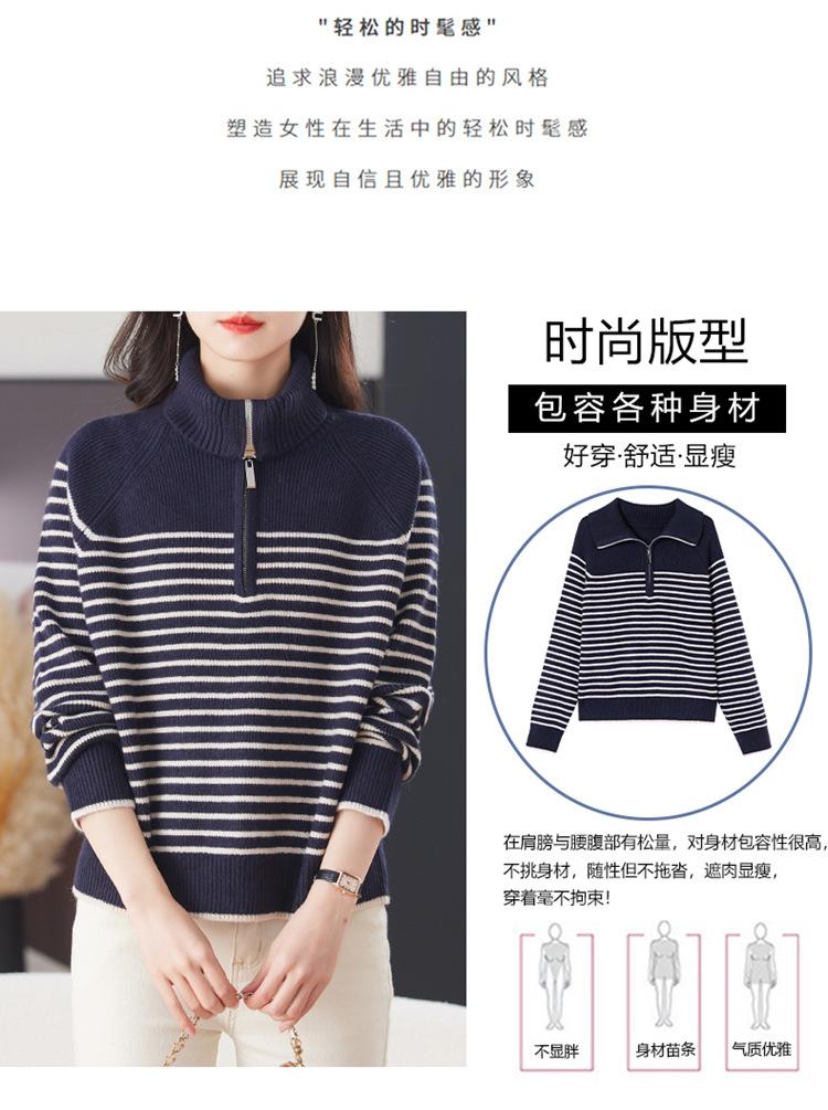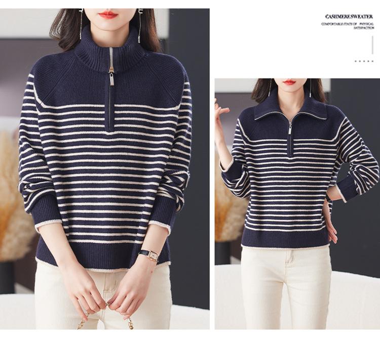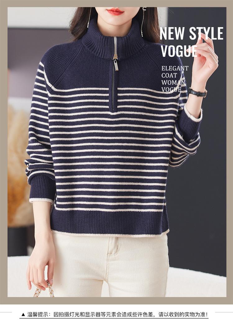 Outono/Inverno 2025 Novo Suéter Tricotado Listrado Casual Solto Feminino com Gola Alta e Meio Zíper Top de Manga Longa