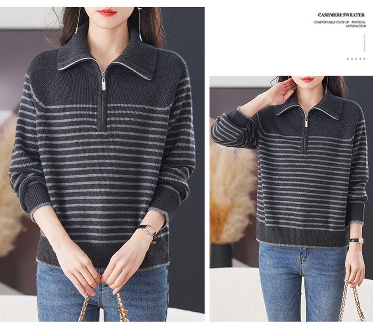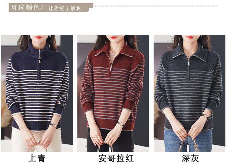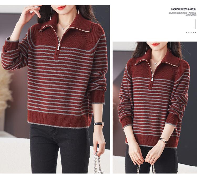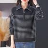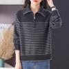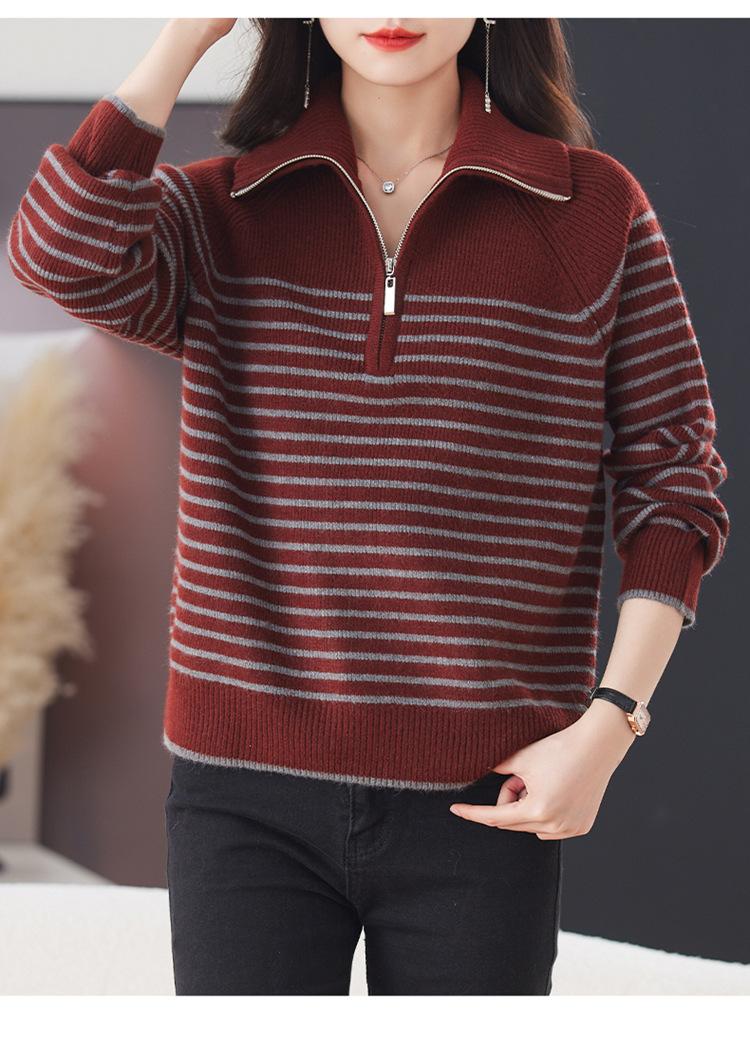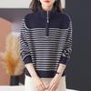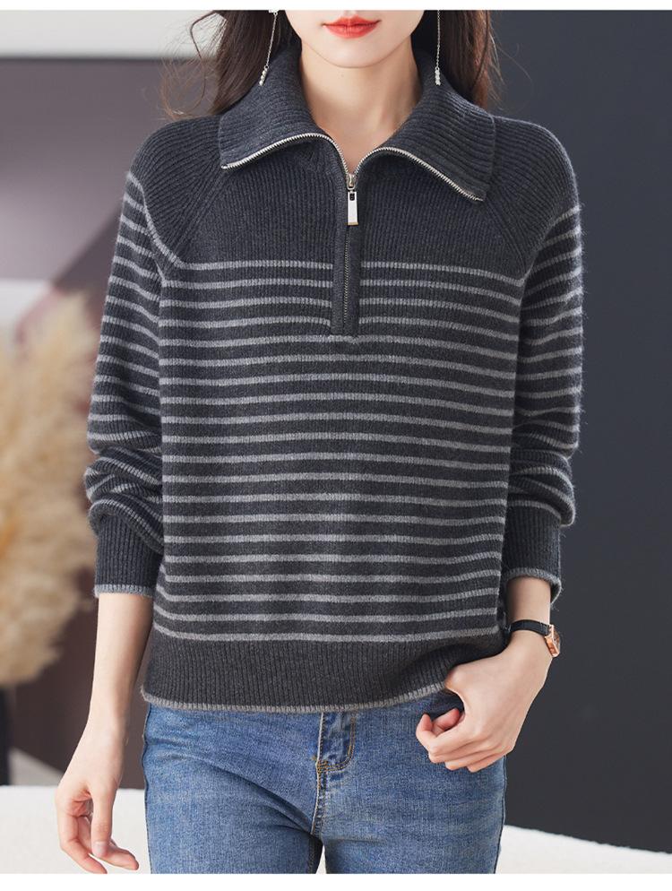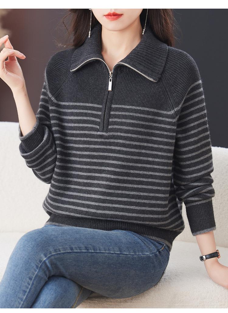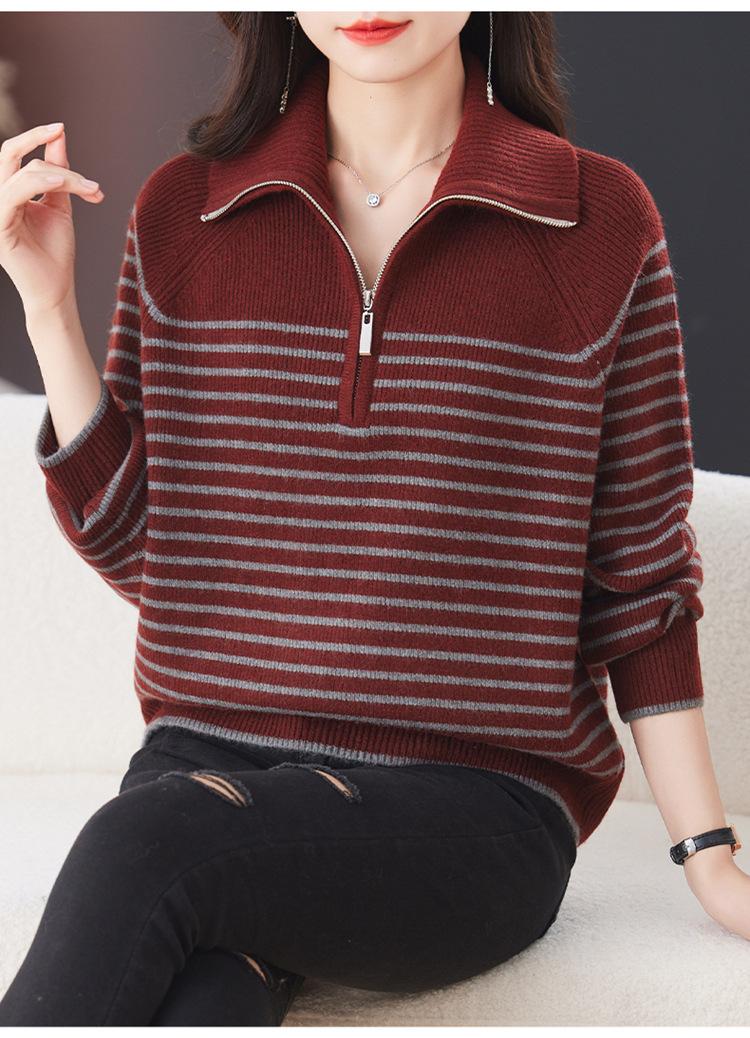 Outono/Inverno 2025 Novo Suéter Tricotado Listrado Casual Solto Feminino com Gola Alta e Meio Zíper Top de Manga Longa