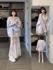 Look de Início de Outono: um Conjunto Completo de Camisas Azuis Estilosas com Renda + Saias Koreanas de Renda de Comprimento Médio em Duas Peças
