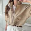 Em estoque Jaqueta curta plissada com zíper e cordão lateral estilo coreano ins para proteção solar feminina design moderno versátil top