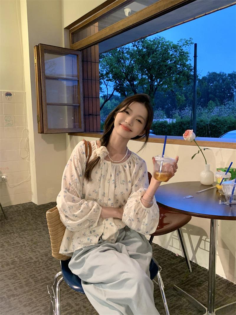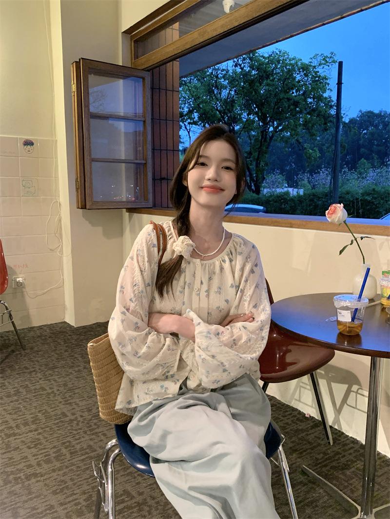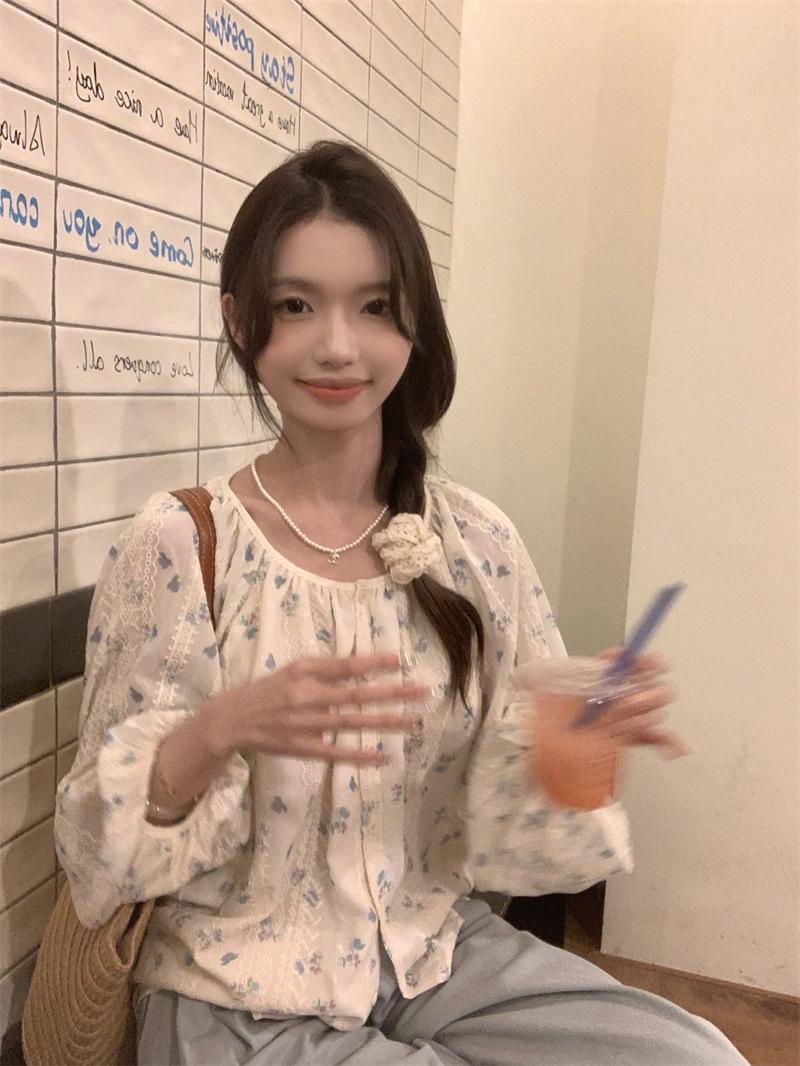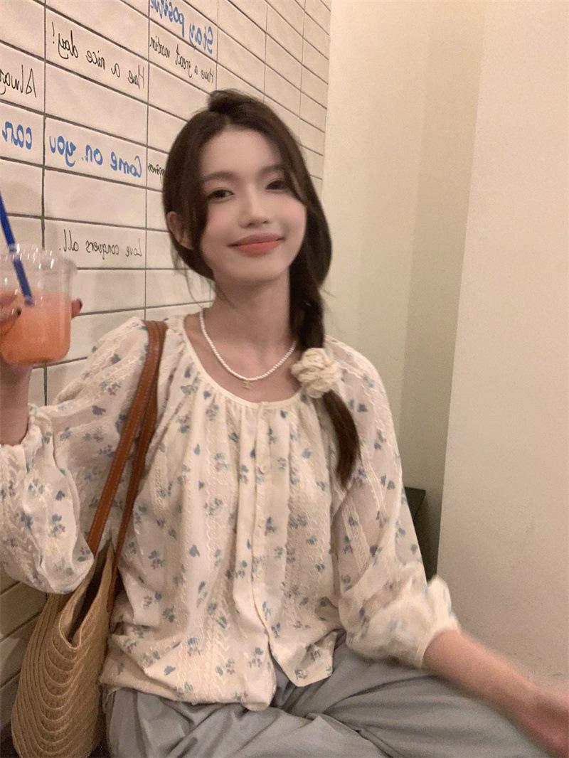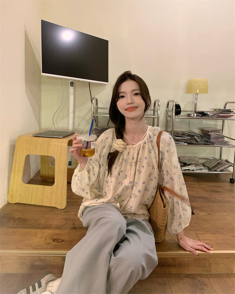 Camisa Floral de Manga Comprida Estilo Fresco Feminina Início da Primavera Nova Solta Emagrecimento Gola Redonda Design Doce Versátil Camisa de Chiffon