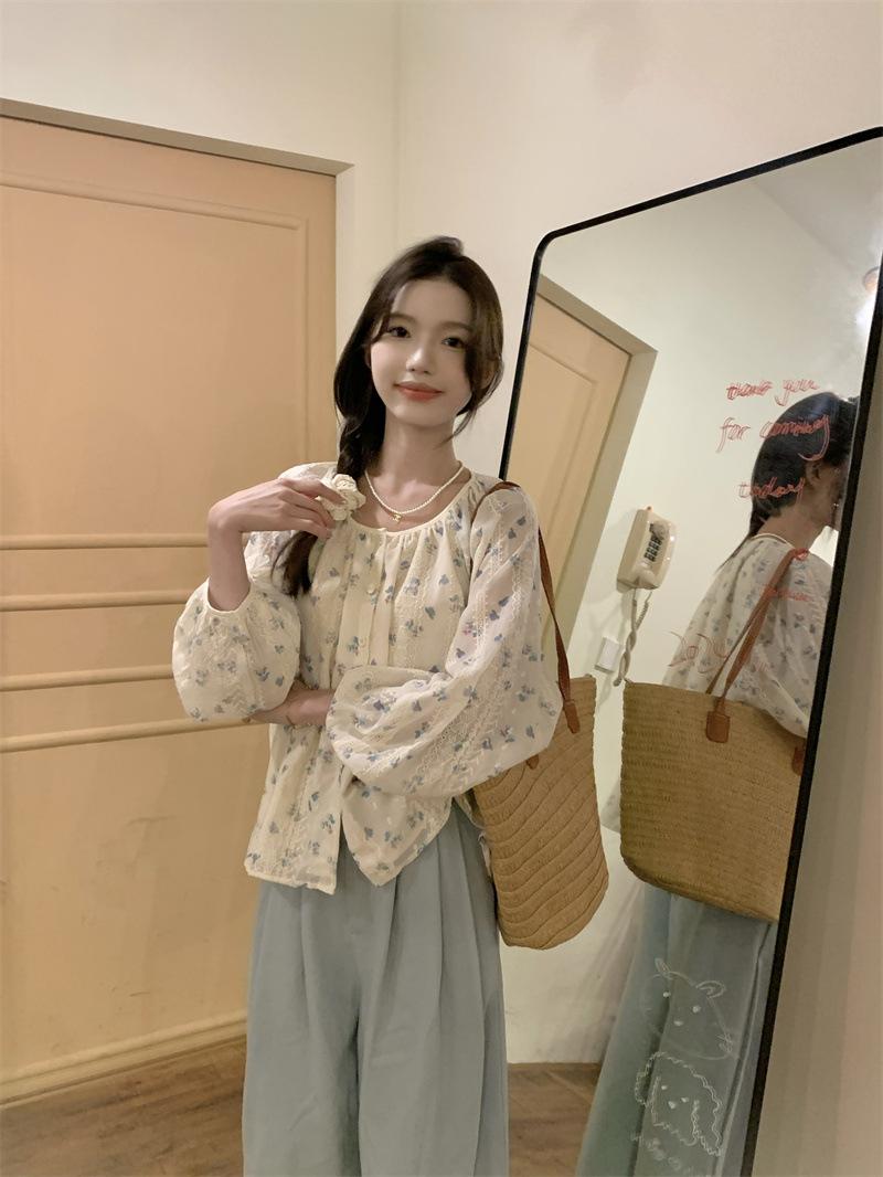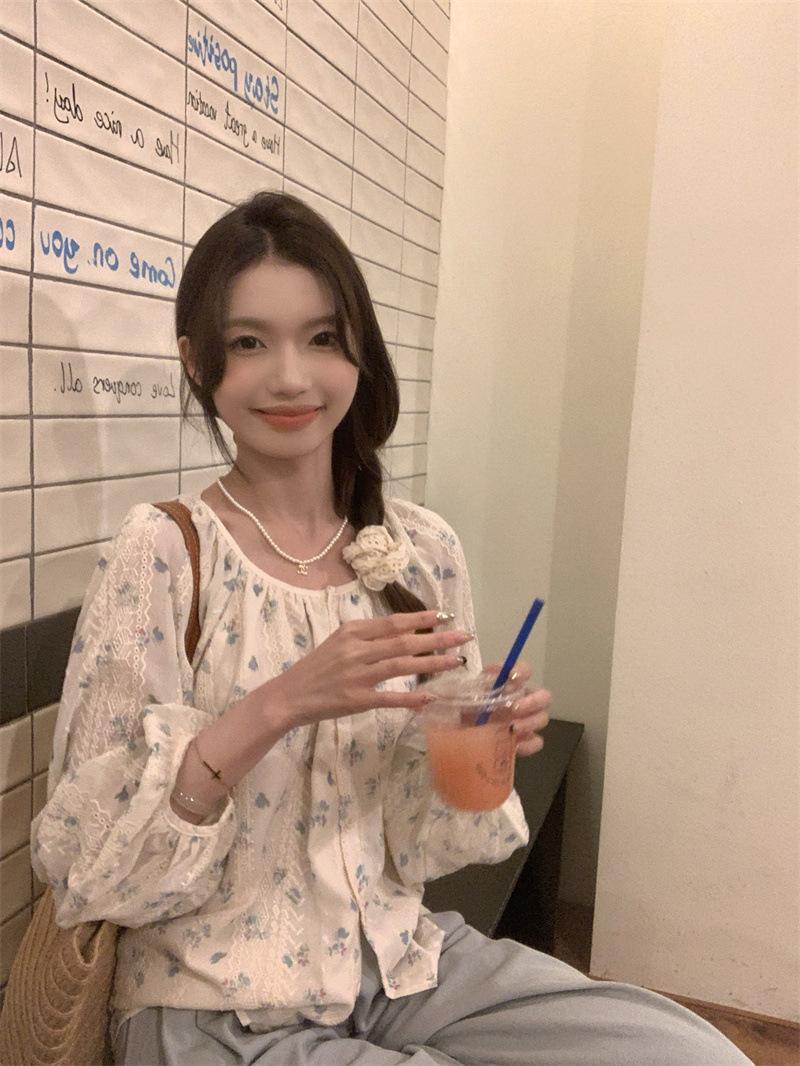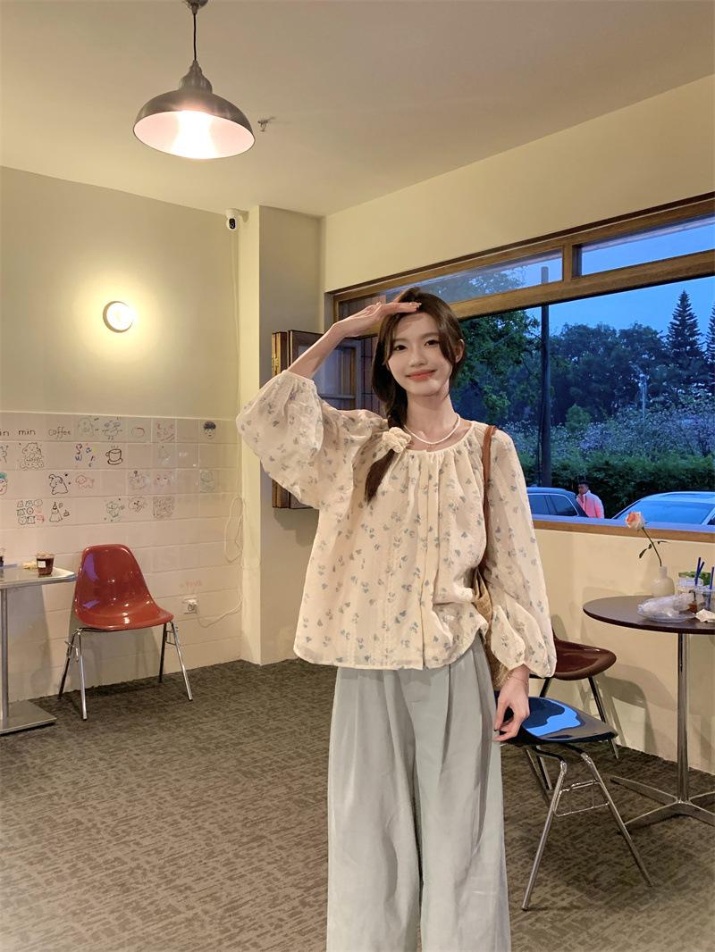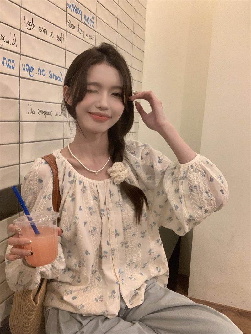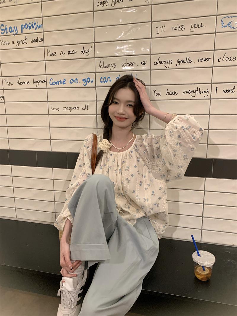 Camisa Floral de Manga Comprida Estilo Fresco Feminina Início da Primavera Nova Solta Emagrecimento Gola Redonda Design Doce Versátil Camisa de Chiffon