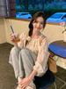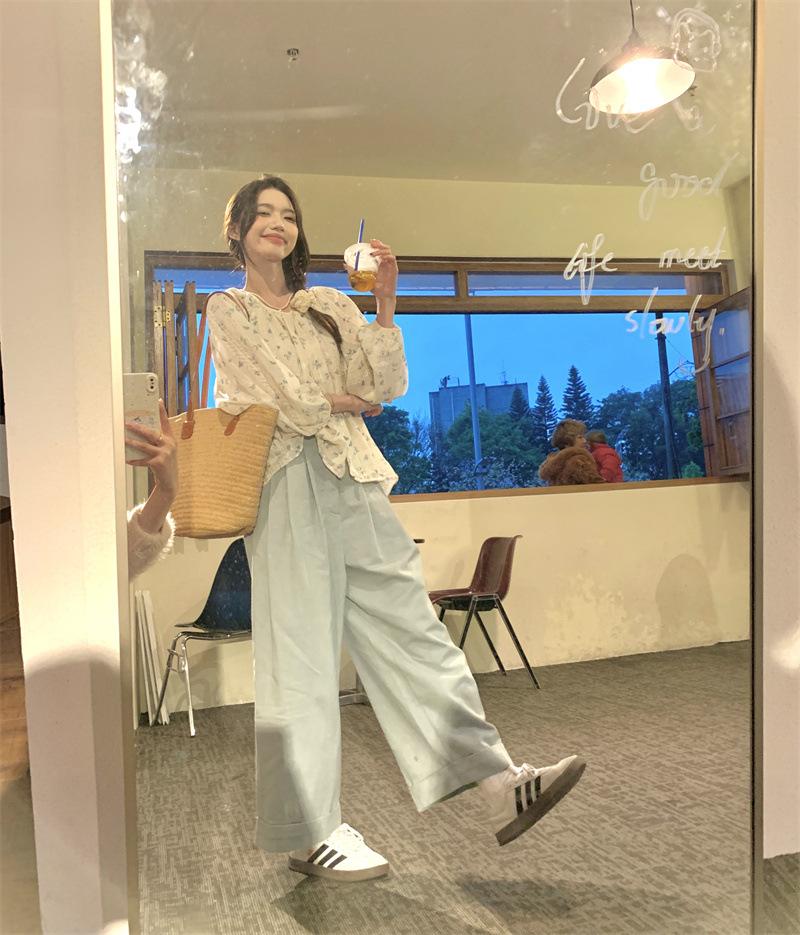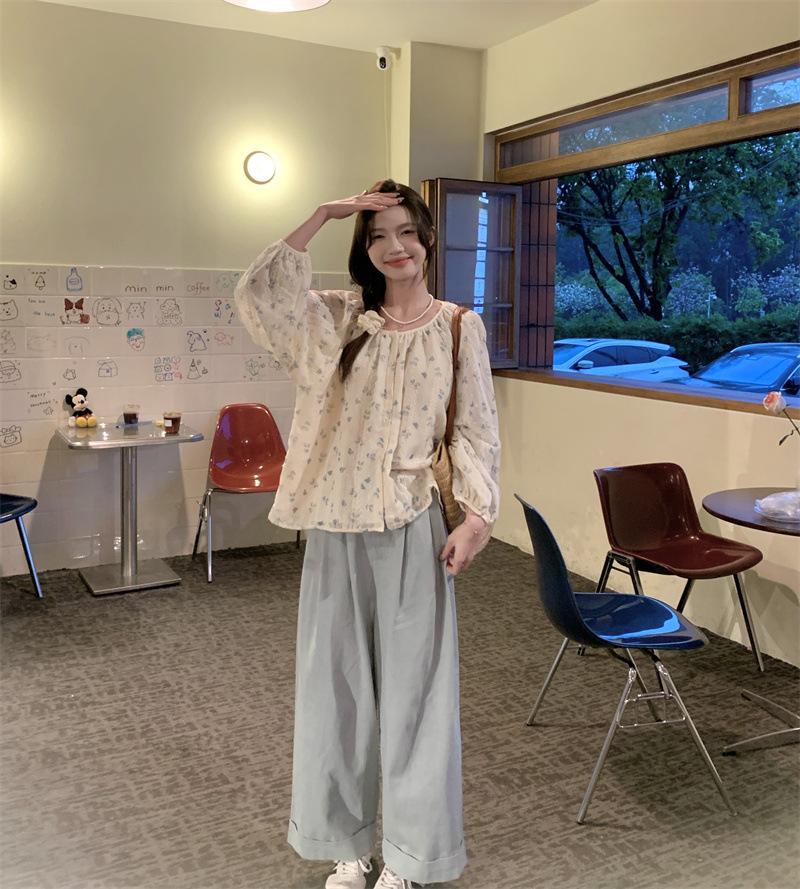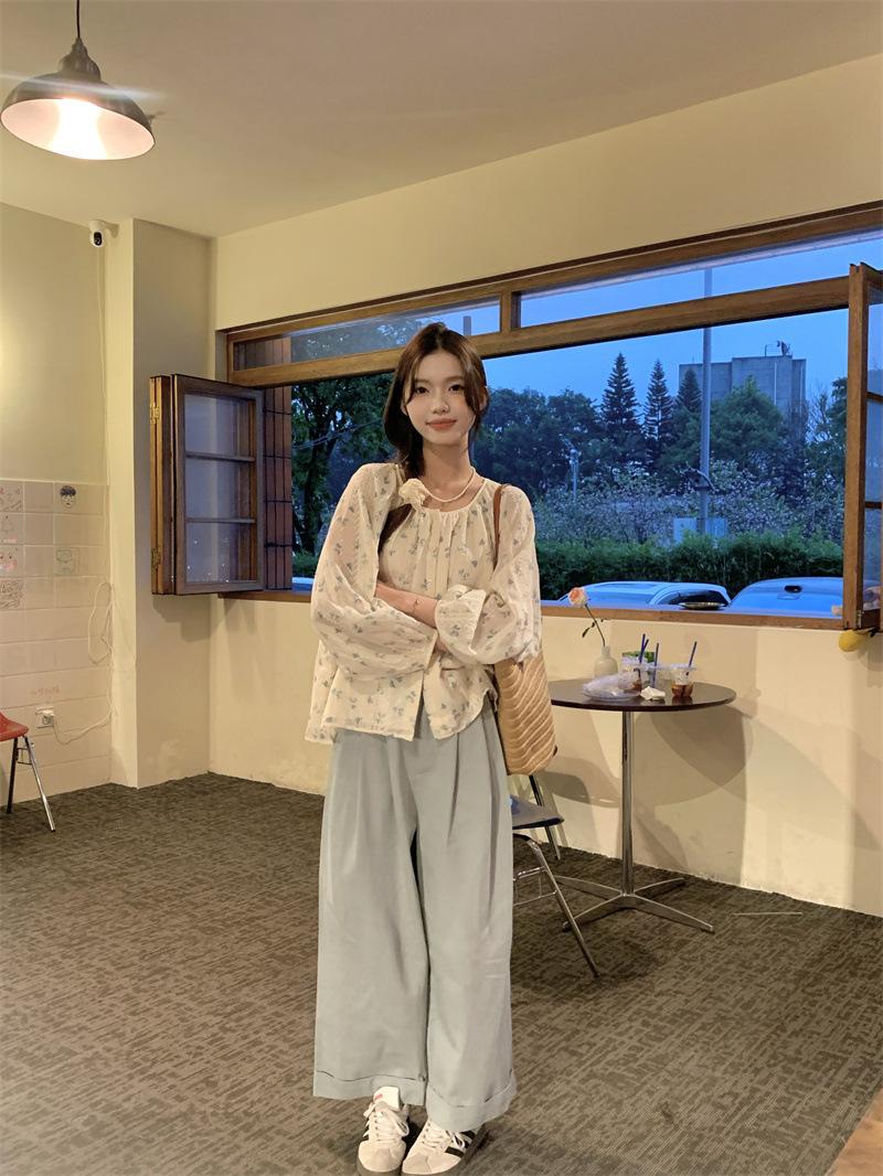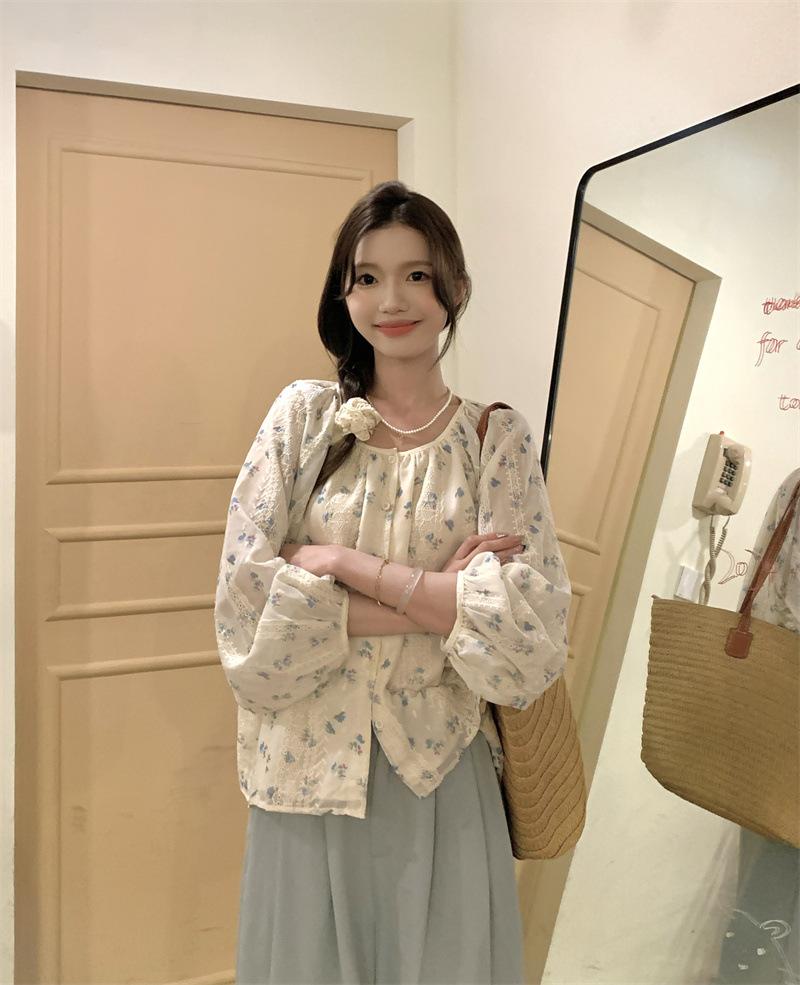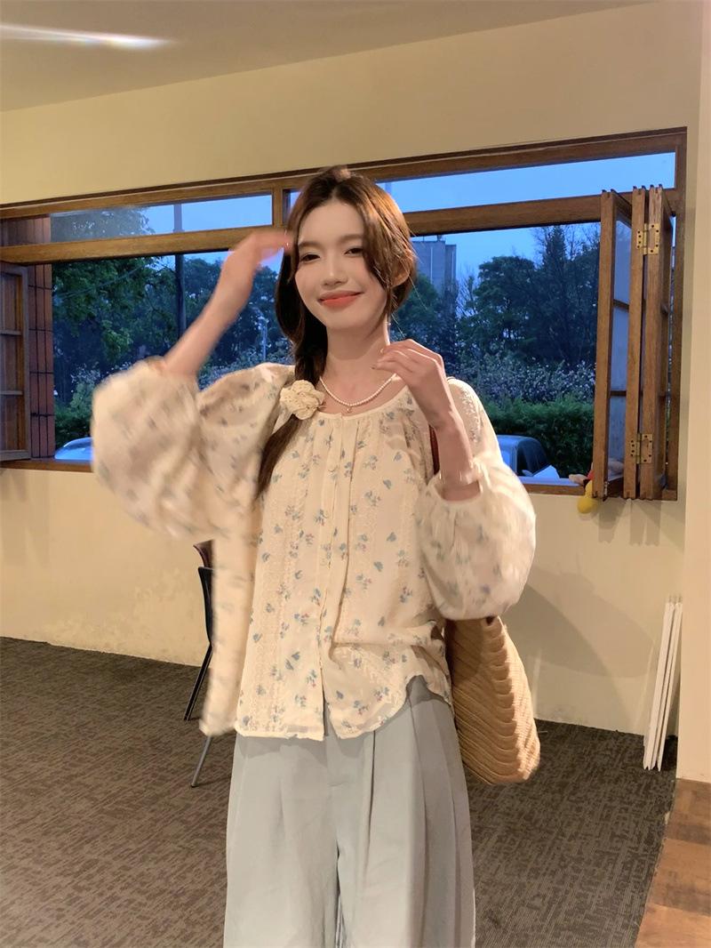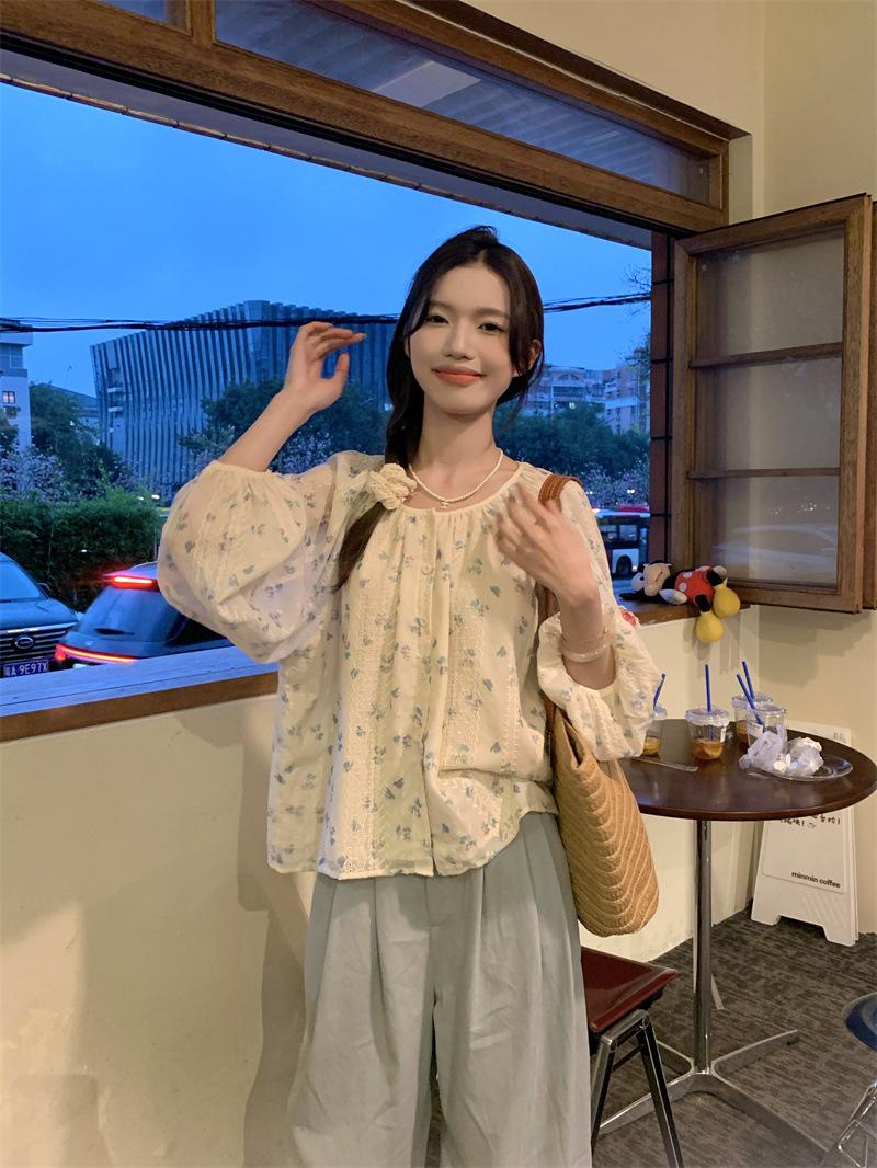 Camisa Floral de Manga Comprida Estilo Fresco Feminina Início da Primavera Nova Solta Emagrecimento Gola Redonda Design Doce Versátil Camisa de Chiffon