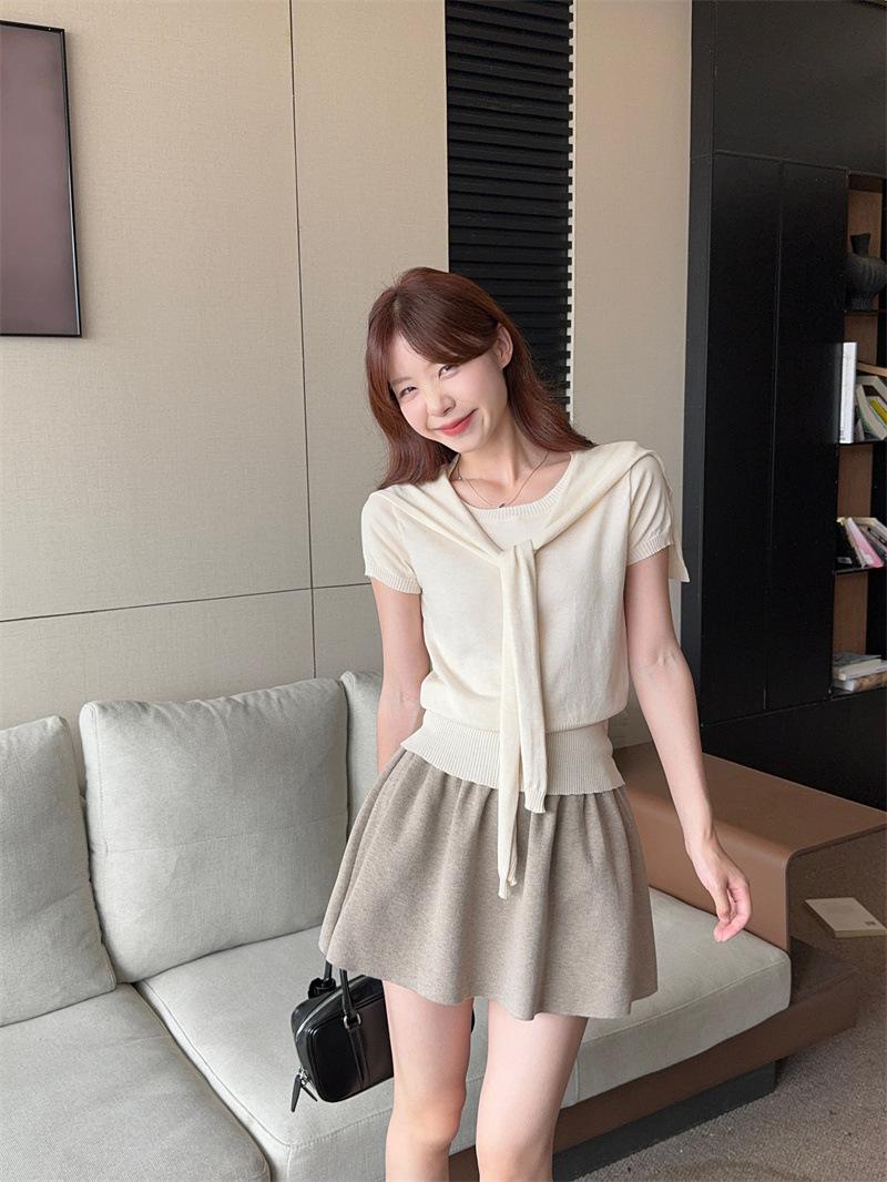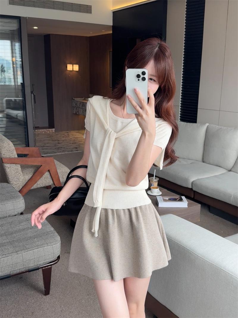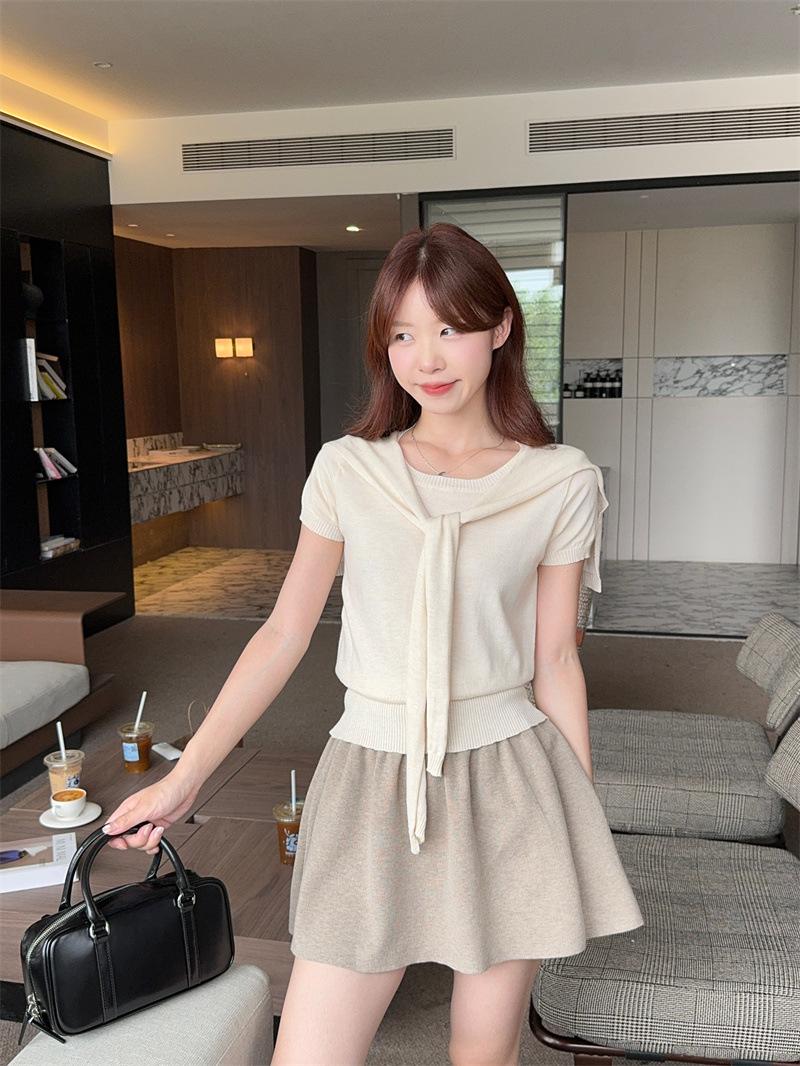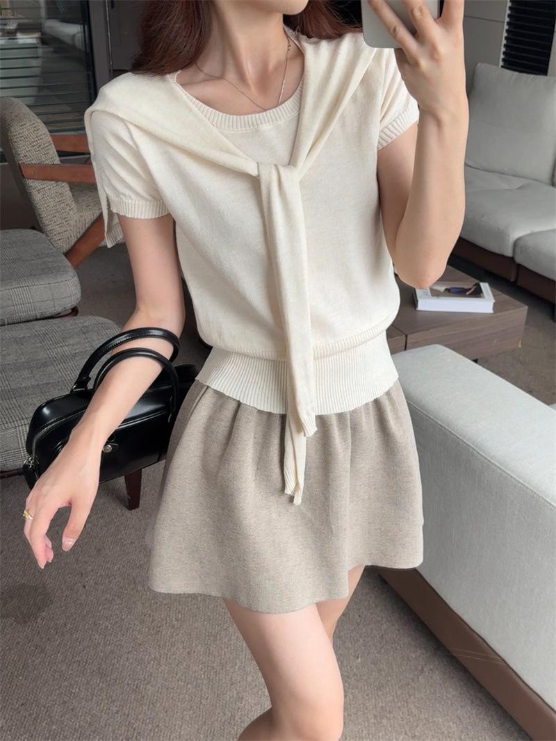Camiseta de manga curta estilo universitário com xale falso de duas peças para mulheres, verão 2025, novo estilo, cor sólida, temperamento que define a cintura, top de malha