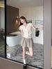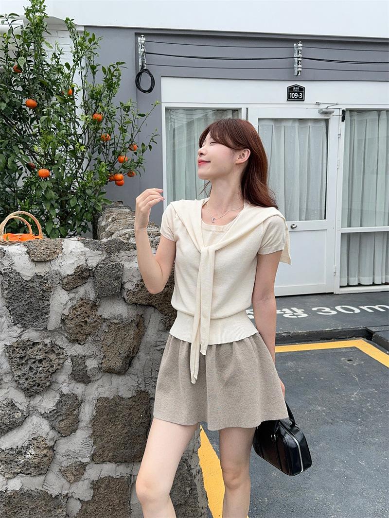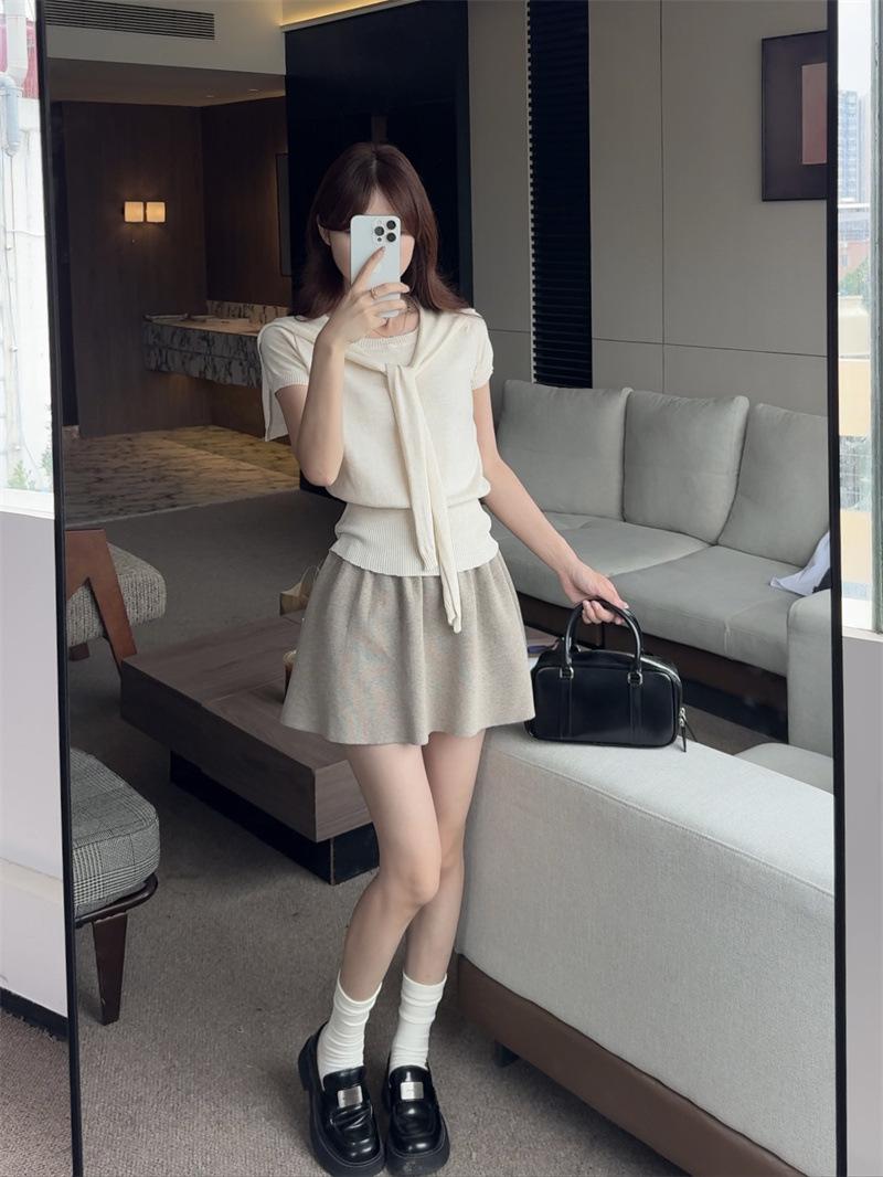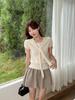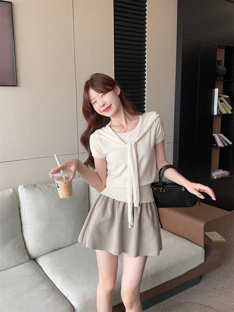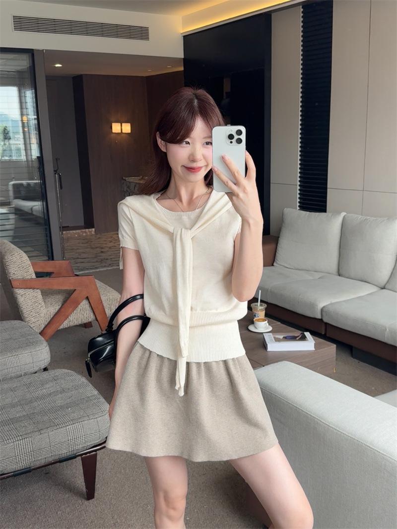 Camiseta de manga curta estilo universitário com xale falso de duas peças para mulheres, verão 2025, novo estilo, cor sólida, temperamento que define a cintura, top de malha
