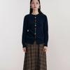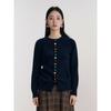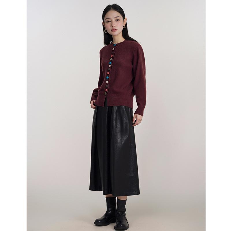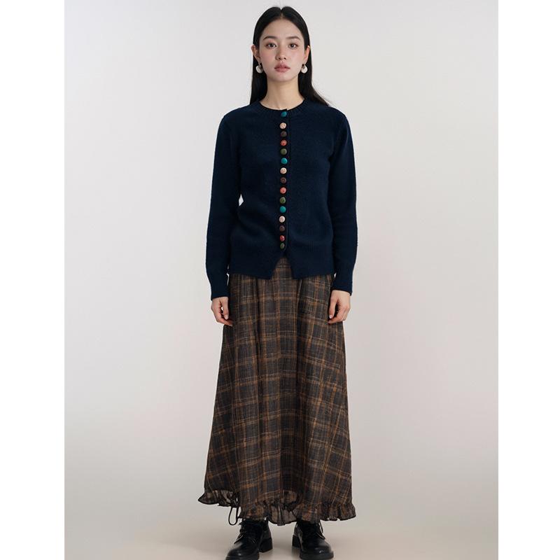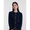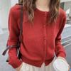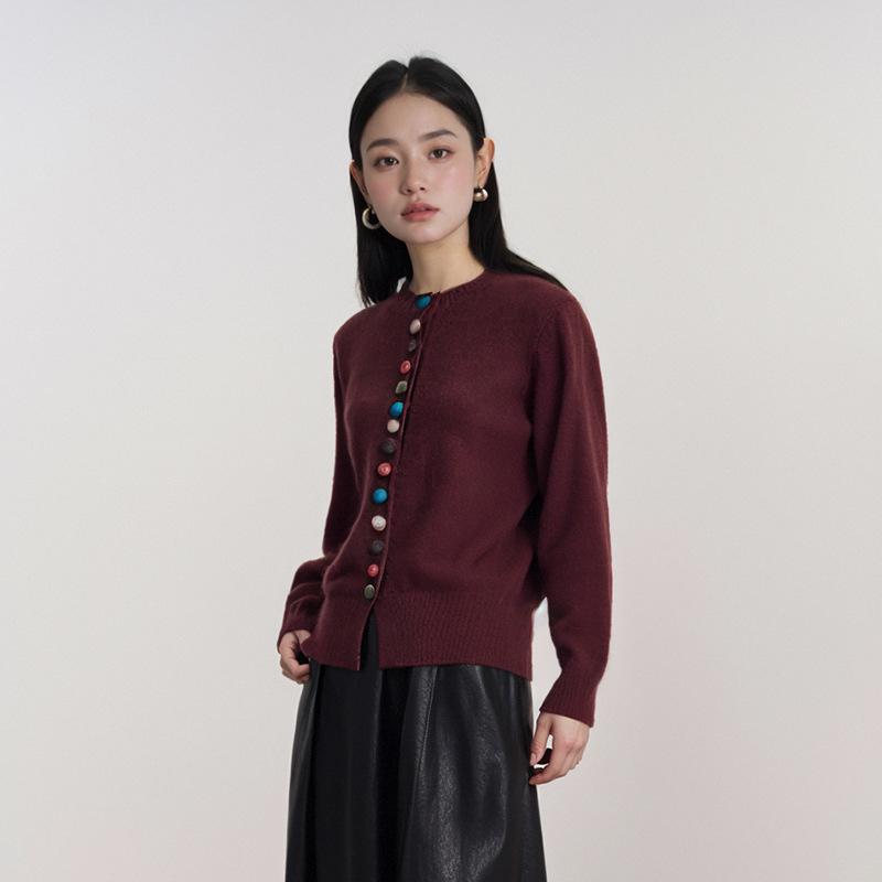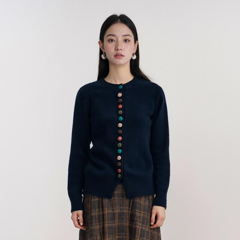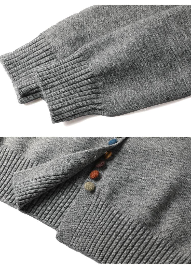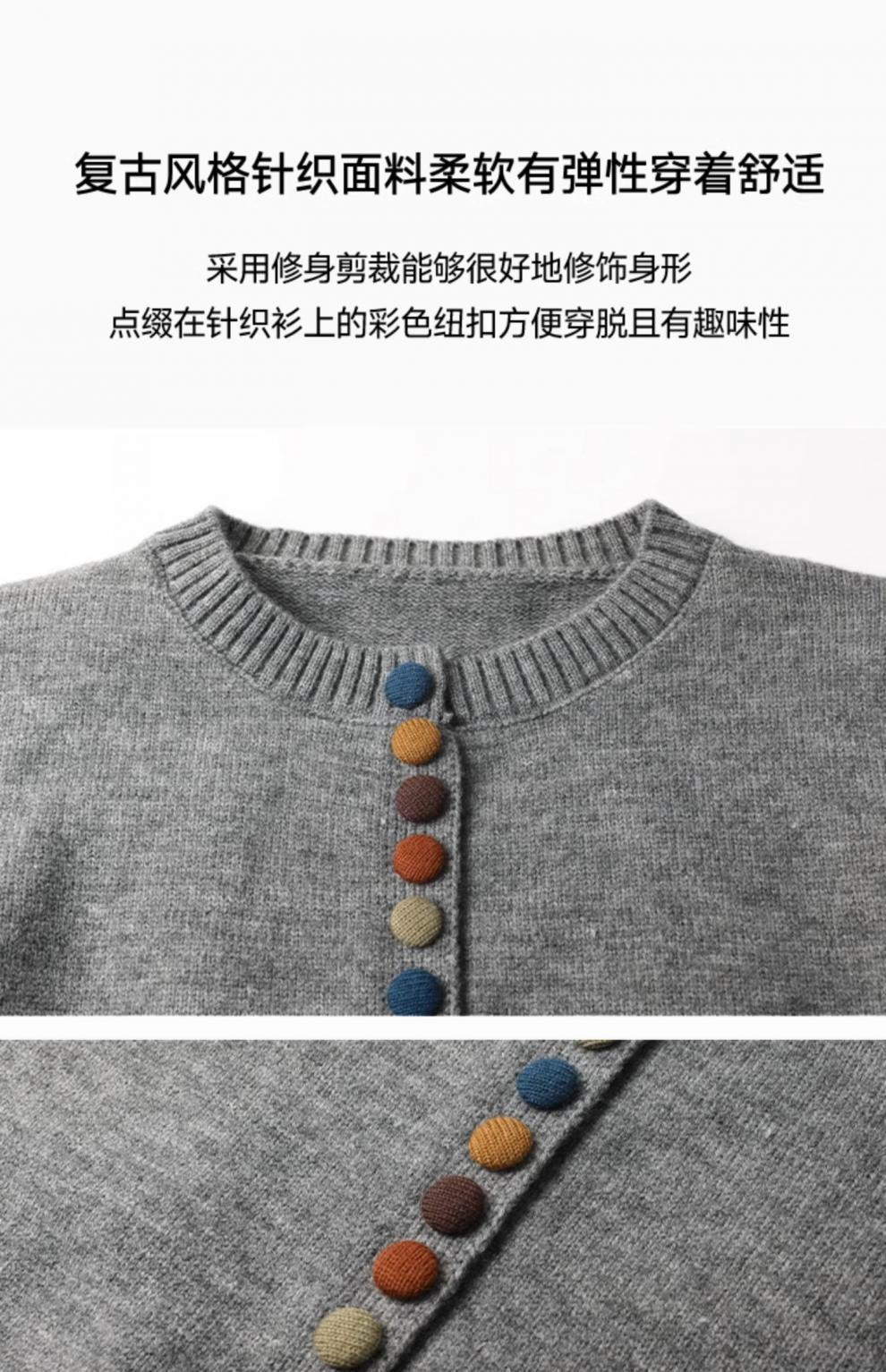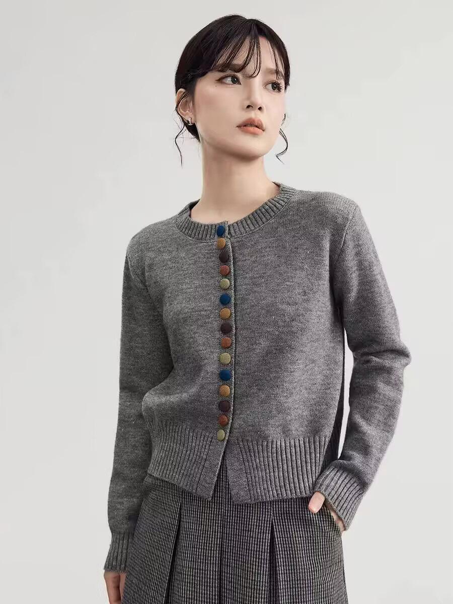 Casaco Cardigan Cinza de Gola Redonda com Botões Coloridos para Mulheres Outono e Inverno Solto Roupa Exterior Único e Bonito Top Tricotado