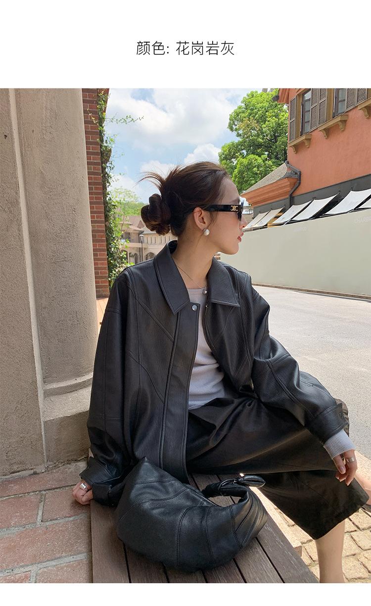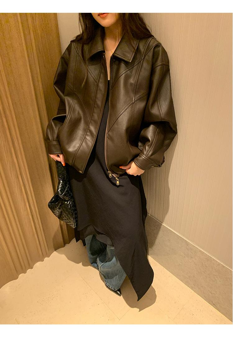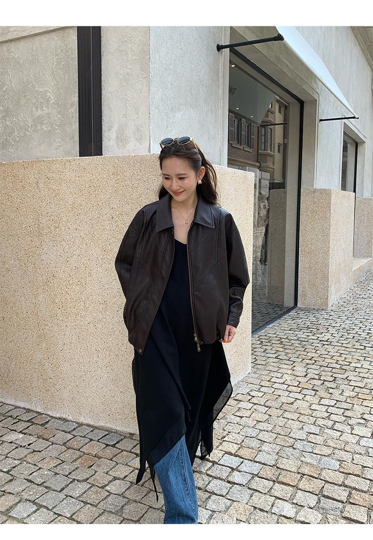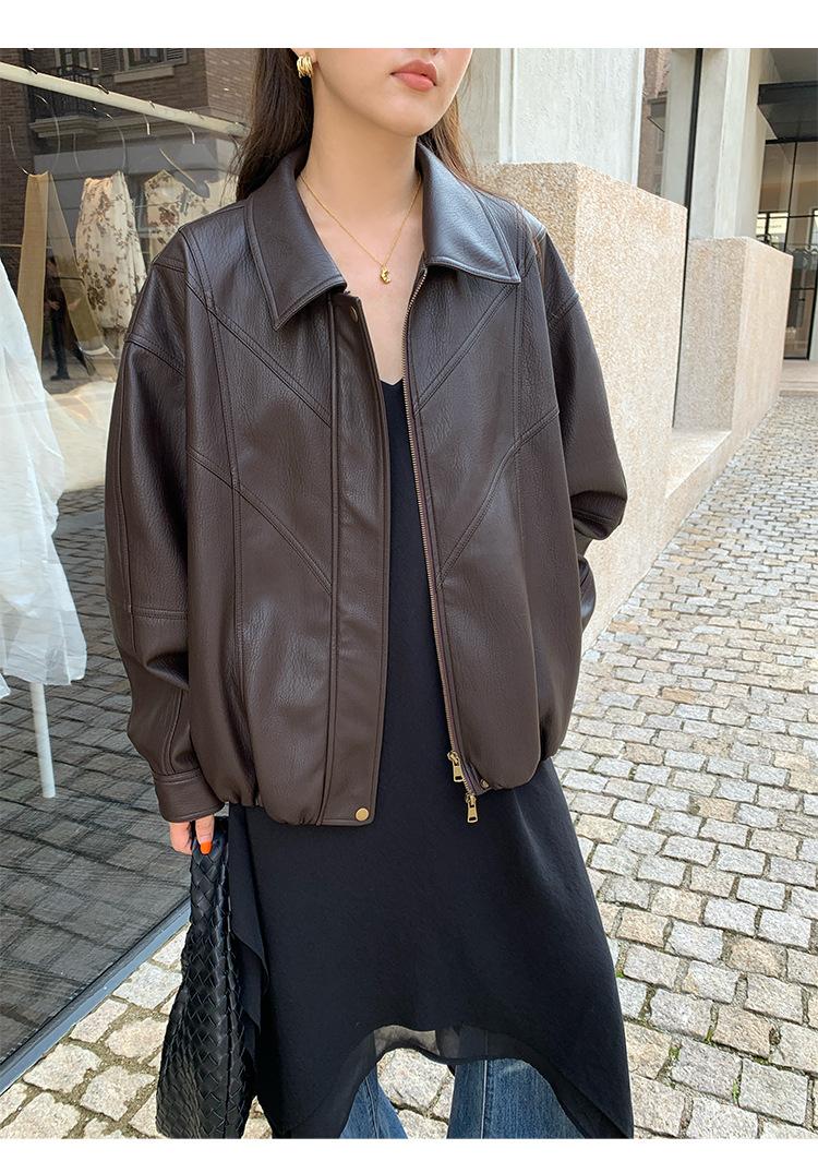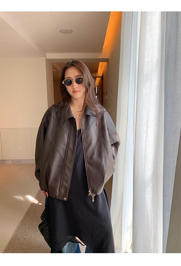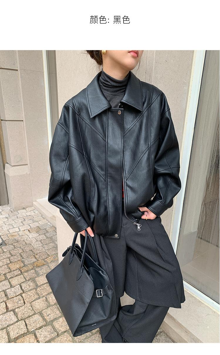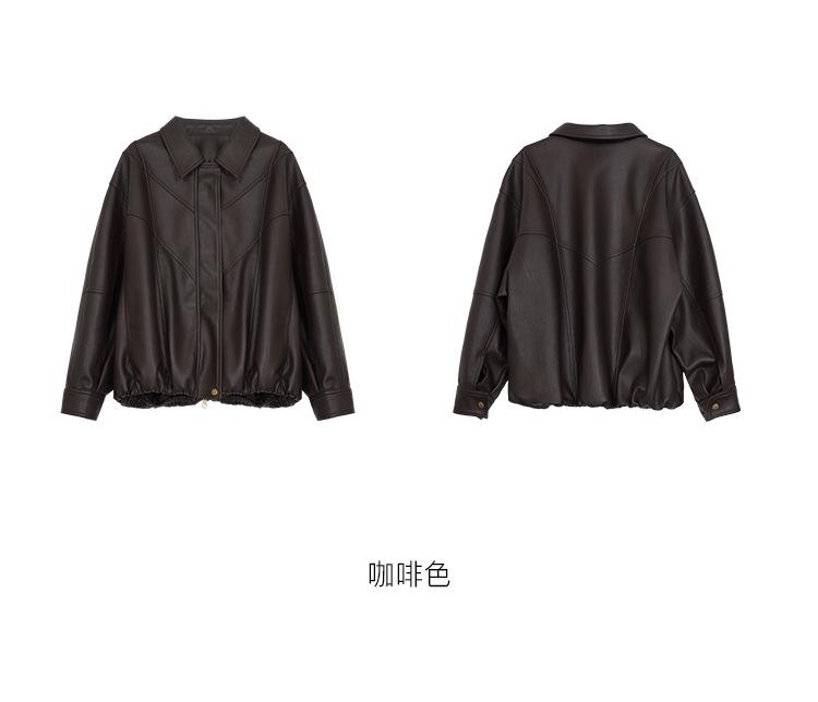 Jaqueta de Couro Motocicleta Retrô Wanwei Feminina 2025 Outono Novo Lapela Bainha Elástica PU Jaqueta de Couro Casaco P3724