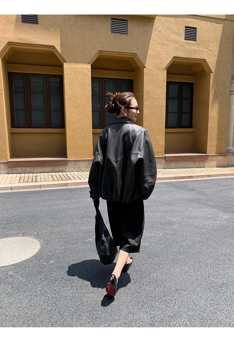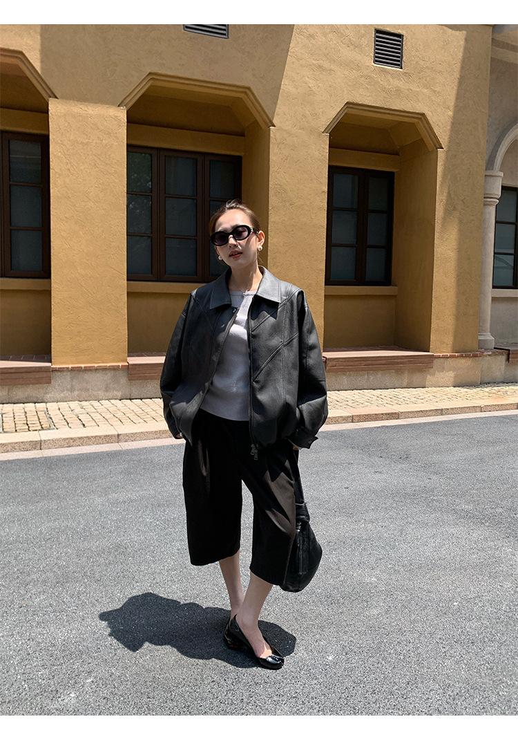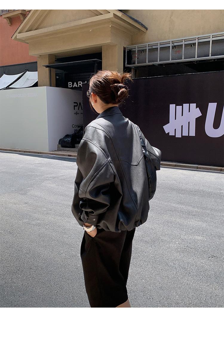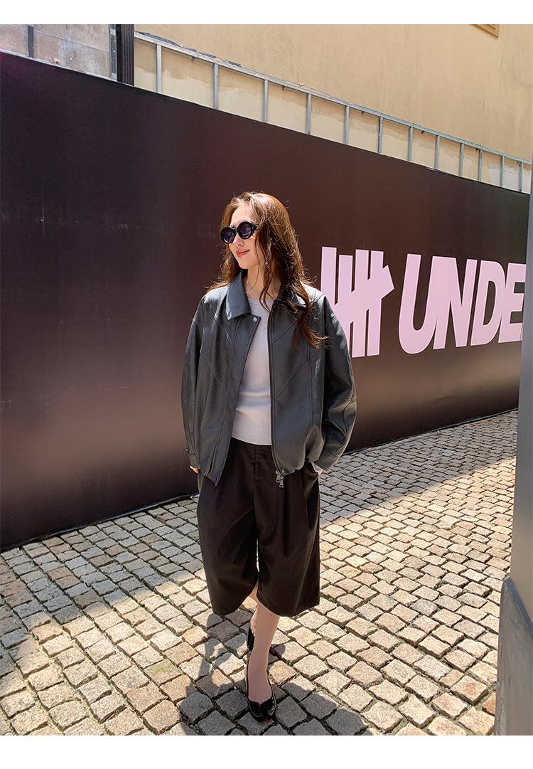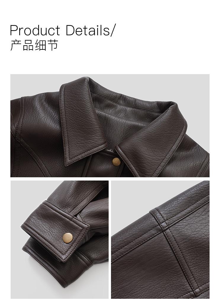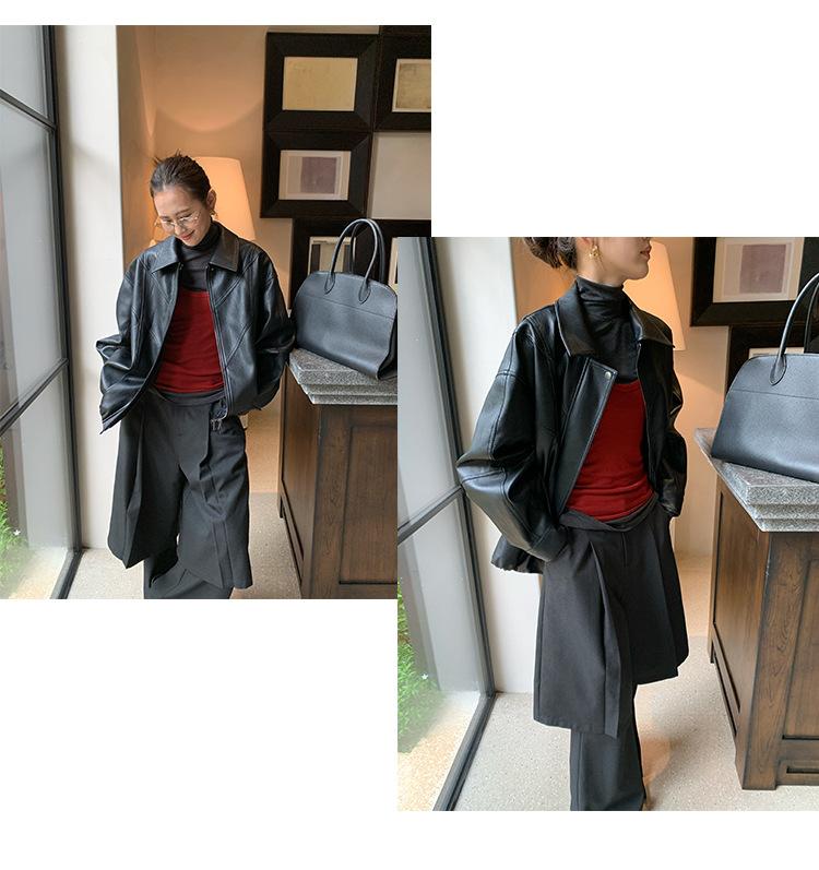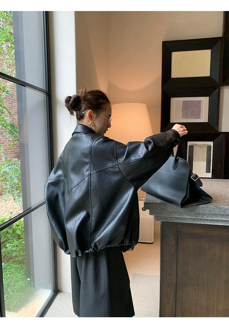 Jaqueta de Couro Motocicleta Retrô Wanwei Feminina 2025 Outono Novo Lapela Bainha Elástica PU Jaqueta de Couro Casaco P3724