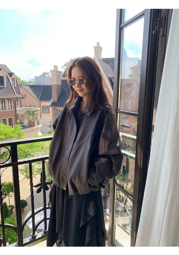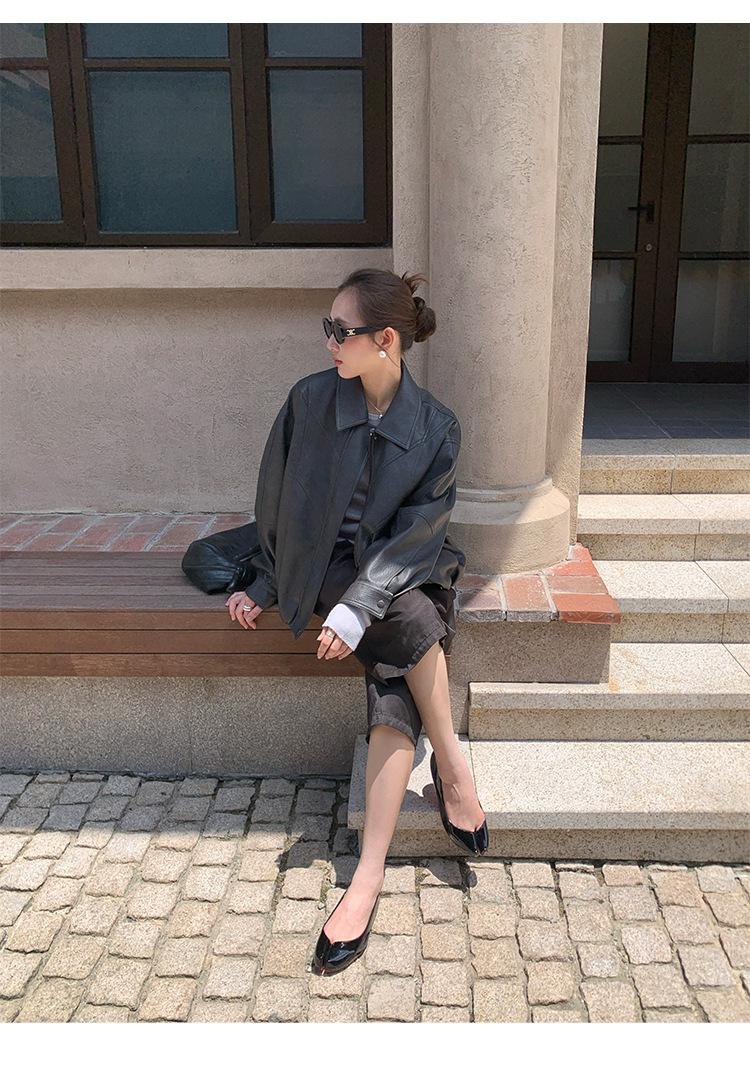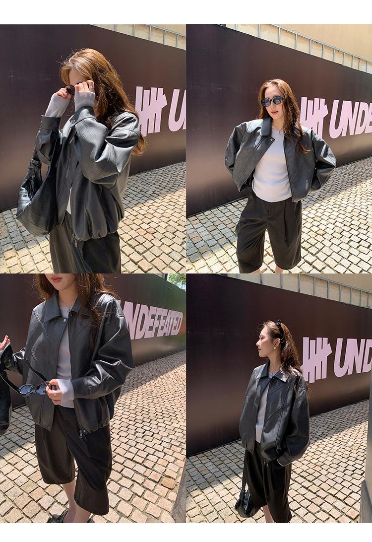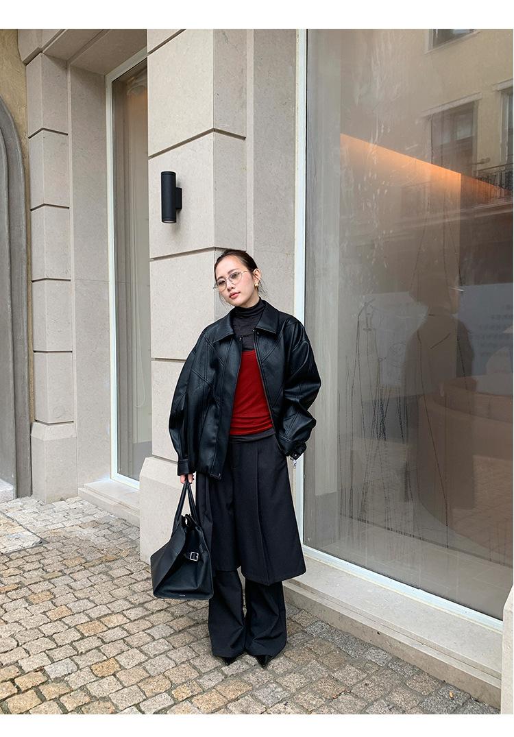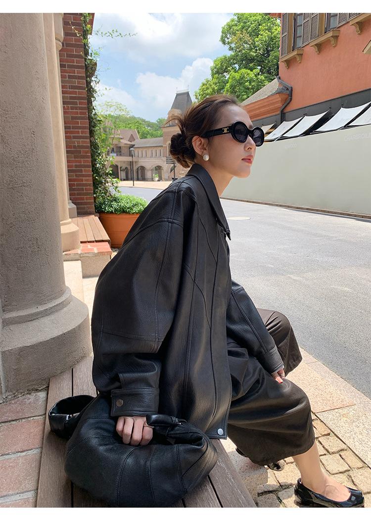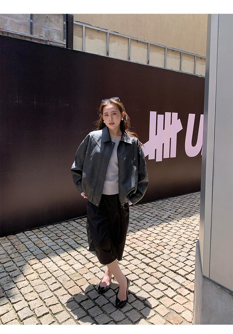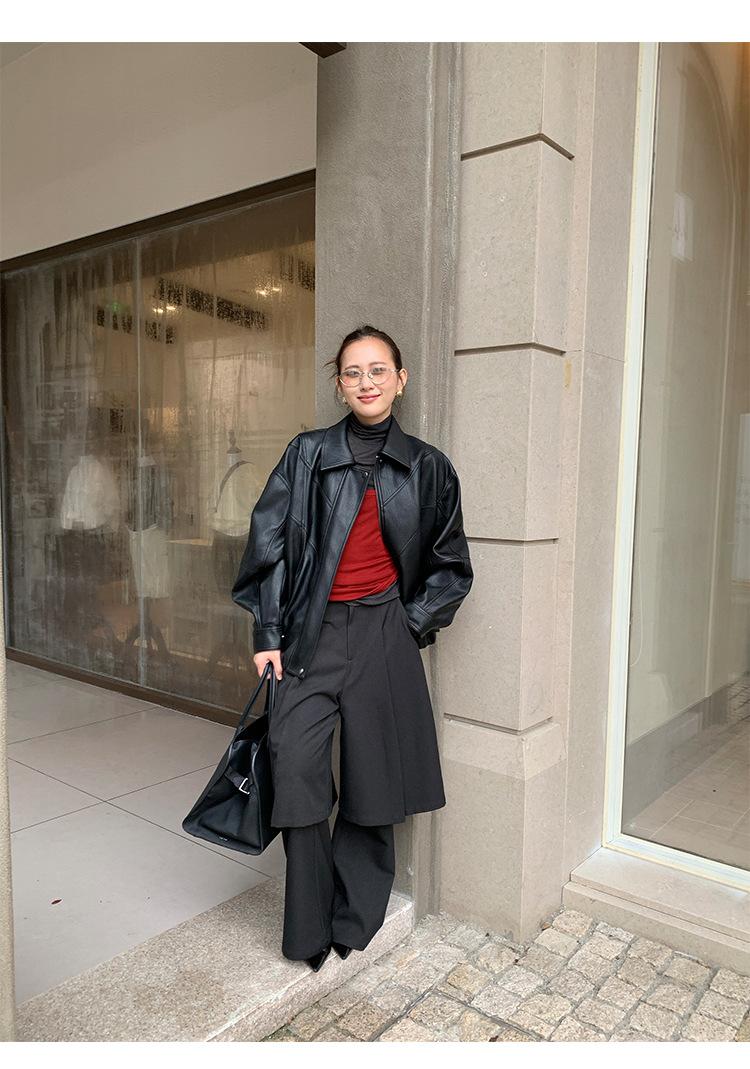 Jaqueta de Couro Motocicleta Retrô Wanwei Feminina 2025 Outono Novo Lapela Bainha Elástica PU Jaqueta de Couro Casaco P3724