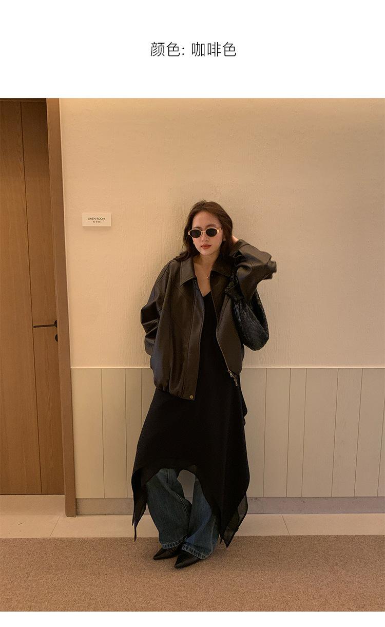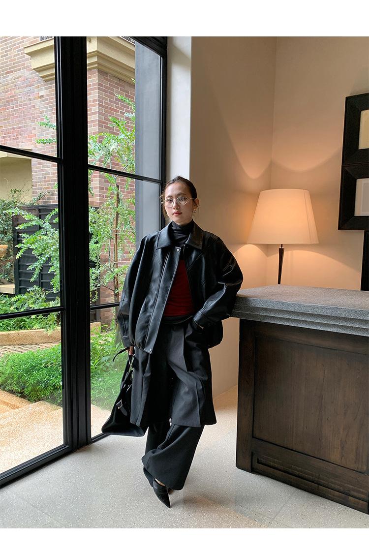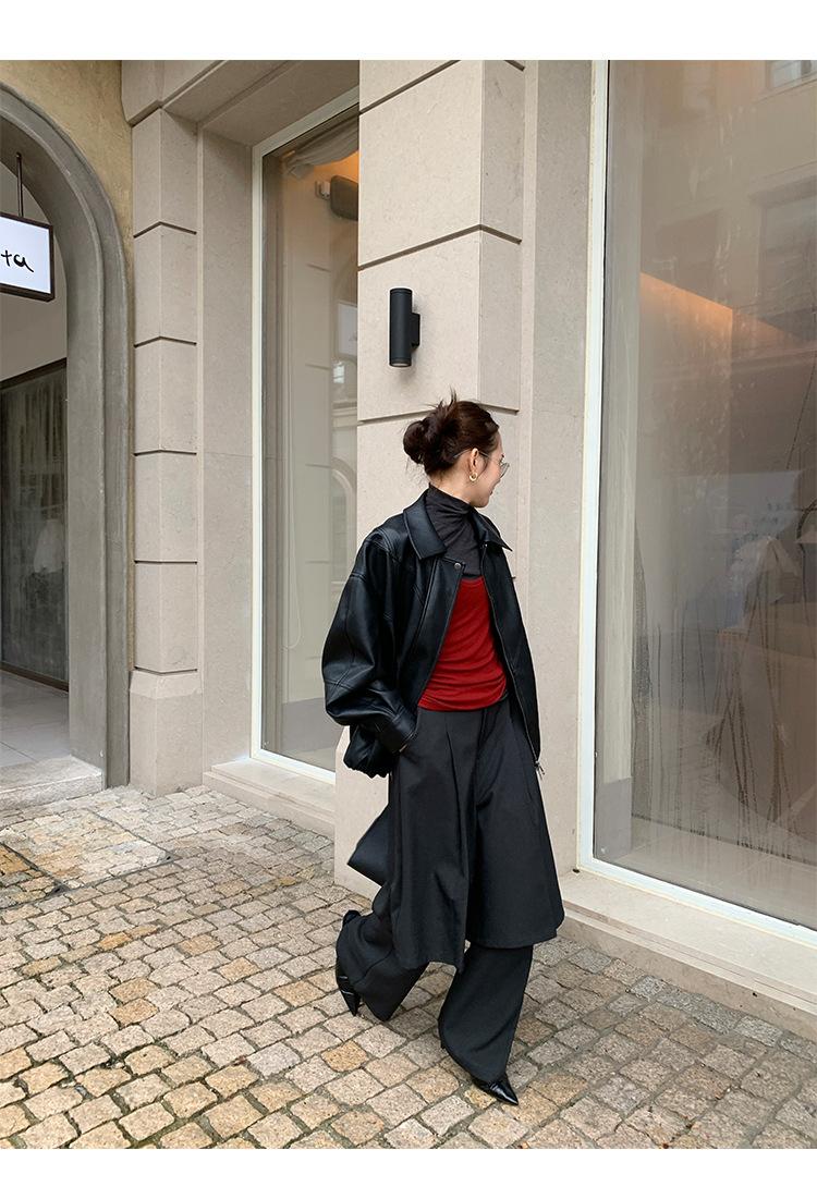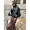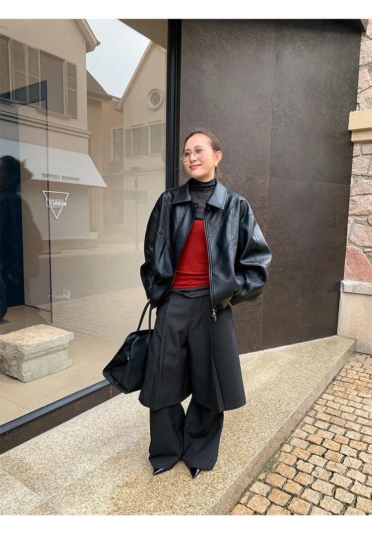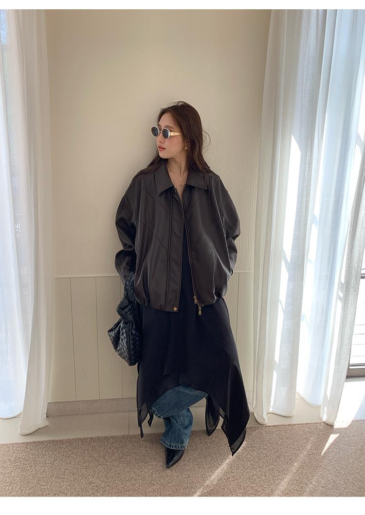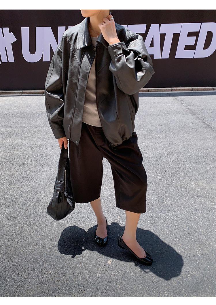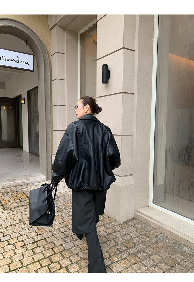 Jaqueta de Couro Motocicleta Retrô Wanwei Feminina 2025 Outono Novo Lapela Bainha Elástica PU Jaqueta de Couro Casaco P3724