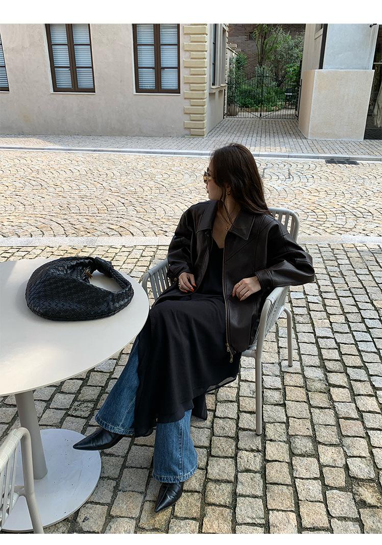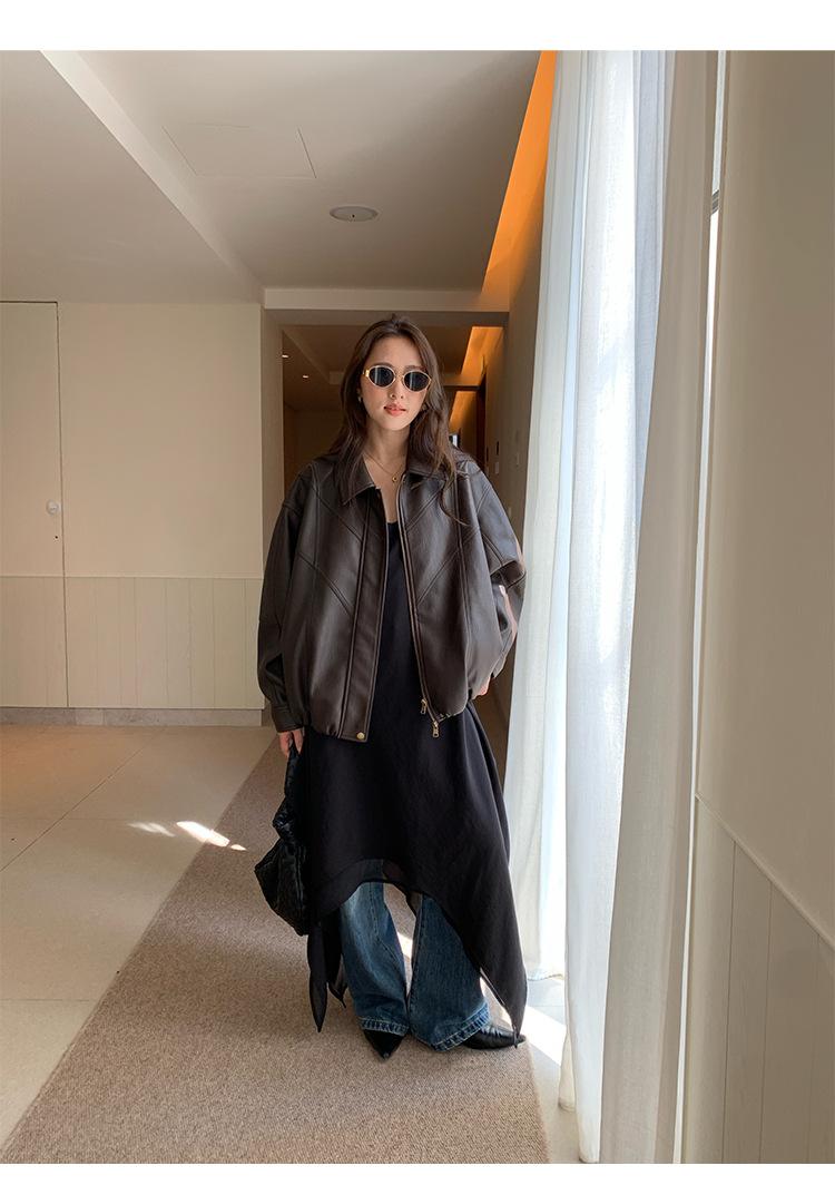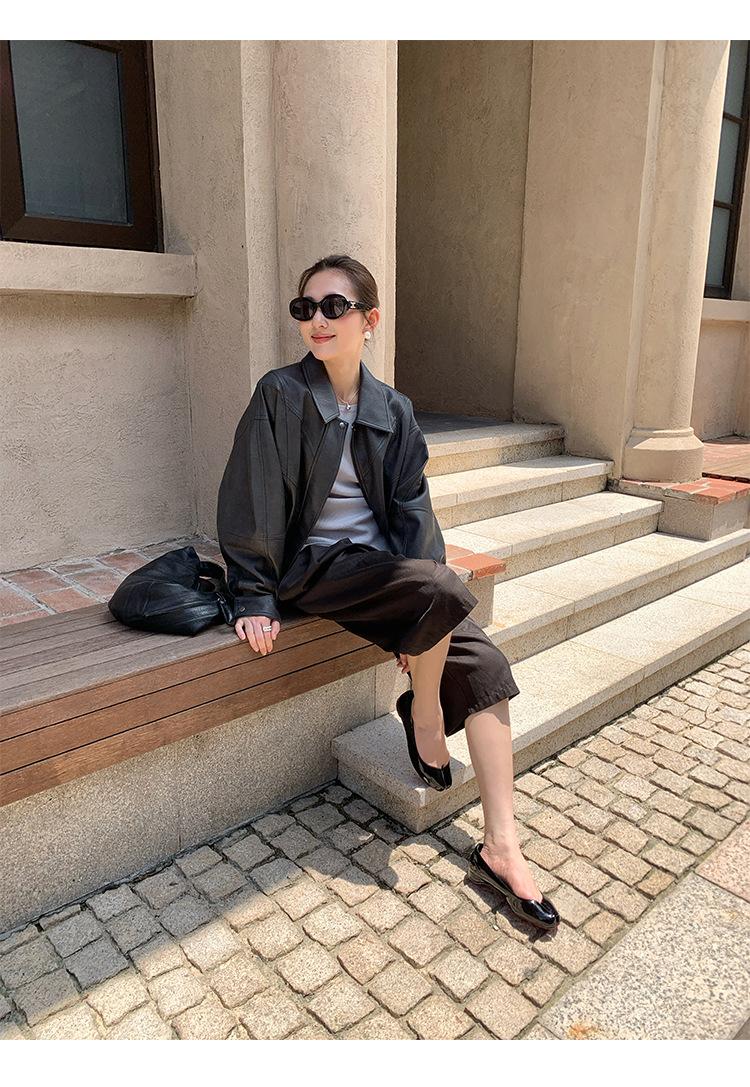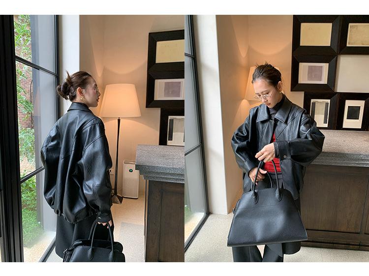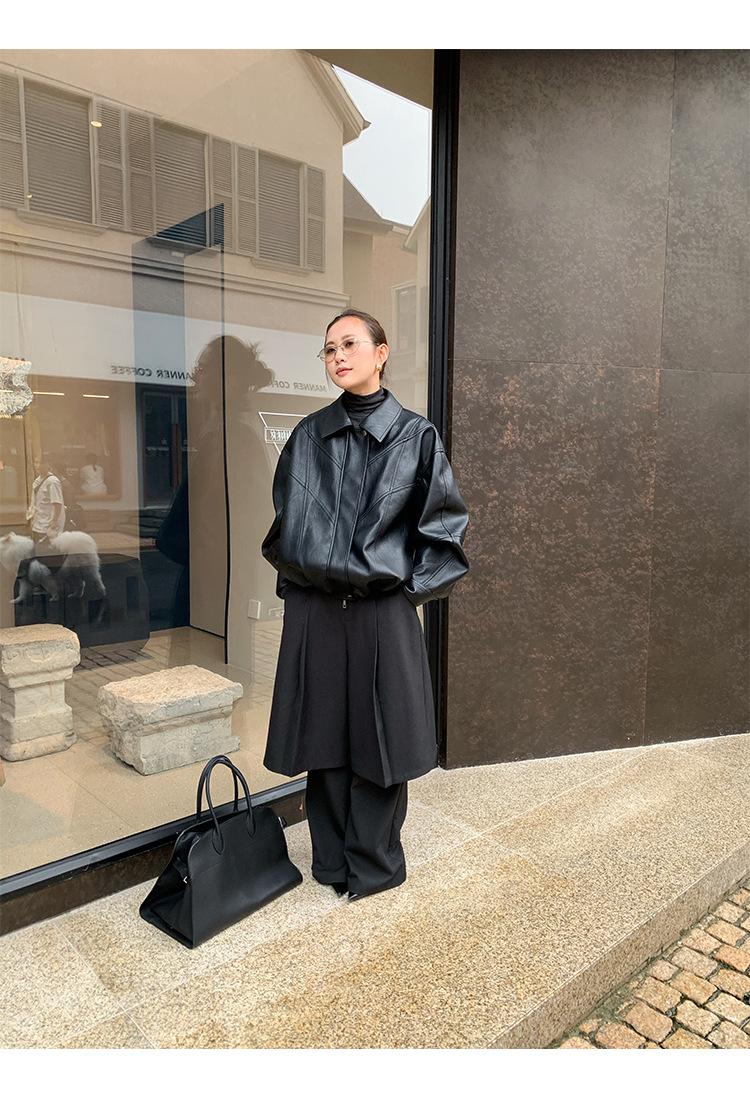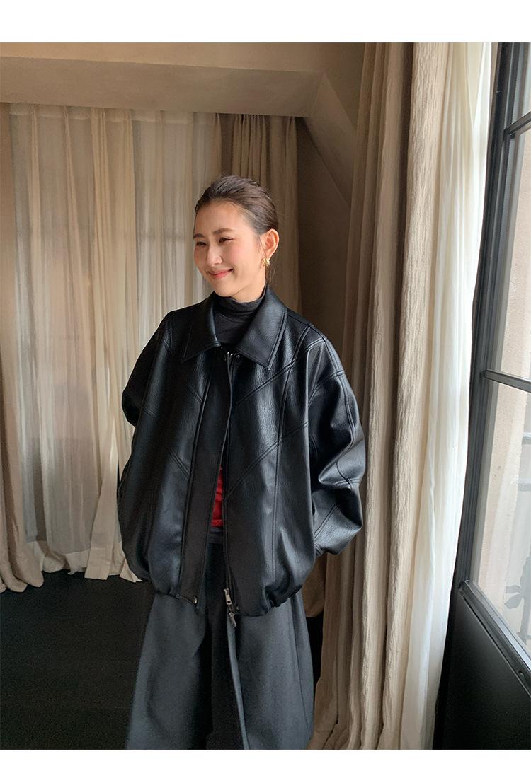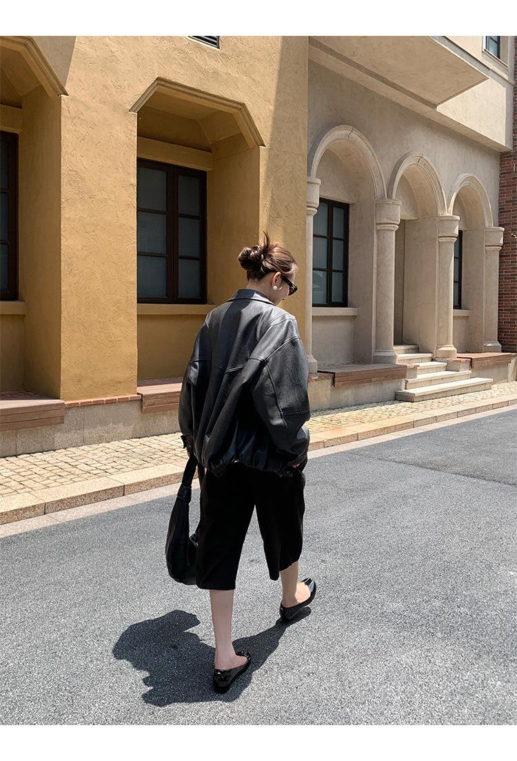 Jaqueta de Couro Motocicleta Retrô Wanwei Feminina 2025 Outono Novo Lapela Bainha Elástica PU Jaqueta de Couro Casaco P3724